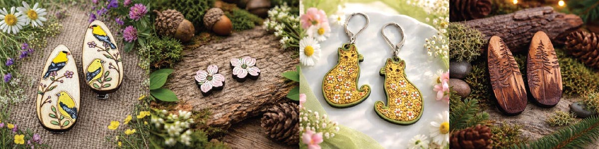 Wooden Mushroom Earrings - Hand-Painted Cottagecore Studs with Box