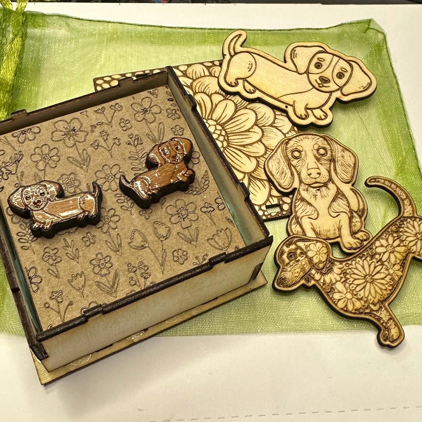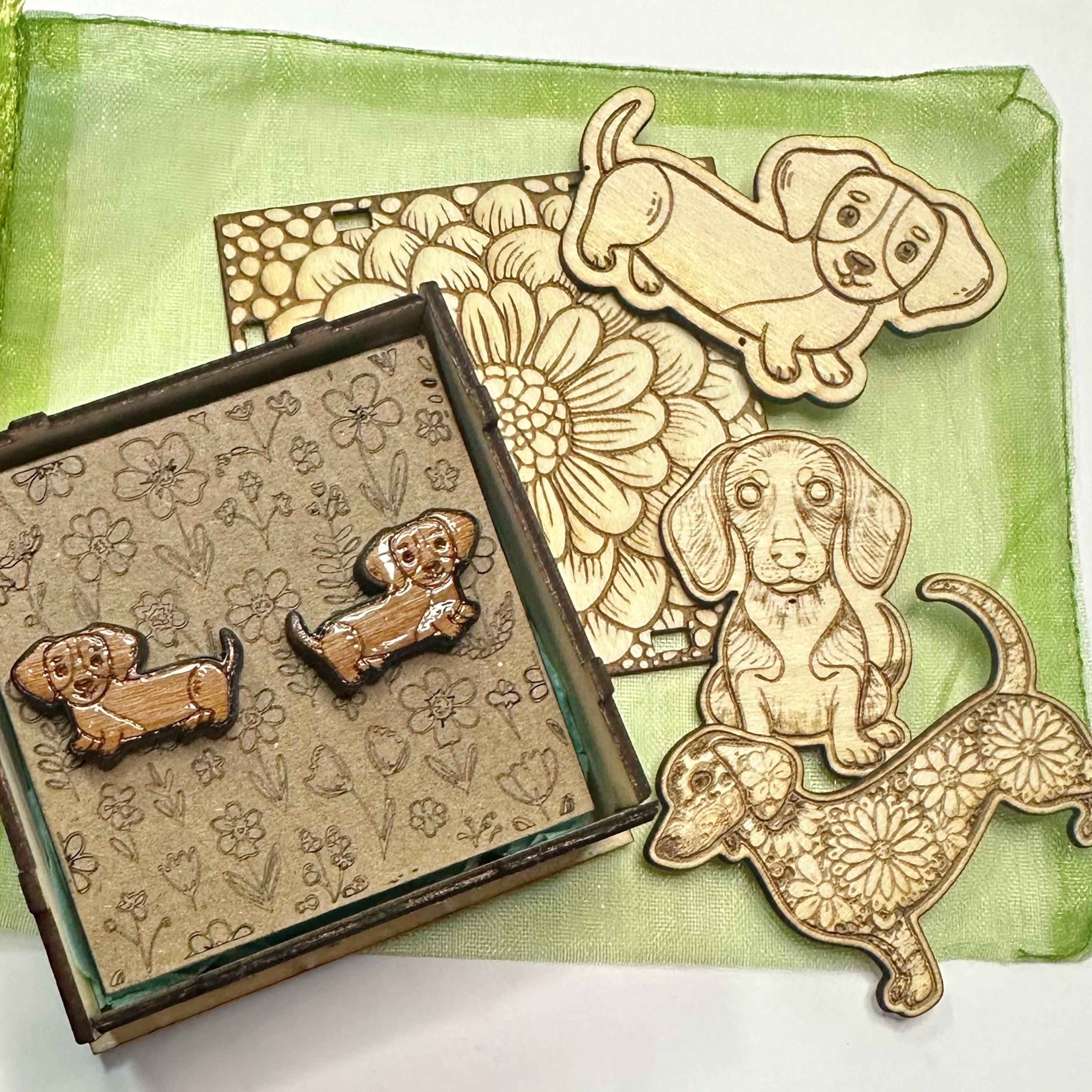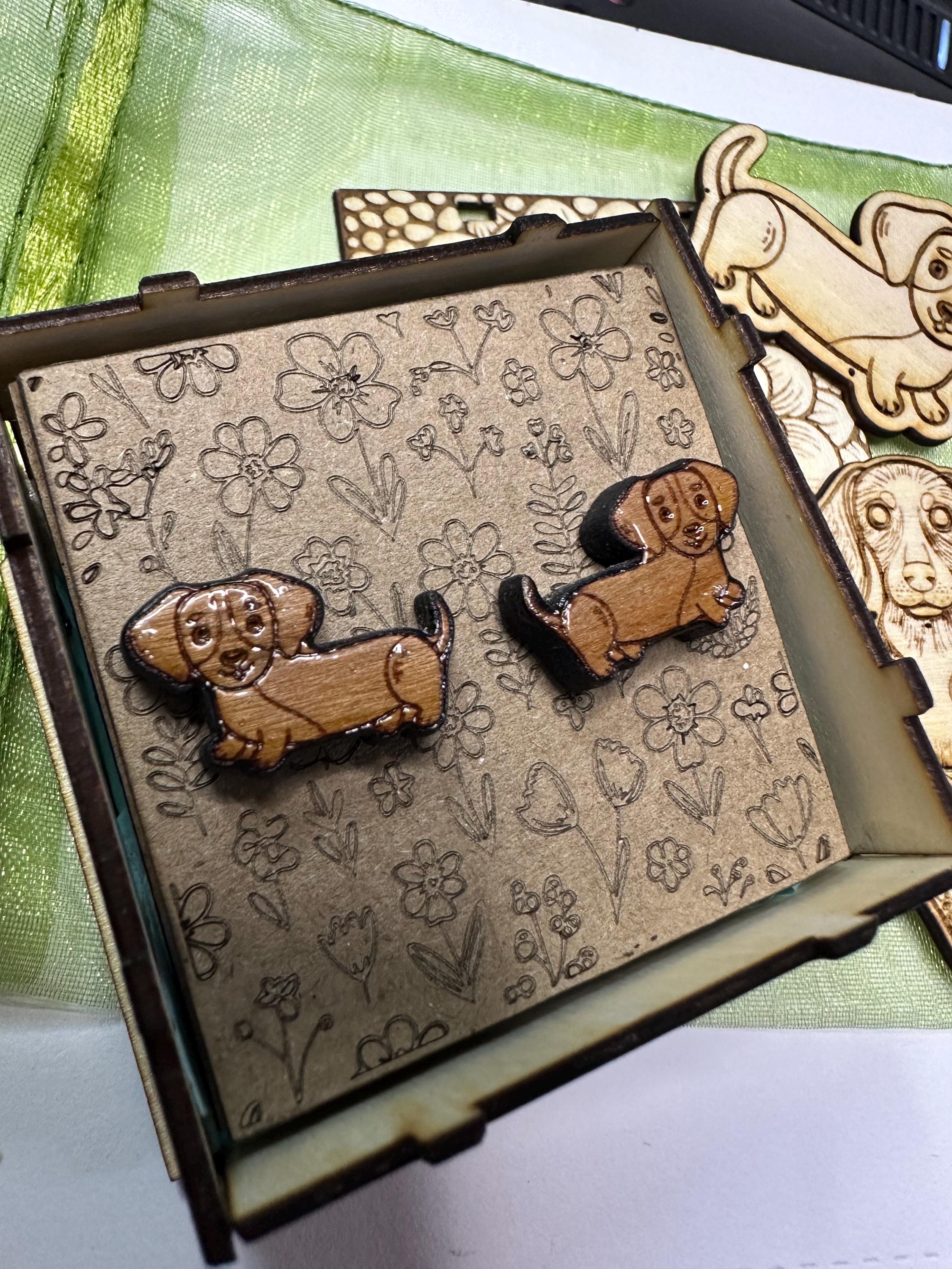 Dachshund gift set includes: cherry wood earrings on a recycled card in a floral wood gift box packaged in an organza bag with 3 themed wood stickers. off your love for dachshunds with these Cherry Wood Dachshund Stud Earrings.