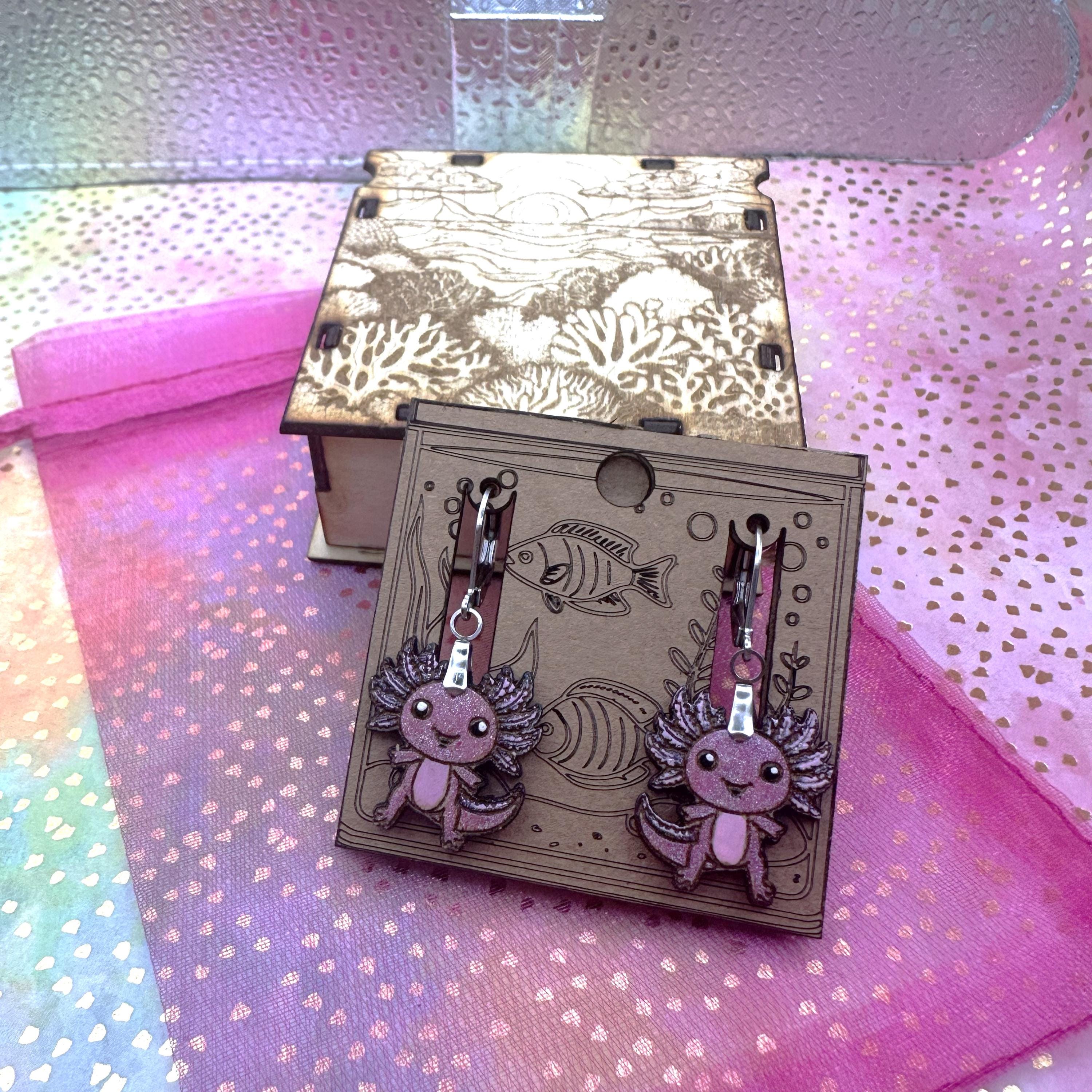 Cute hand-painted, laser cut wood axolotl earrings. Available in lever back, push back, or screw back styles. Materials: American basswood and stainless steel. Available in other colors or metals upon request.