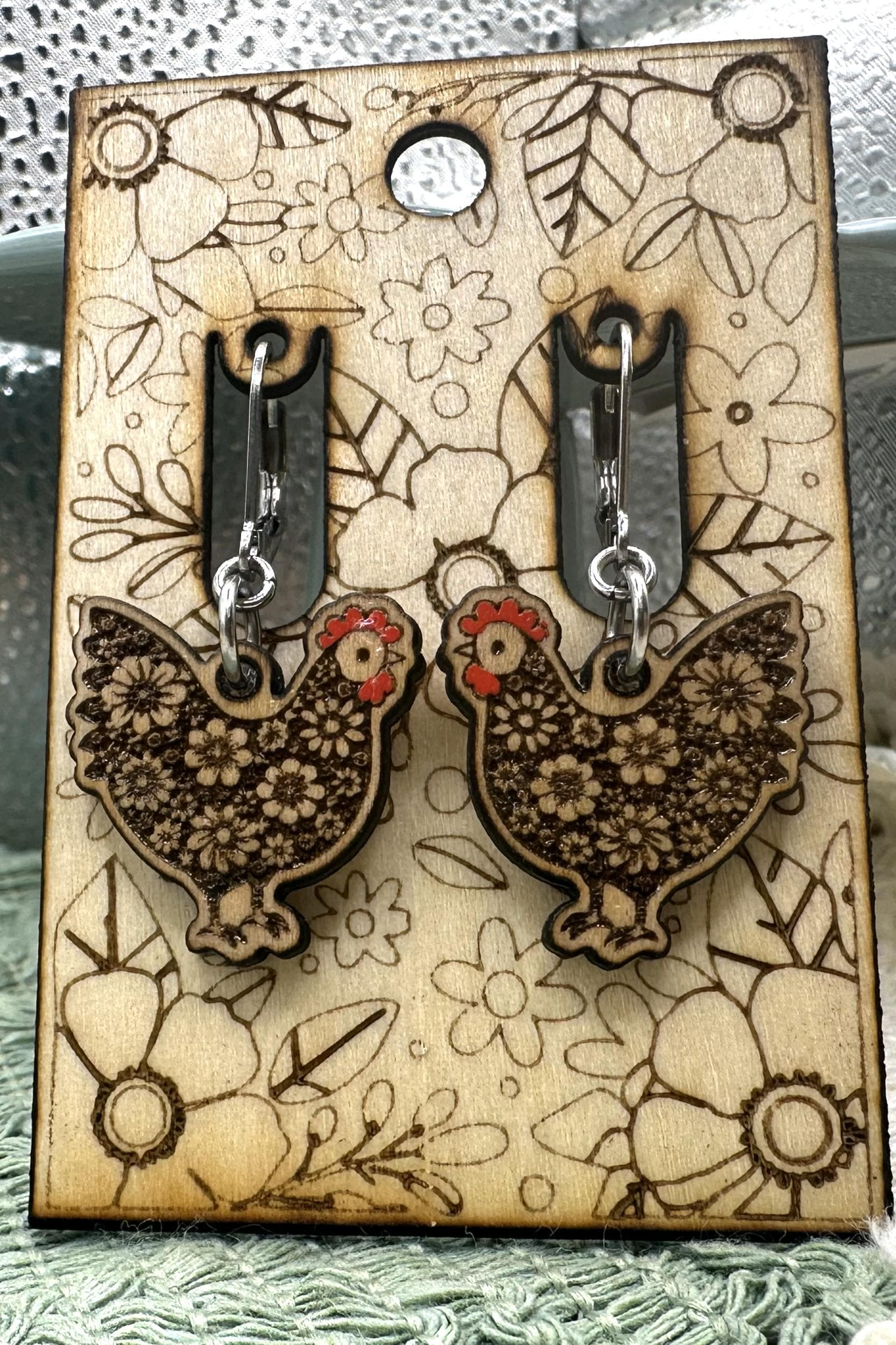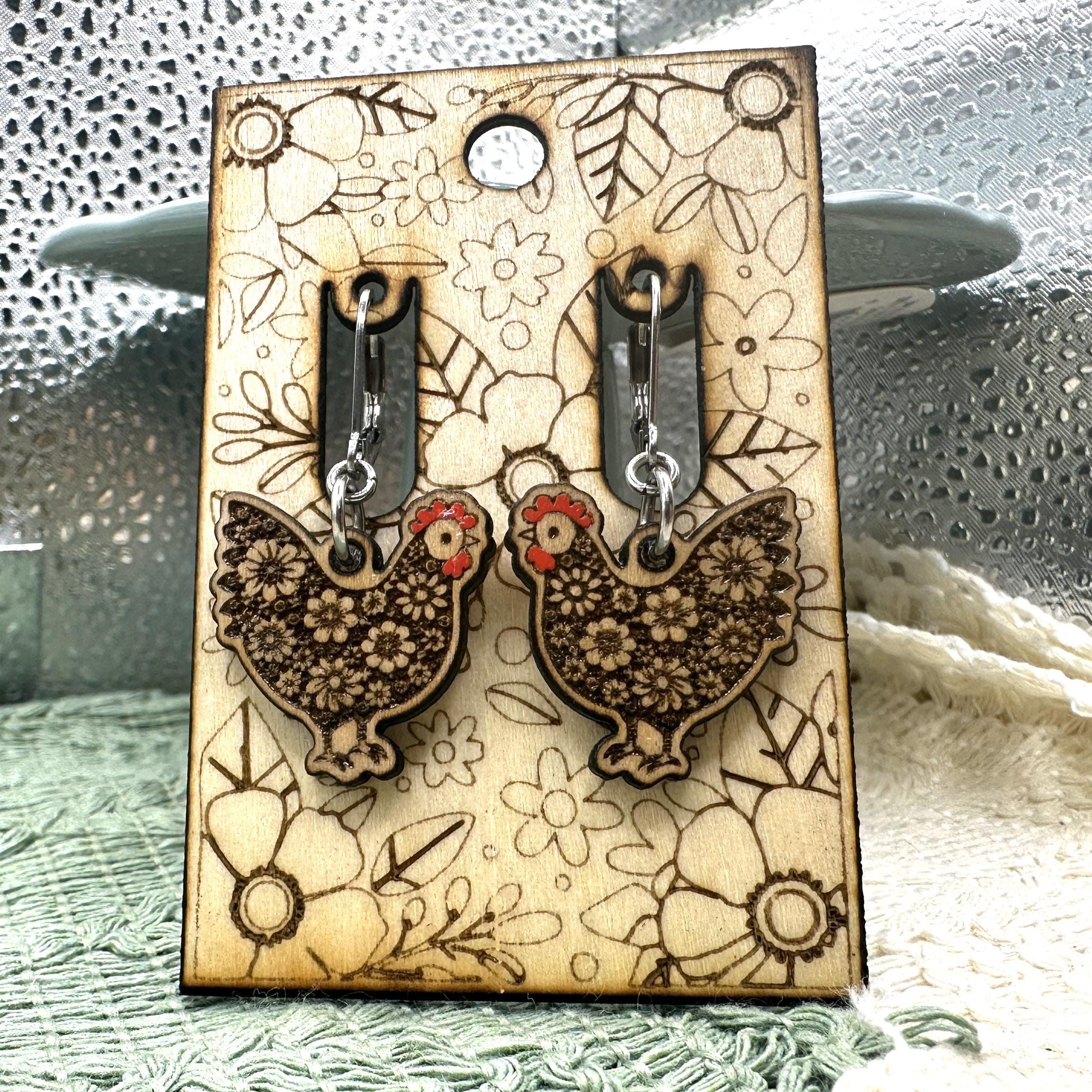 Each pair features a floral chicken design laser-engraved on American basswood, then carefully hand painted and sealed for lasting beauty. Lightweight, comfy, and full of personality—these earrings are made to make people smile.