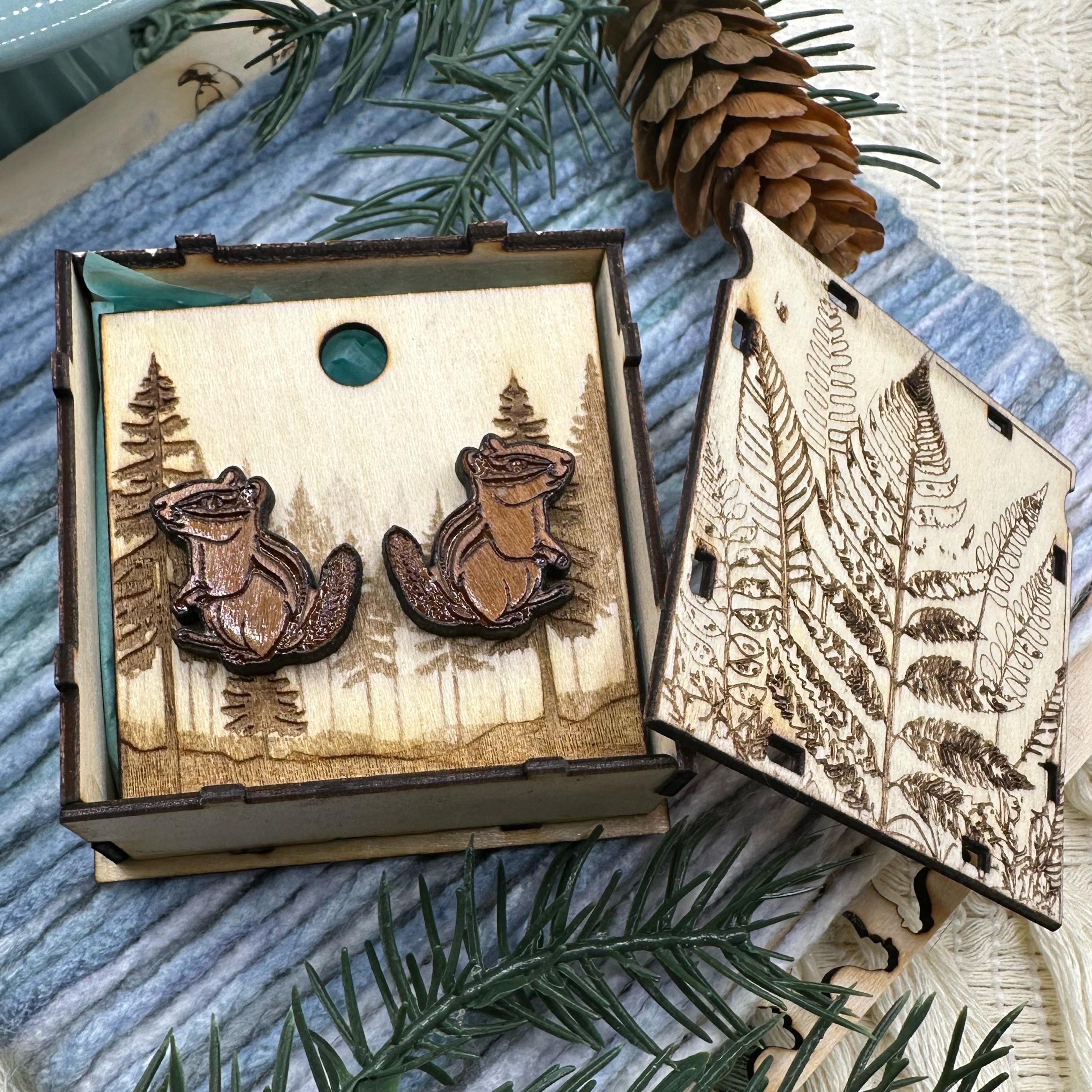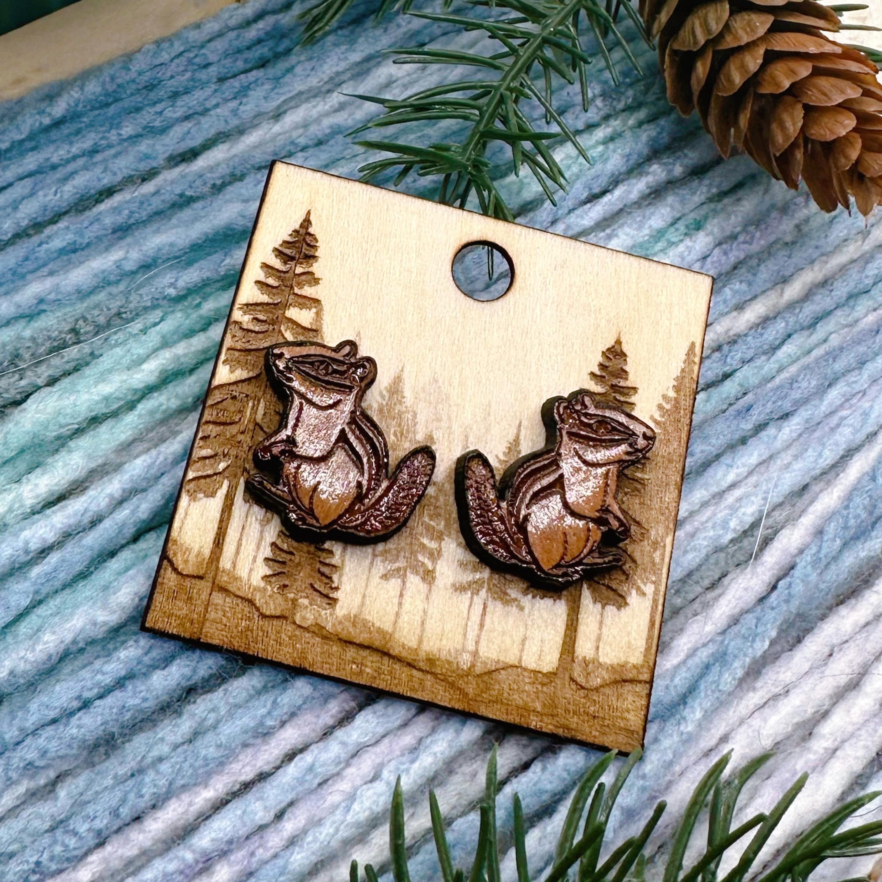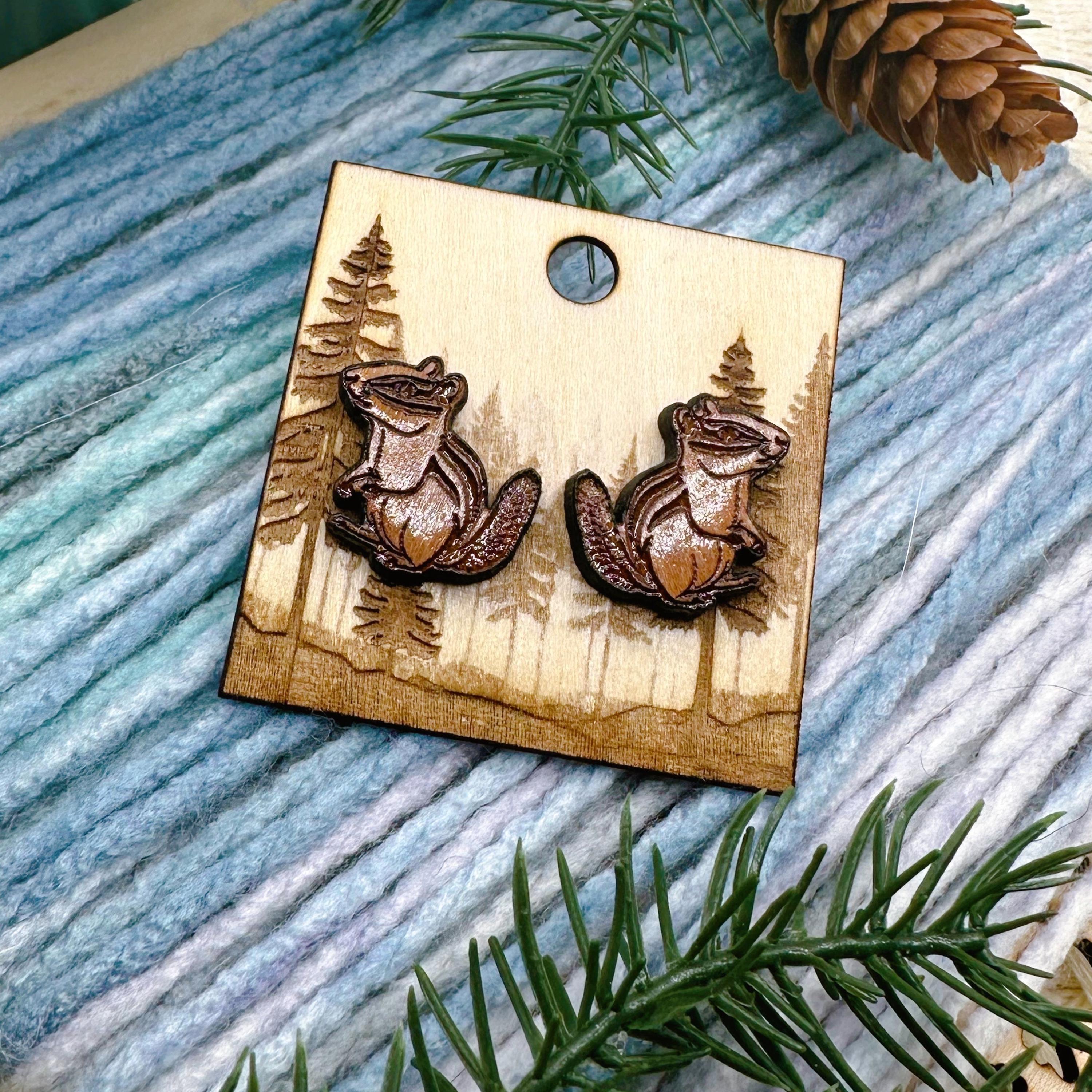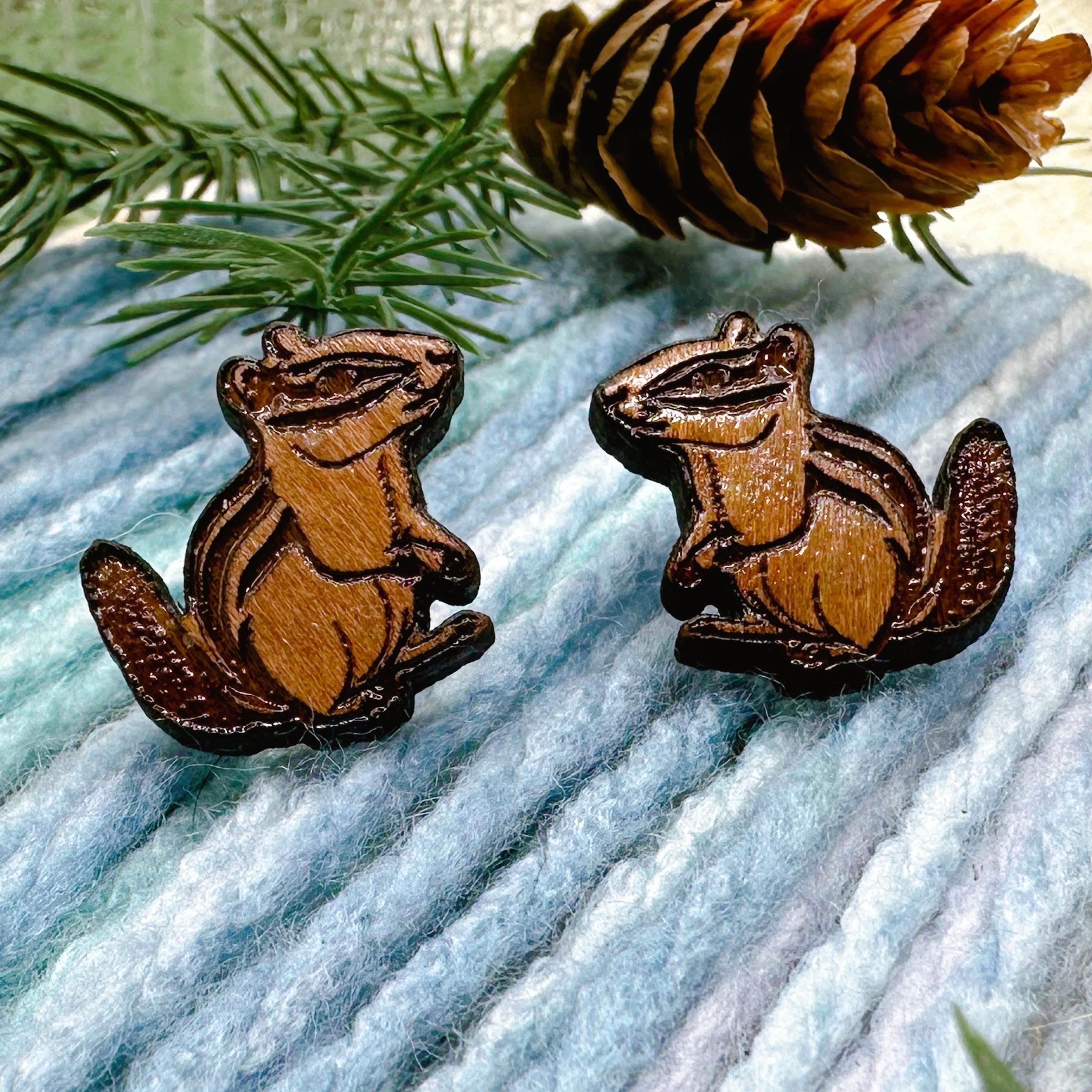 Add a touch of woodland charm to your jewelry collection with these cherry wood chipmunk earrings. Your choice of post material: stainless steel, titanium, or sterling silver.