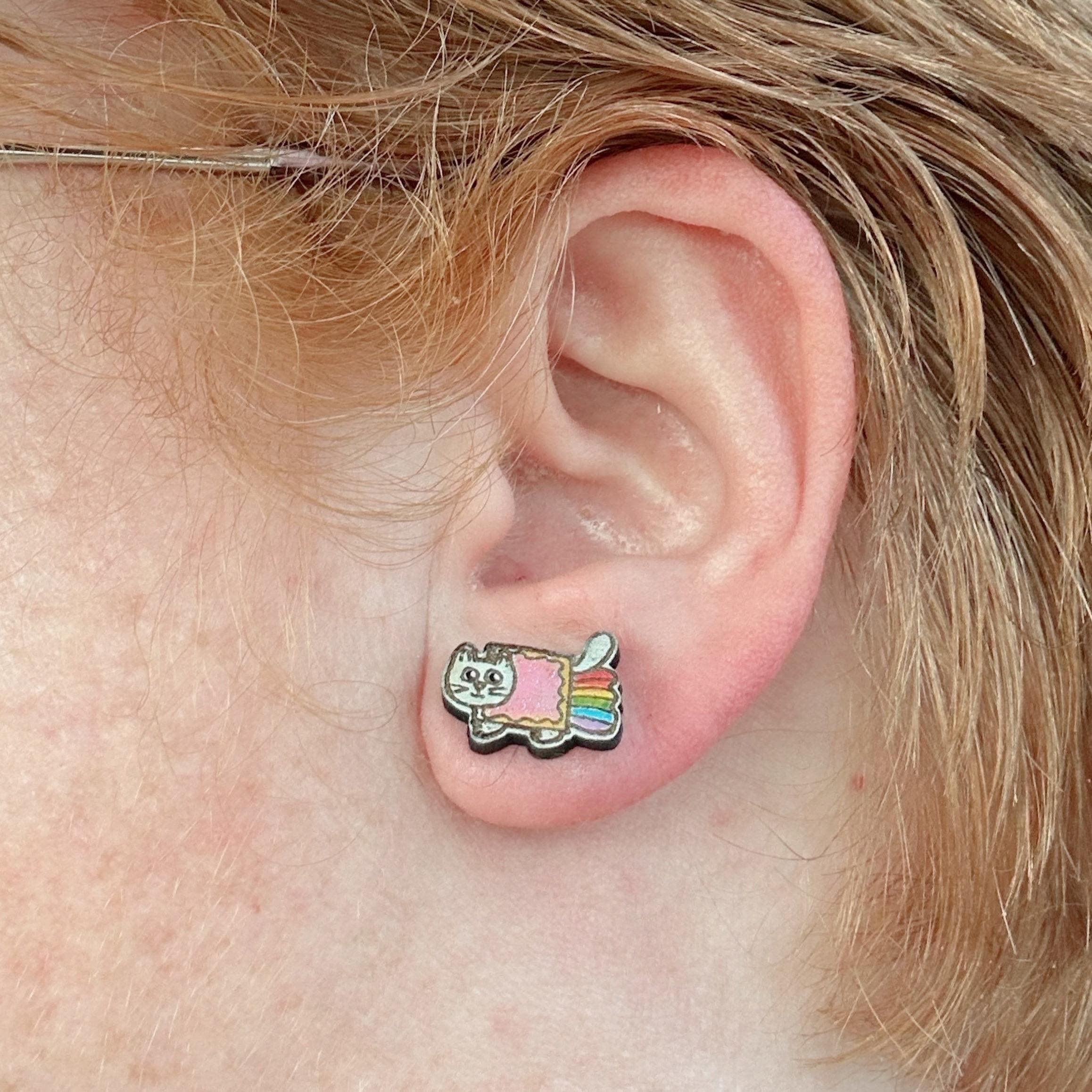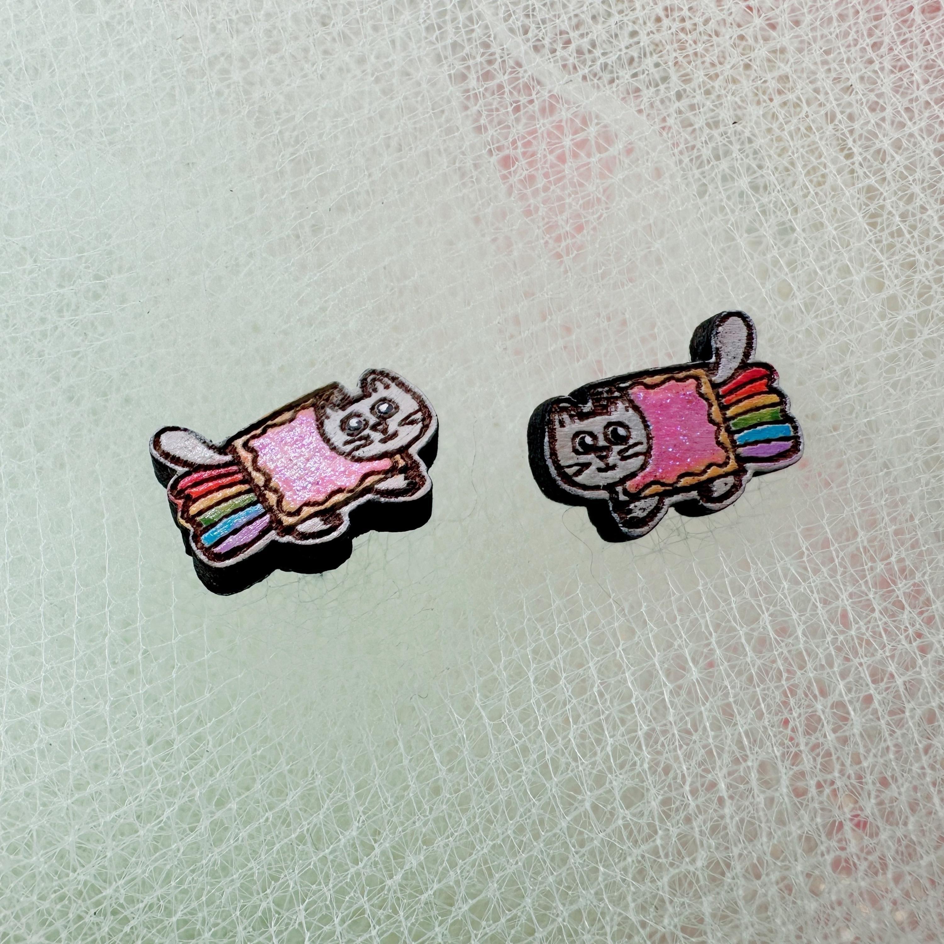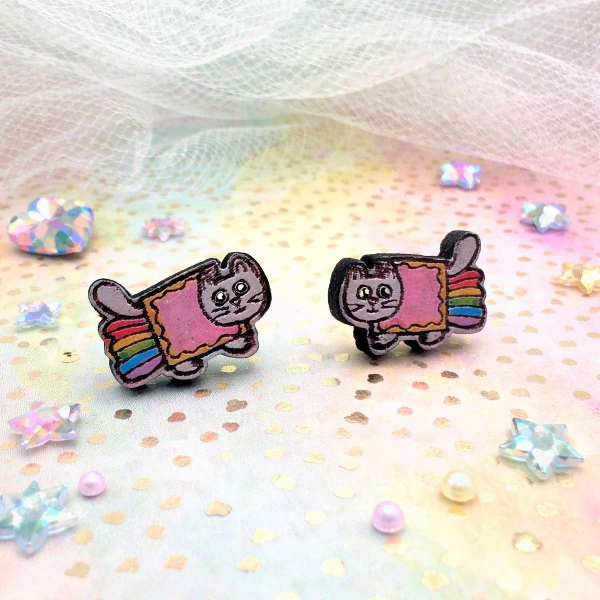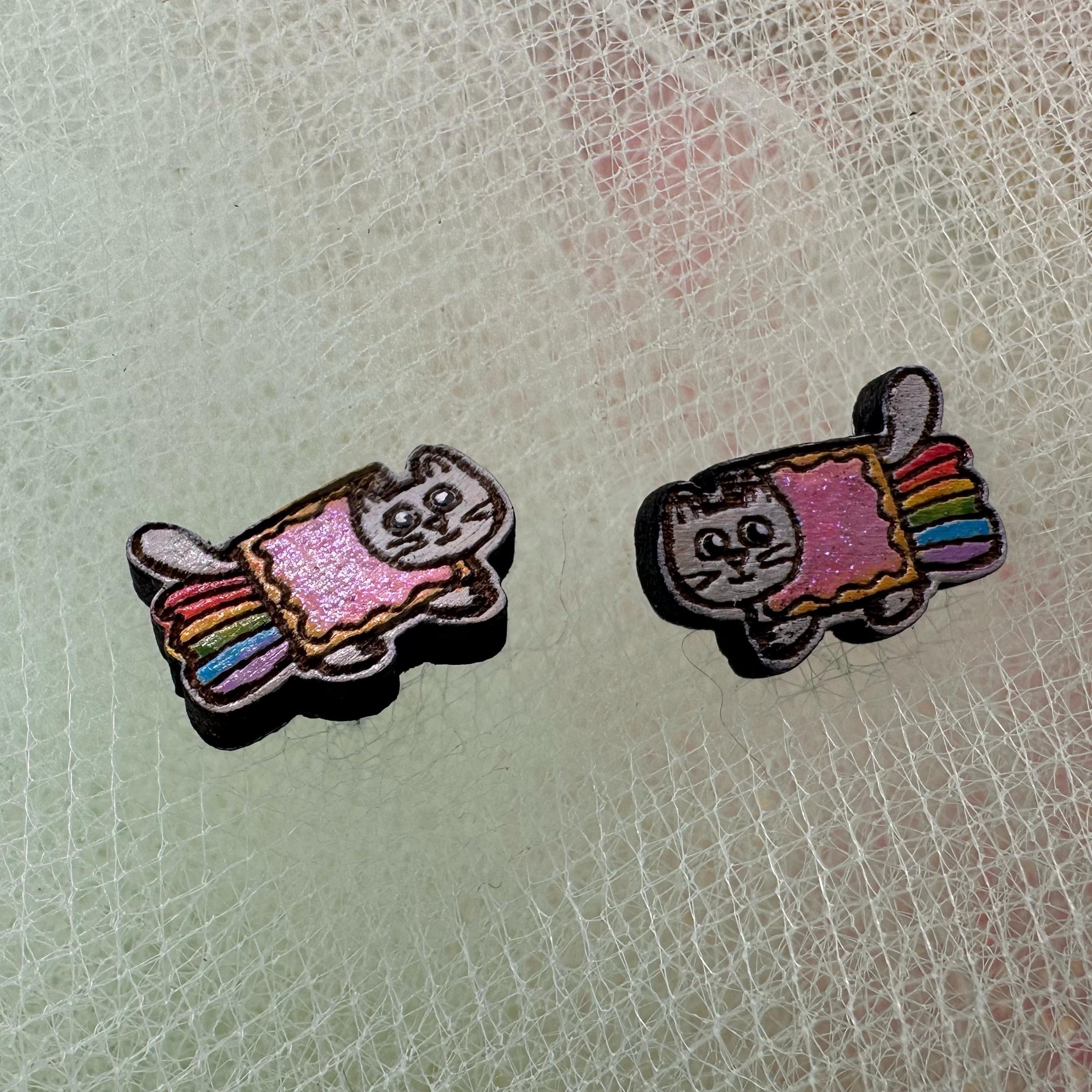 Celebrate your love for quirky internet culture with these hand-painted Nyan Cat earrings, inspired by the iconic kawaii cat meme. Crafted from laser-cut wood, these colorful glitter studs capture the pixel rainbow kitty's charm perfectly, making them a standout addition to your collection. Whether you're seeking cute meme studs or a fun, shiny girly accessory, these earrings bring nostalgia retro vibes with a playful twist.