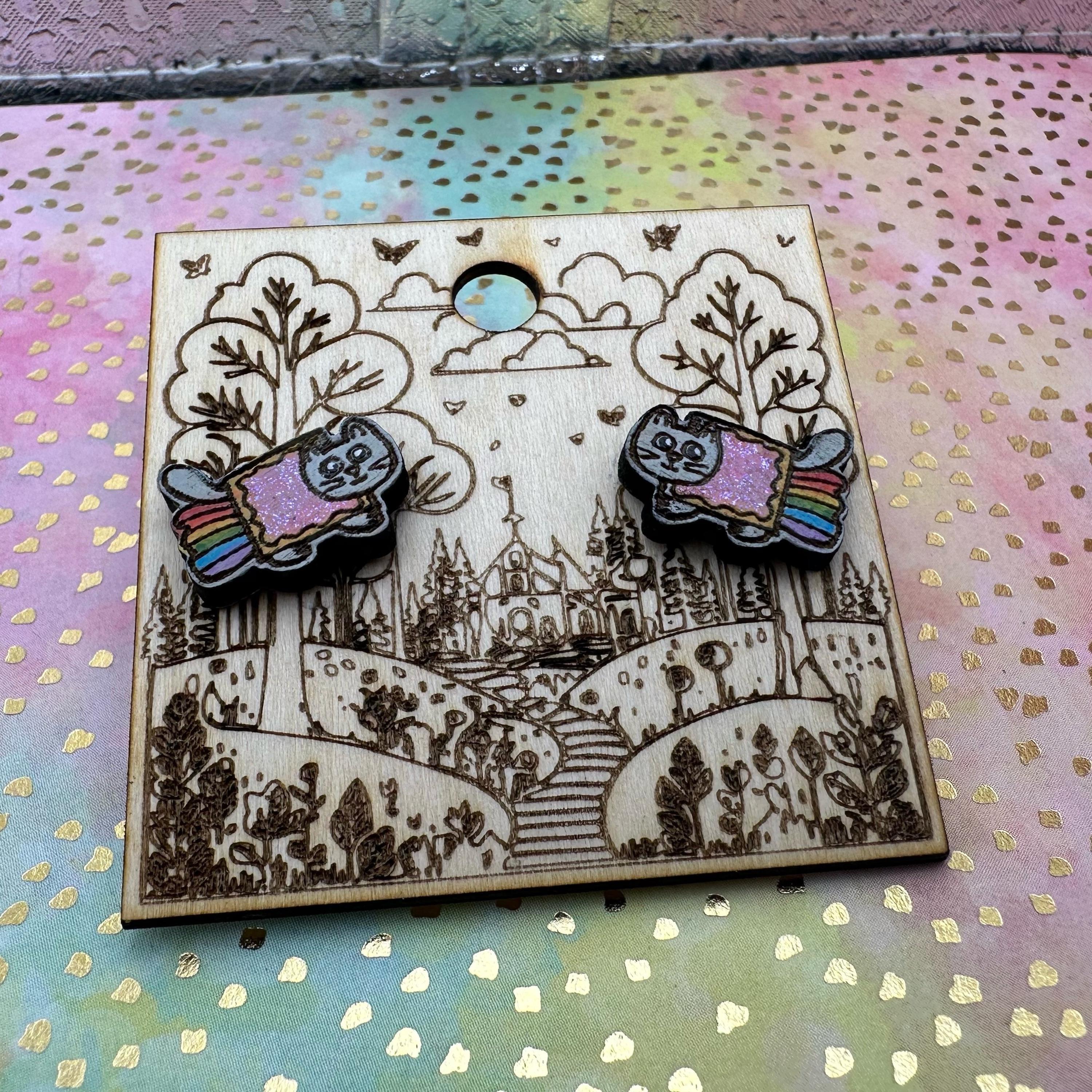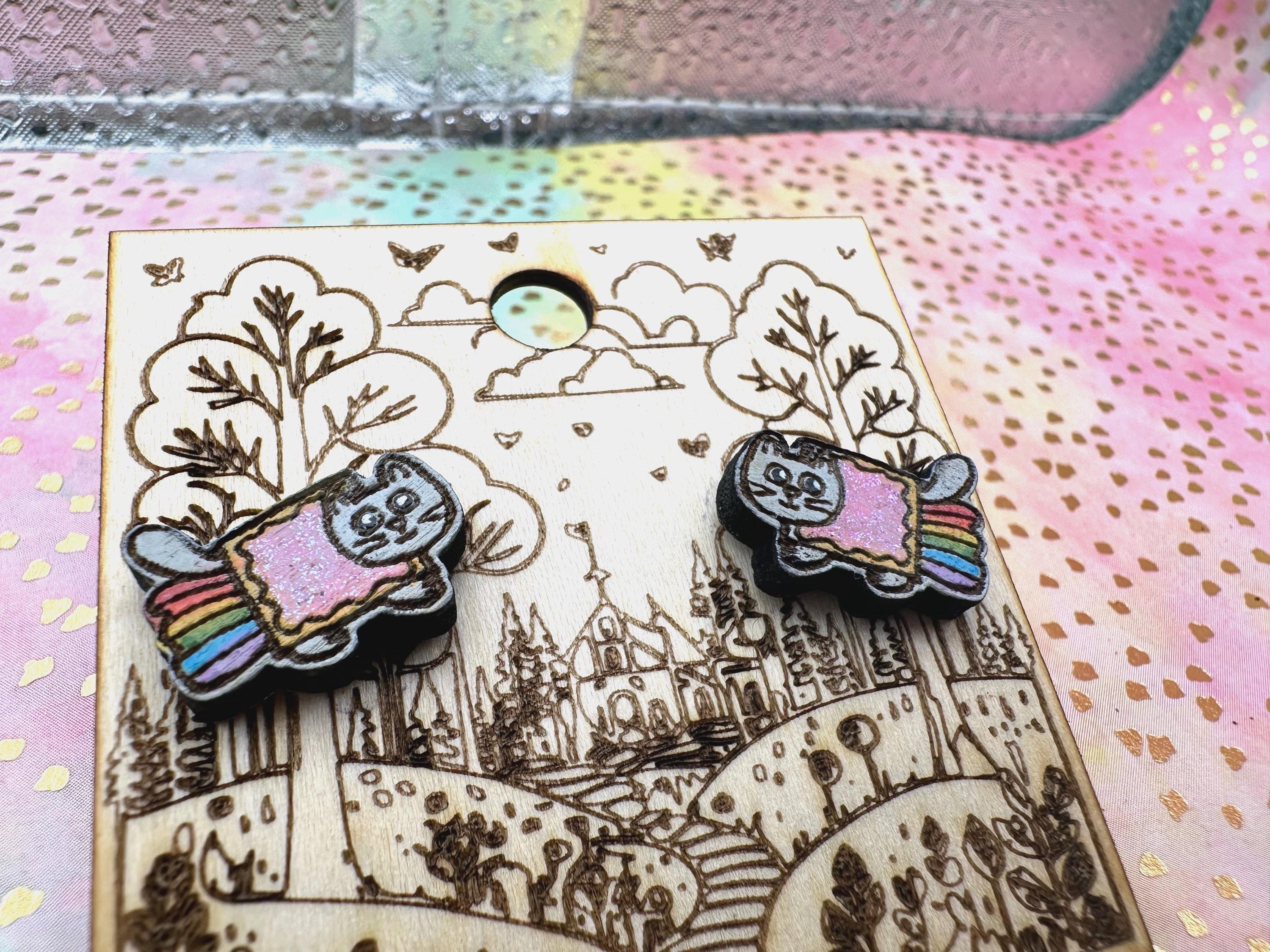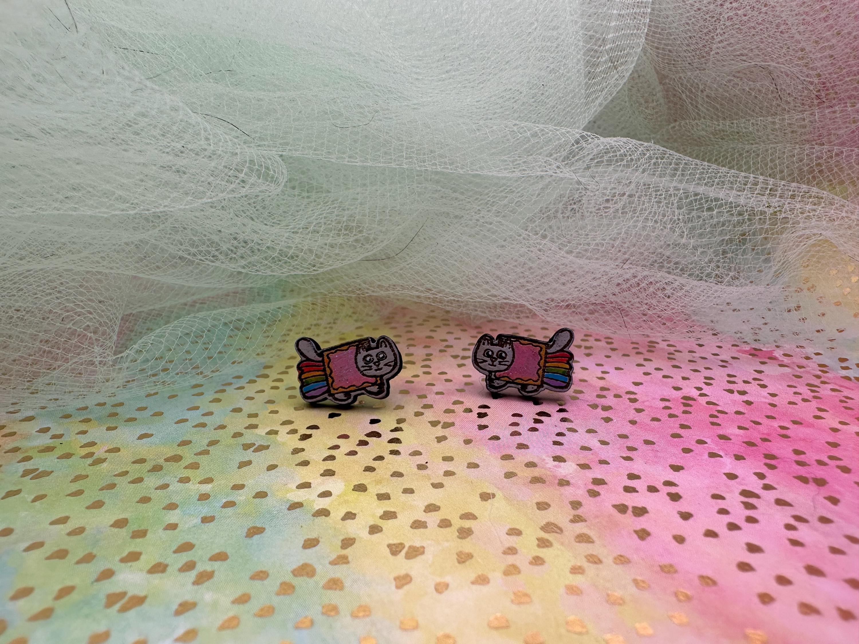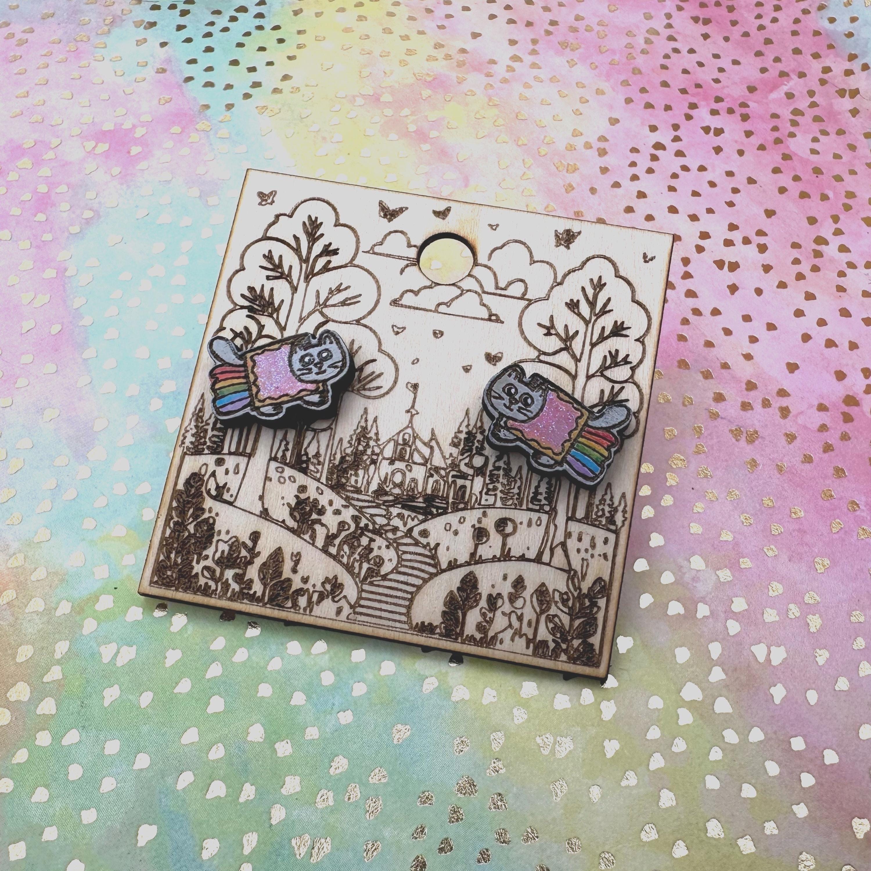 Celebrate your love for quirky internet culture with these hand-painted Nyan Cat earrings, inspired by the iconic kawaii cat meme. Crafted from laser-cut wood, these colorful glitter studs capture the pixel rainbow kitty's charm perfectly, making them a standout addition to your collection. Whether you're seeking cute meme studs or a fun, shiny girly accessory, these earrings bring nostalgia retro vibes with a playful twist.