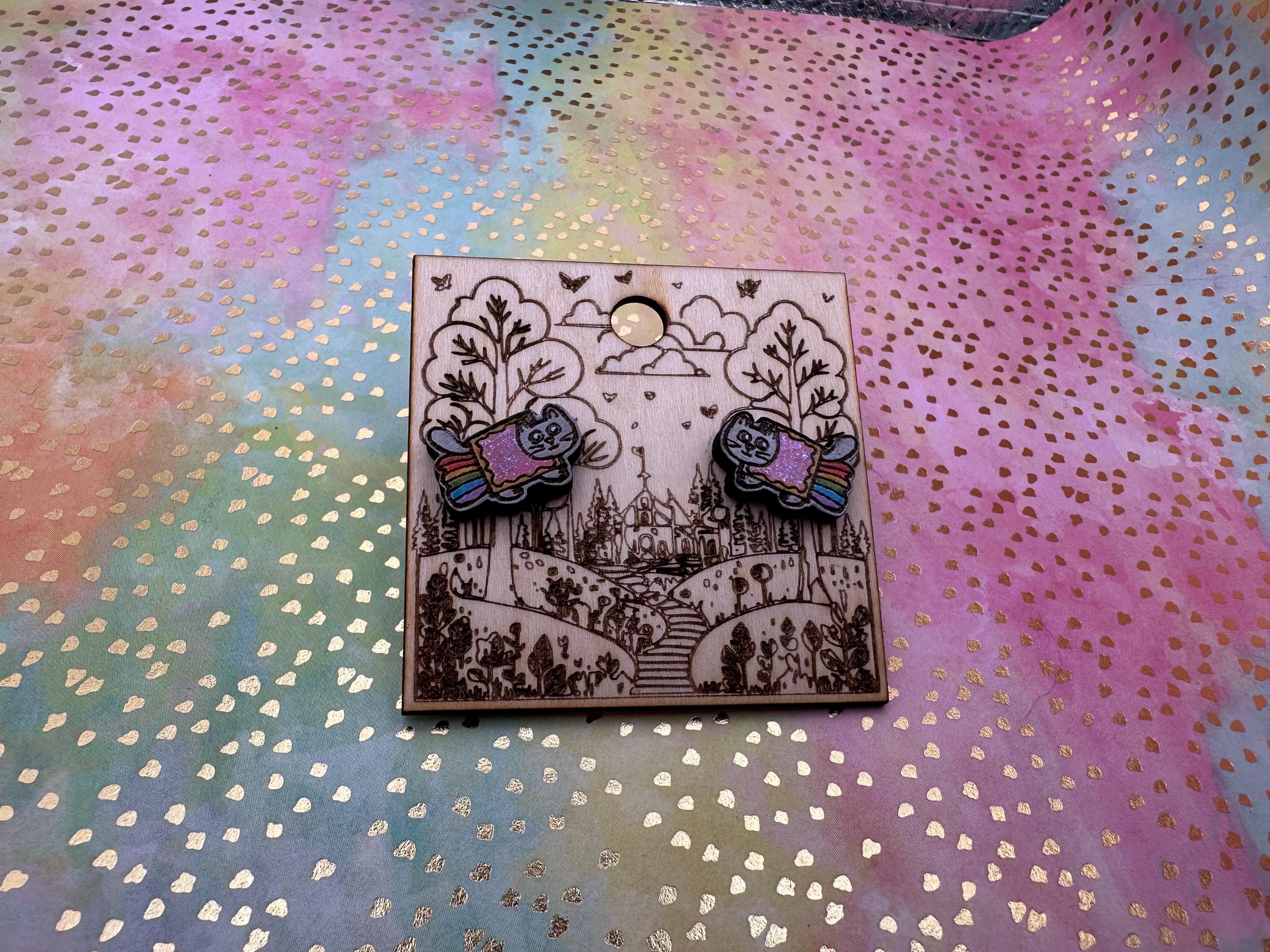 Let your weird self shine with these cute Nyan Cat internet sensation inspired earrings. These small stud earrings have been laser cut from wood and hand painted. This design was hand drawn. Can be personalized to whatever cat color or custom colors that you would like. These are lots of fun and sure to be a conversation starter! Follow my store for more random things and wearable cat memes.