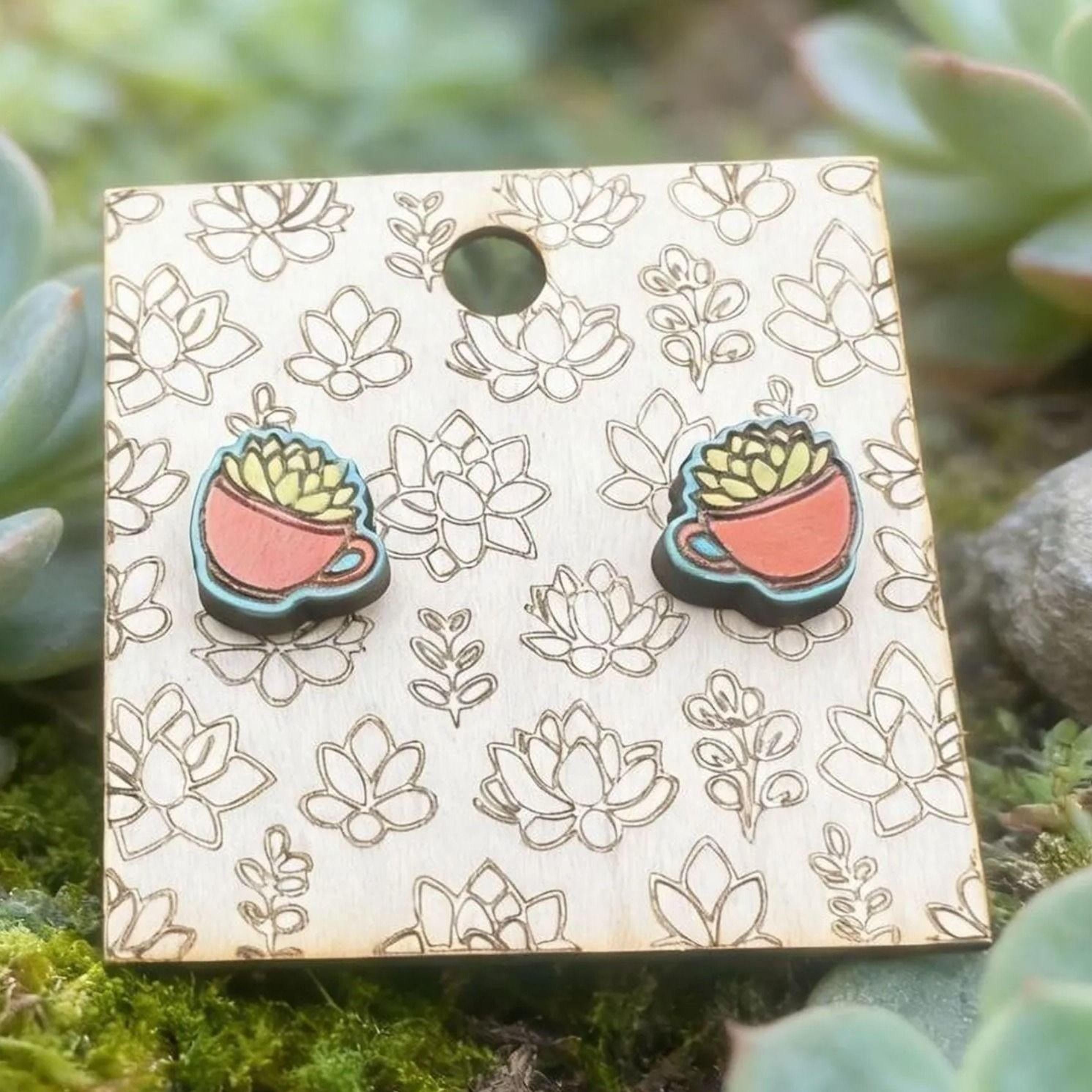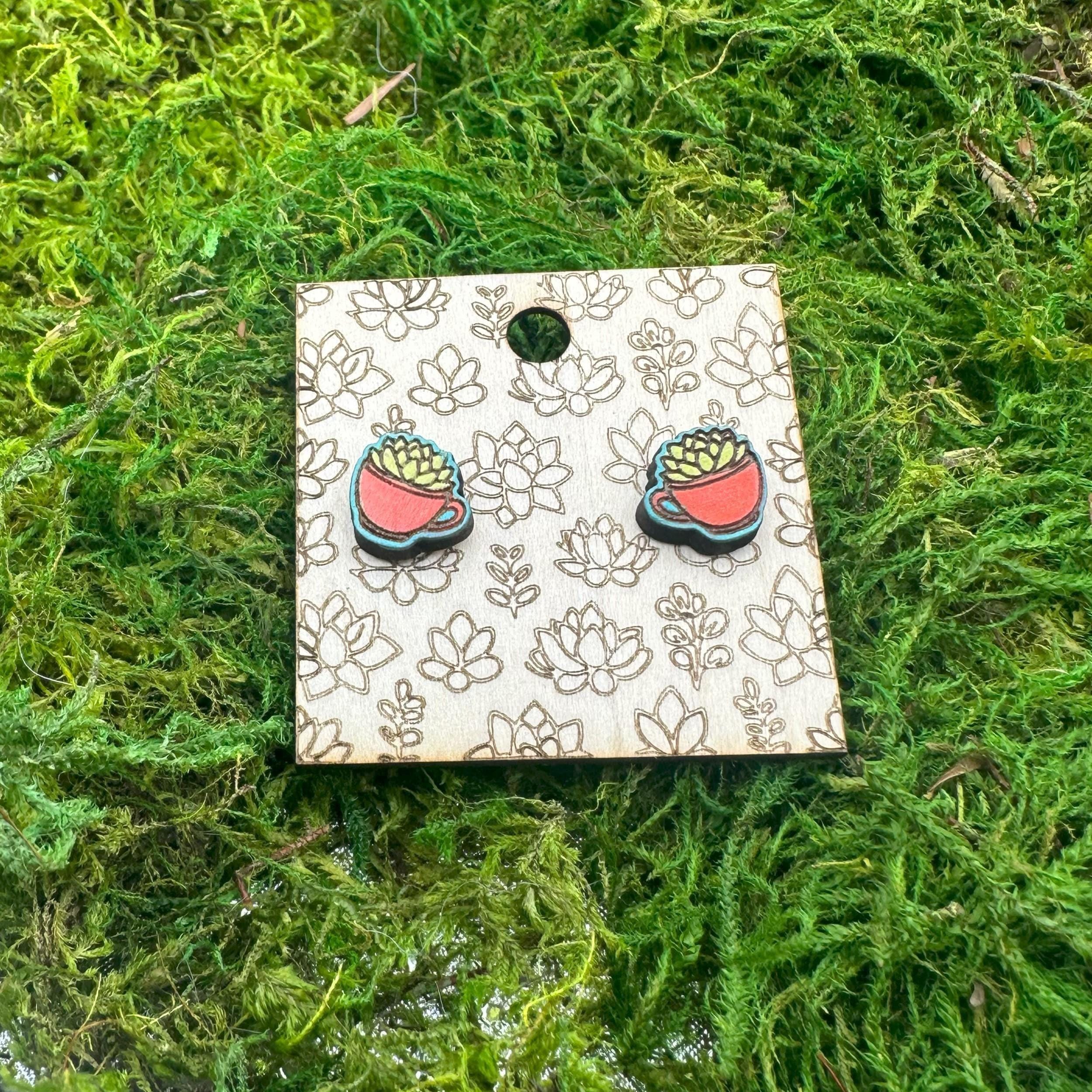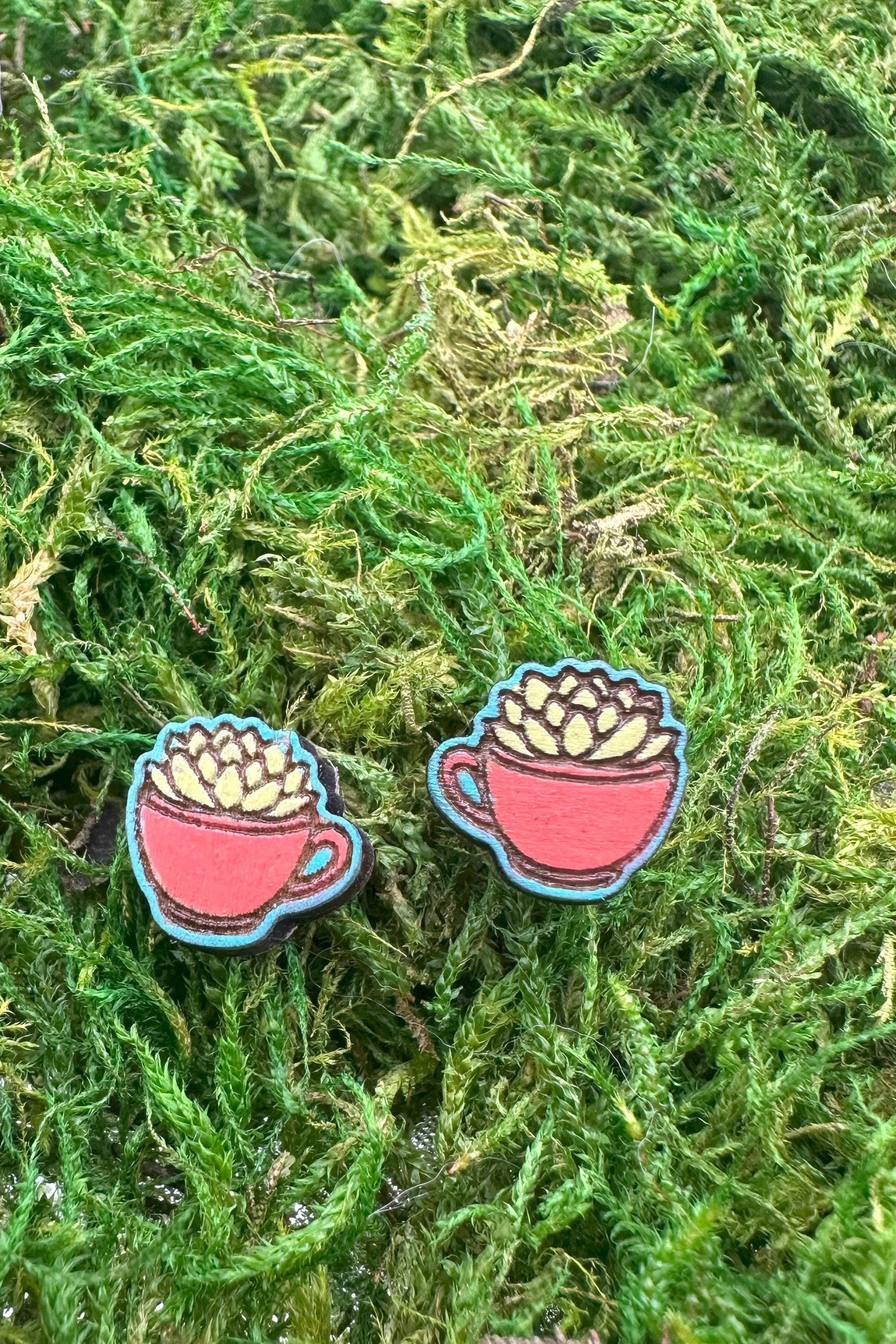 Add a little charm to your look with these sweet succulent-in-a-teacup earrings! Each earring is hand-drawn, laser cut from eco-friendly wood, and carefully hand painted to bring out the vibrant details of the tiny teacup and plant.