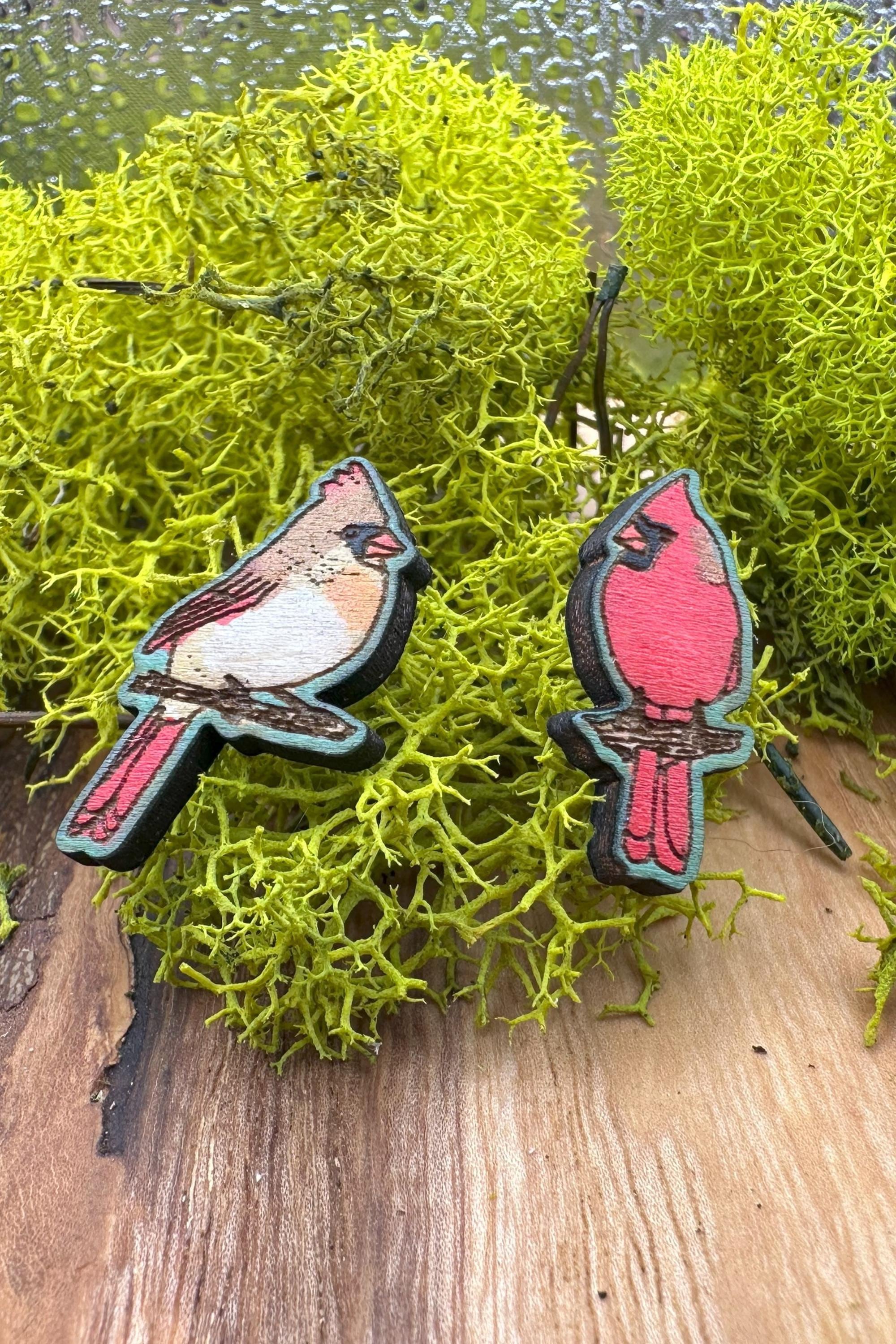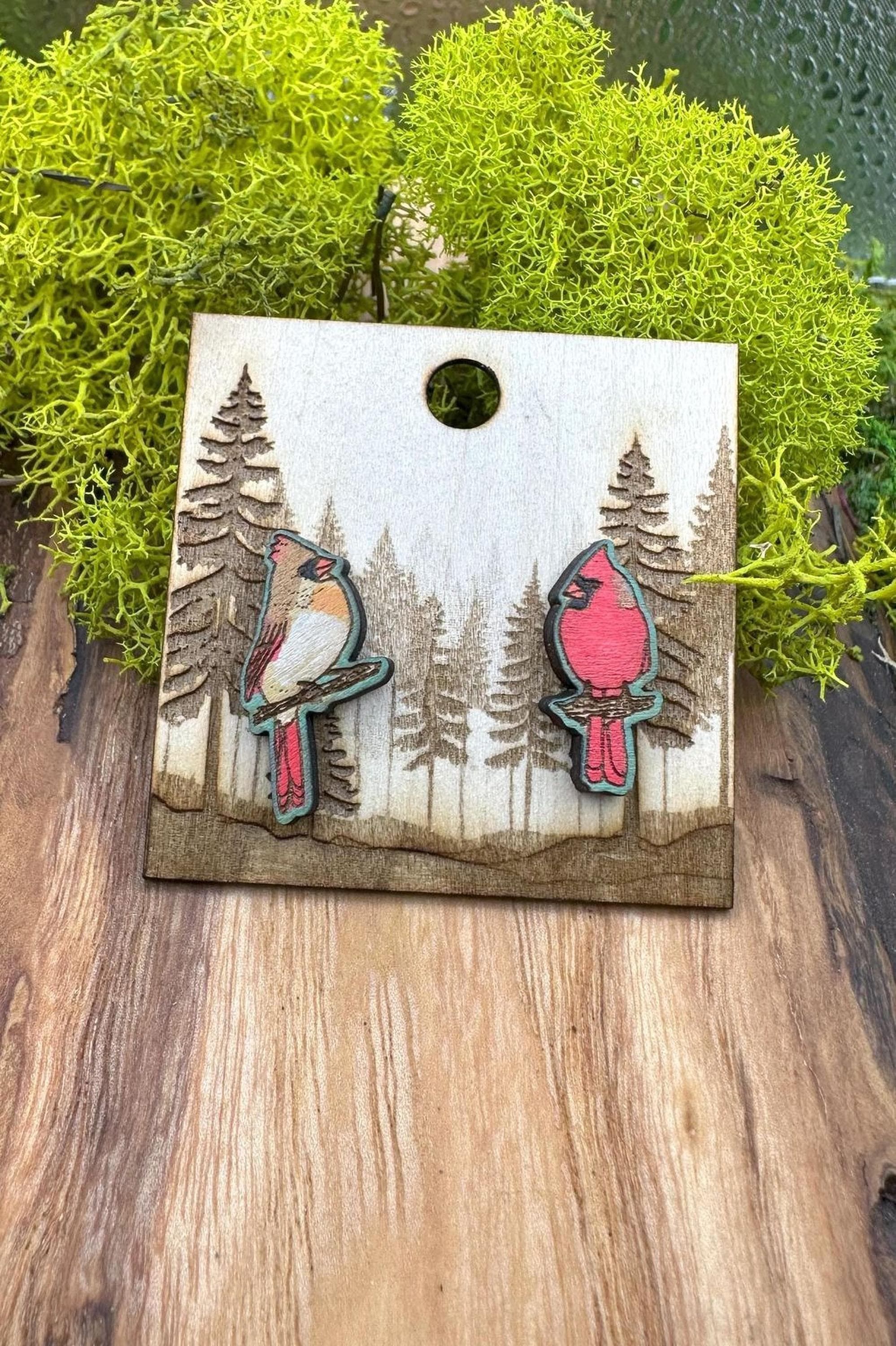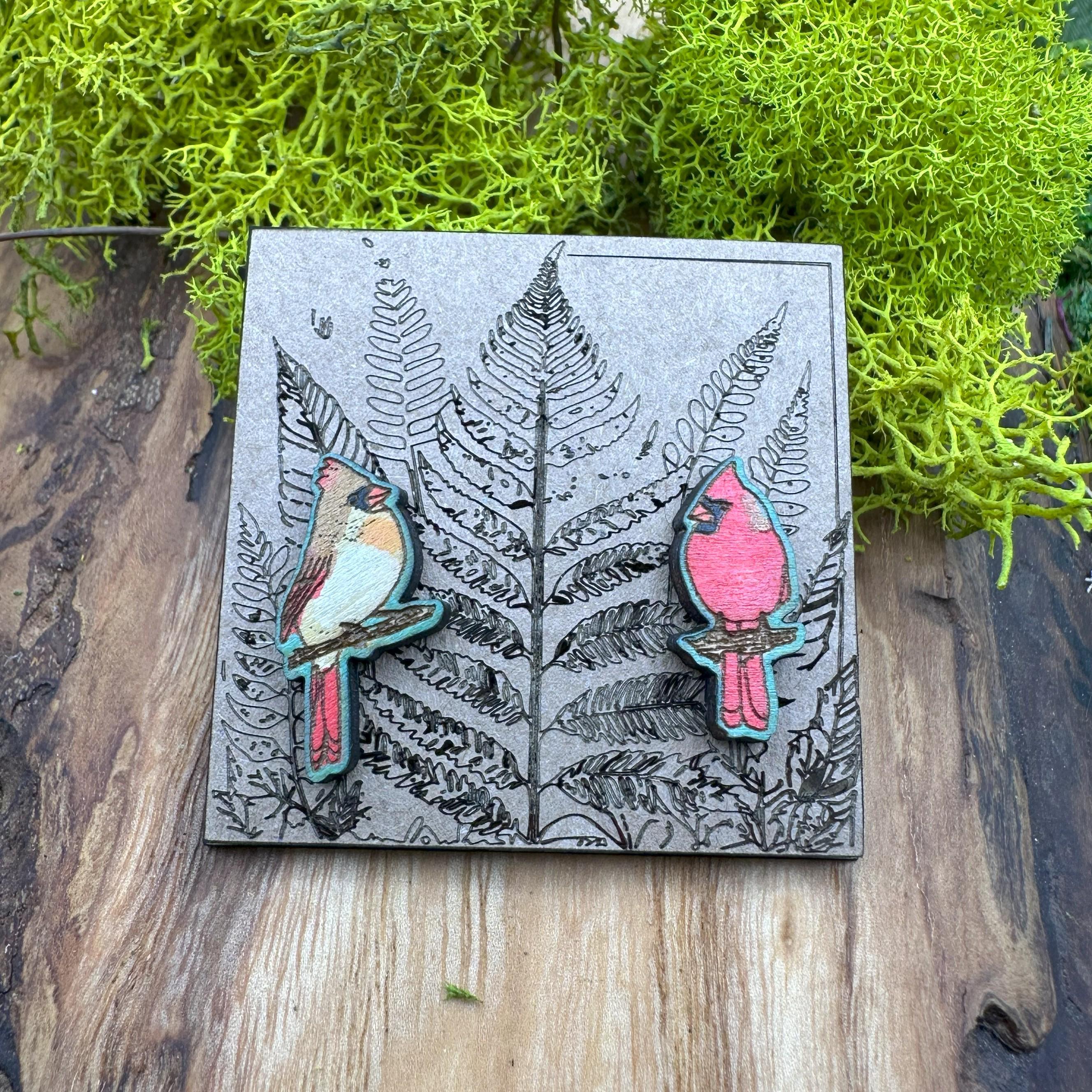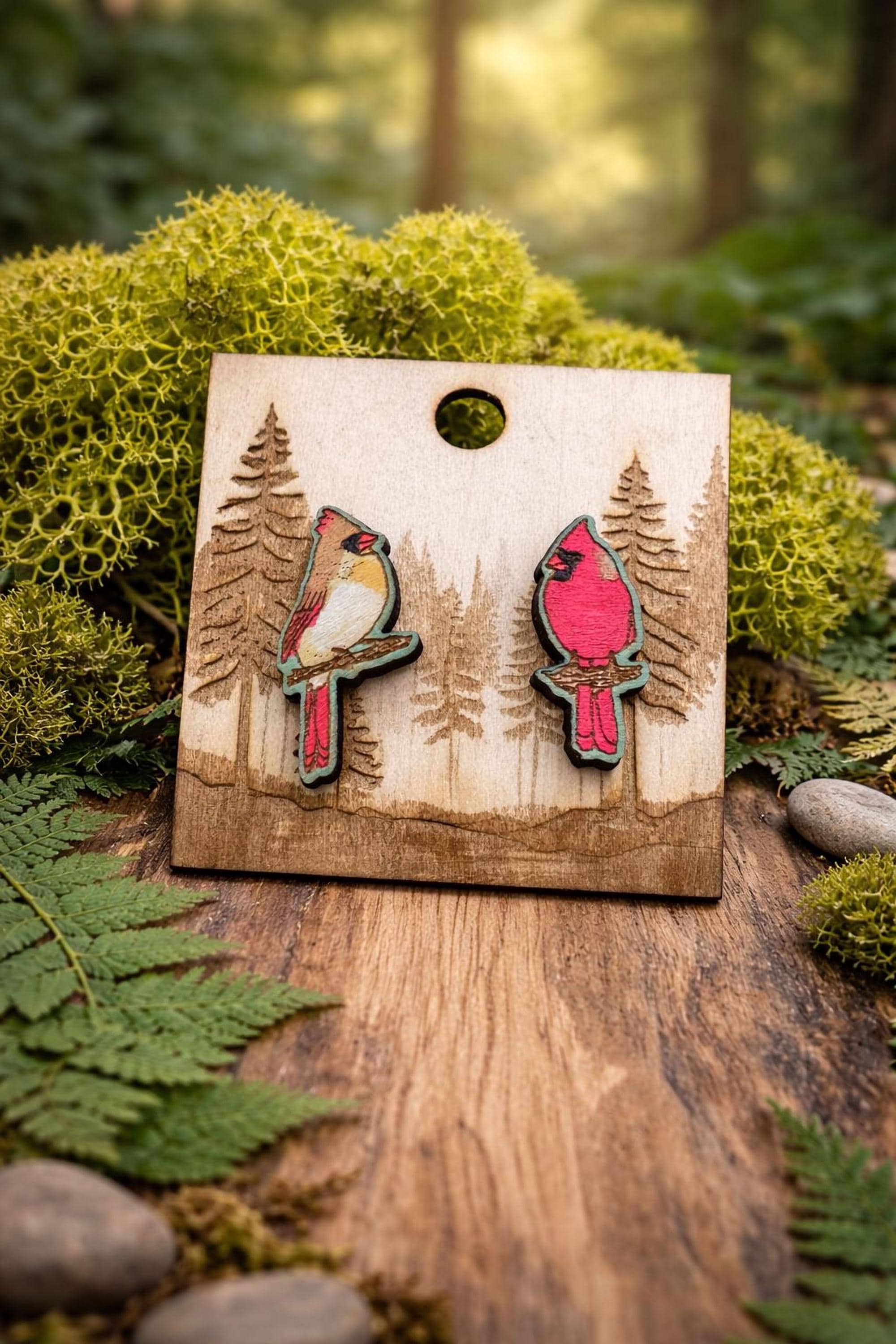 Bring a little backyard beauty to your jewelry collection with these hand-painted cardinal stud earrings. Featuring a red male and warm-toned female northern cardinal, each earring is laser cut from sustainable American basswood, engraved for detail, and carefully painted by hand for a vibrant finish.