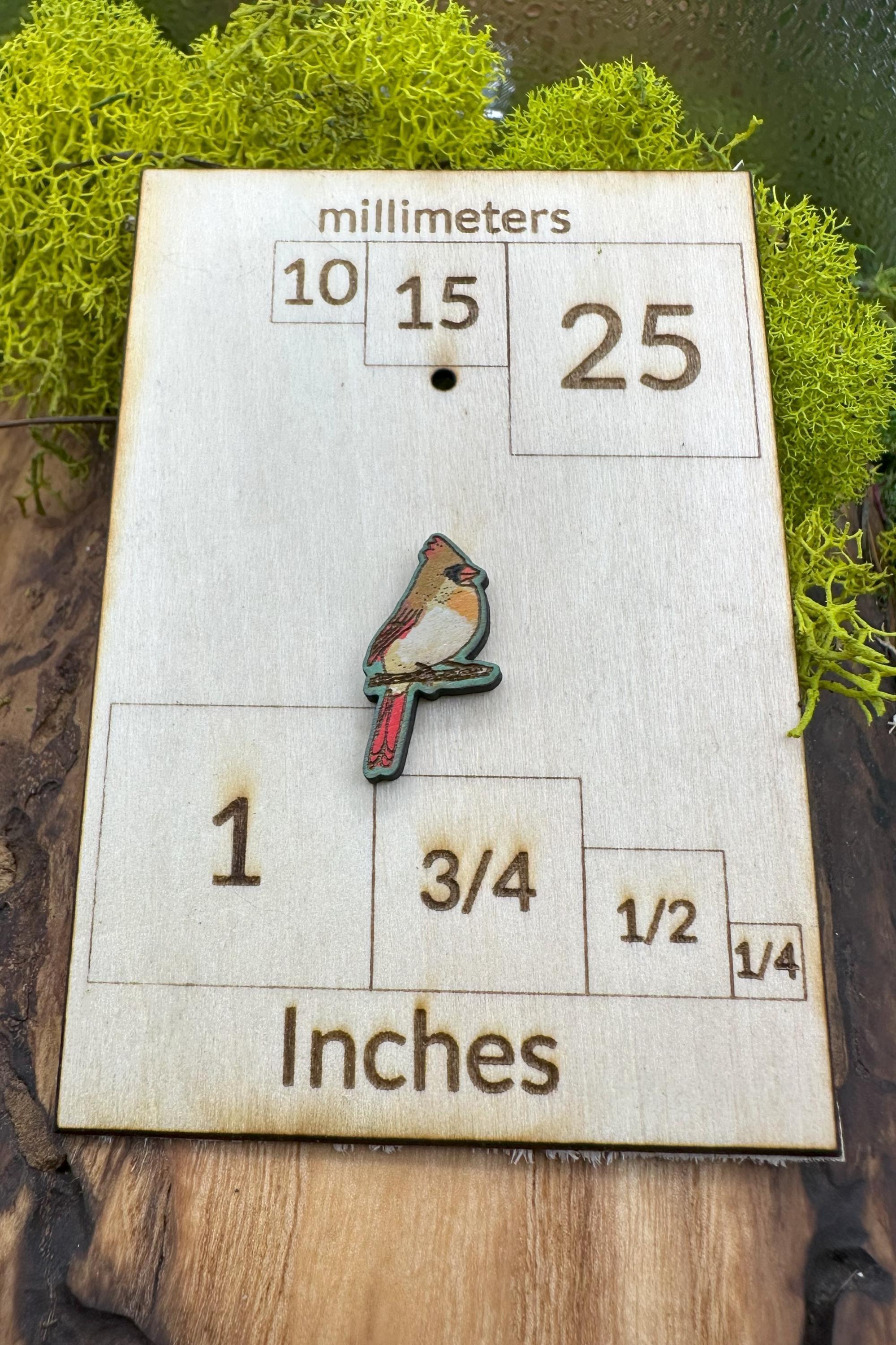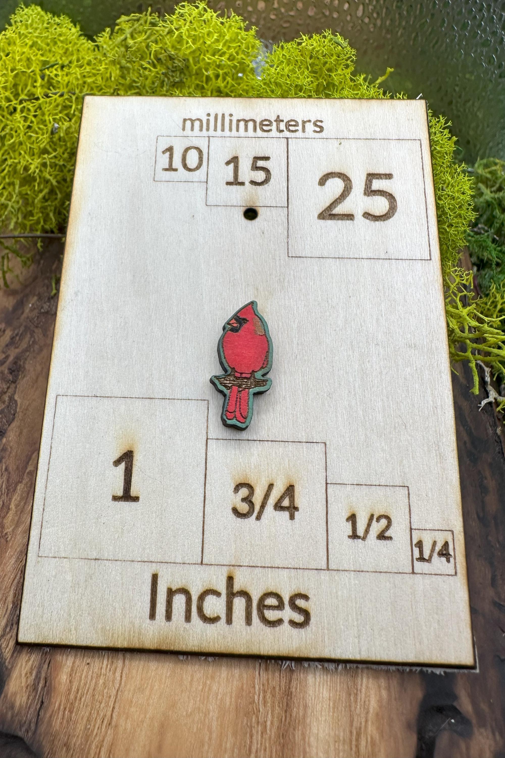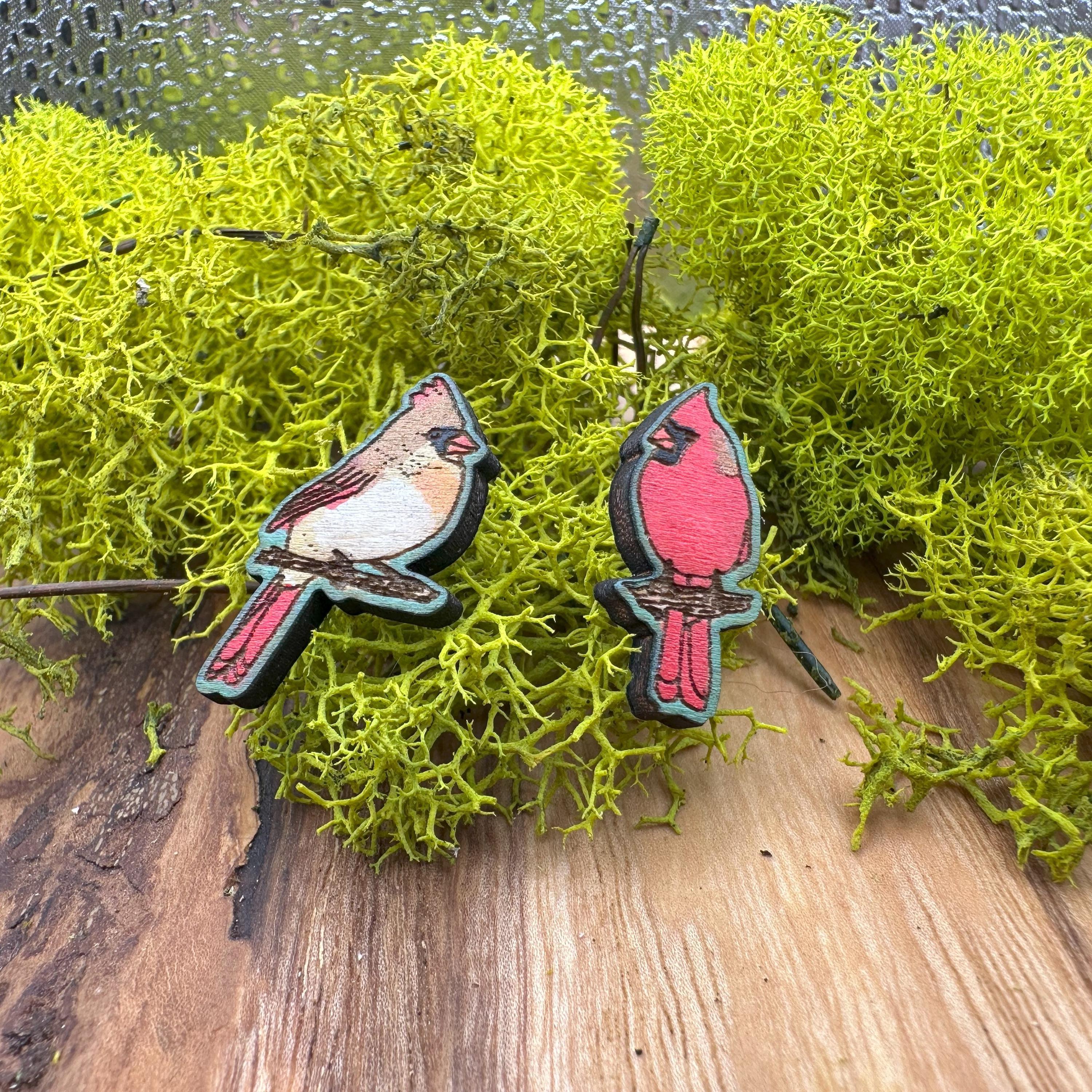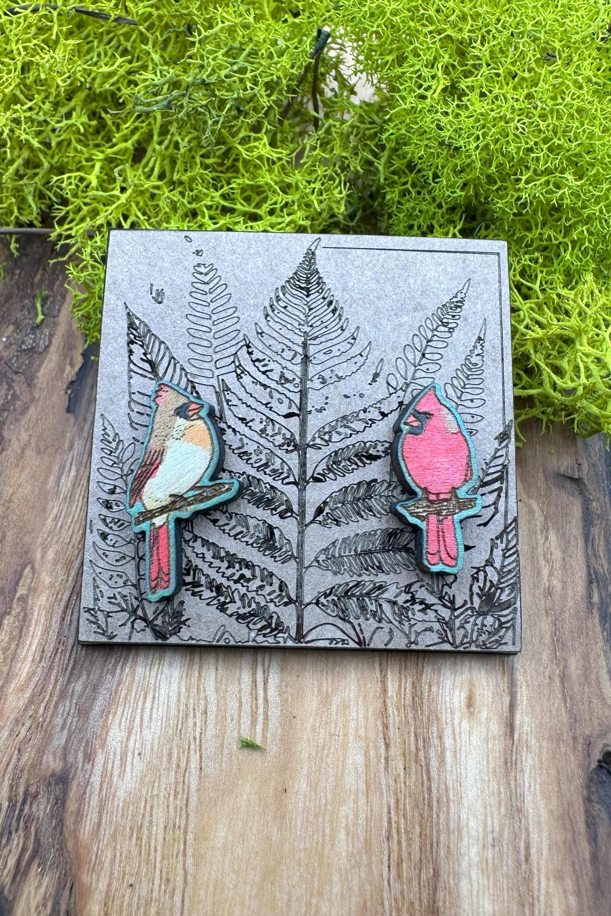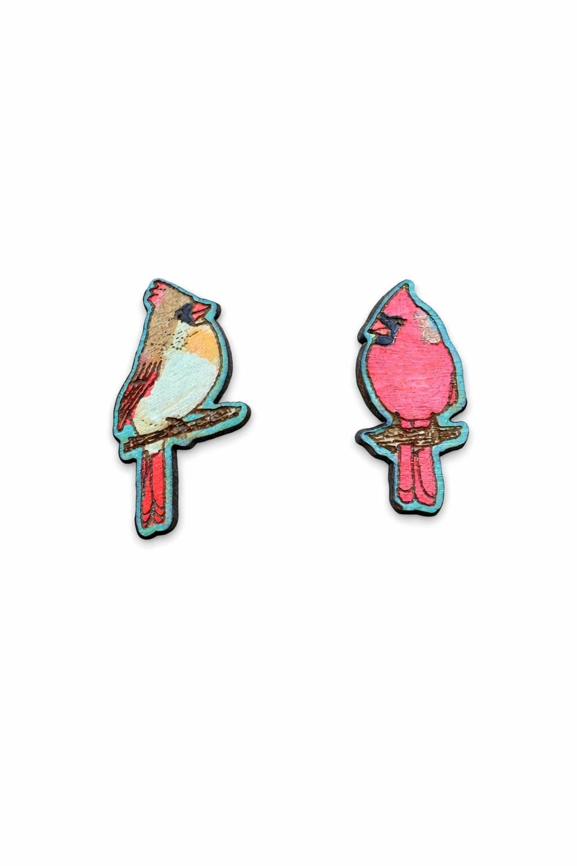 Bring a little backyard beauty to your jewelry collection with these hand-painted cardinal stud earrings. Featuring a red male and warm-toned female northern cardinal, each earring is laser cut from sustainable American basswood, engraved for detail, and carefully painted by hand for a vibrant finish.