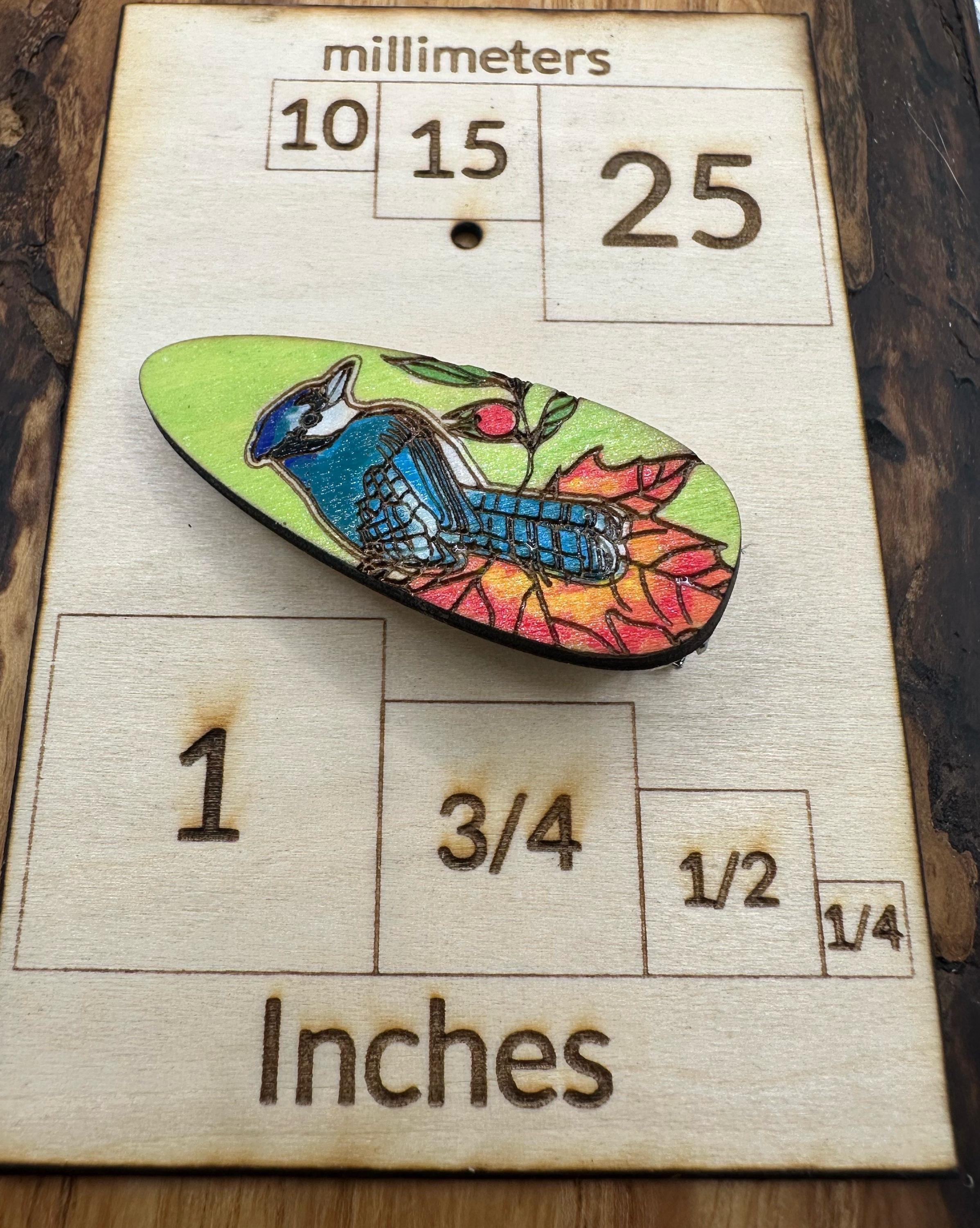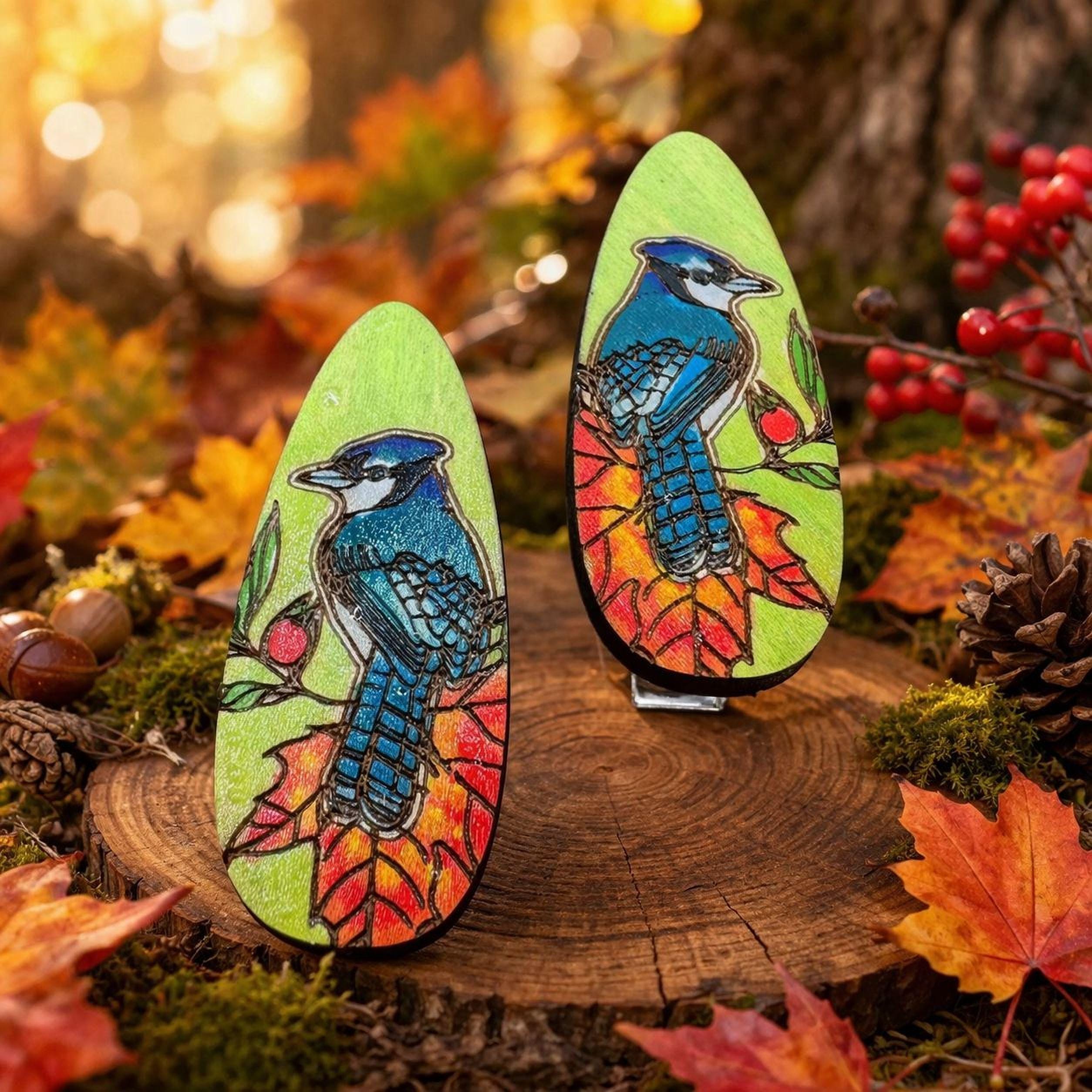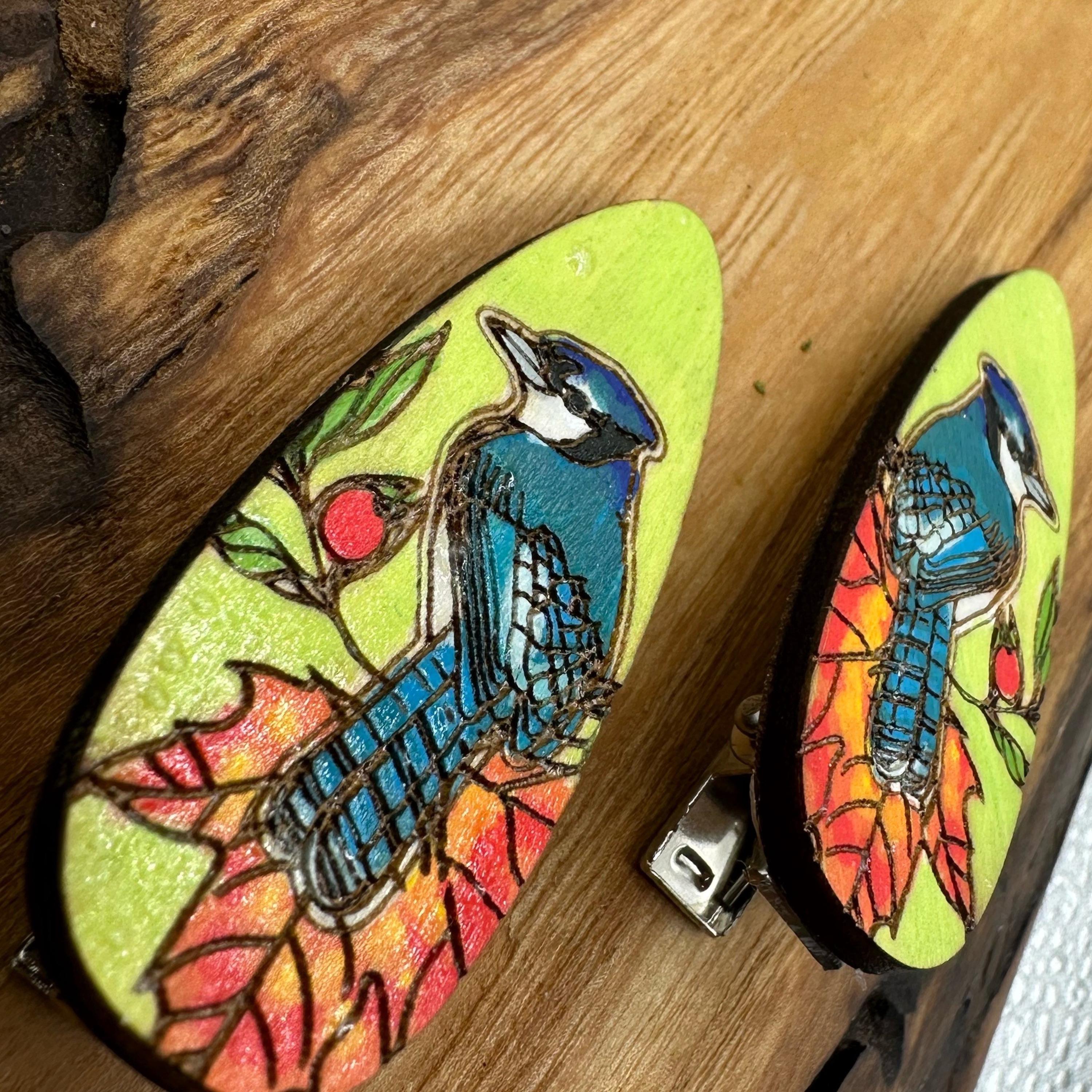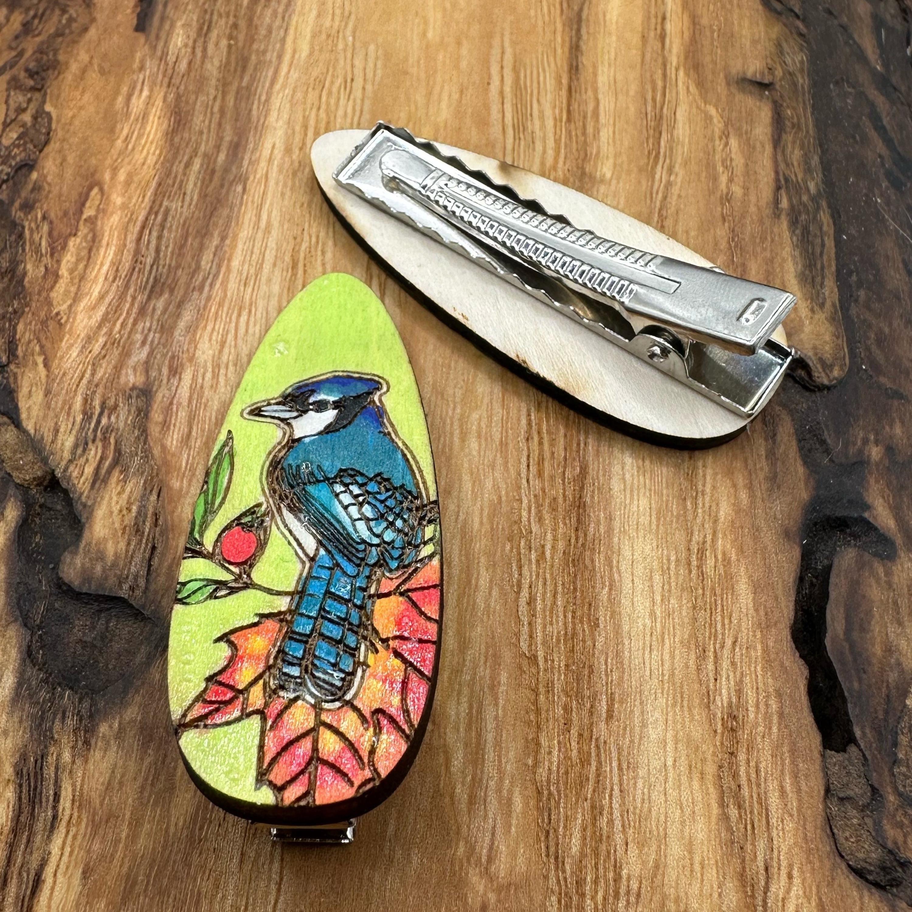 Discover the charm of nature with these hand painted blue jay hair clips, a perfect blend of boho nature inspired style and wearable art gift appeal. Each clip features a delicate woodland themed design, laser cut from American basswood and meticulously hand painted to bring the vibrant bird to life. Lightweight and unique, these forest creature clips add a quirky cottagecore touch to any look.