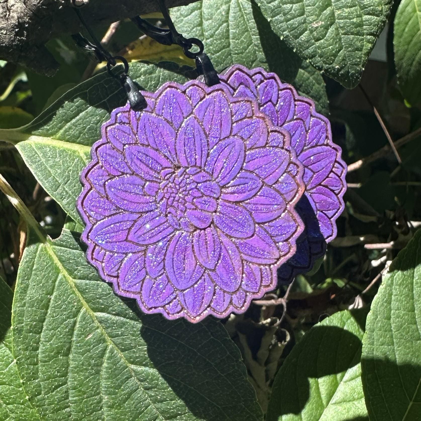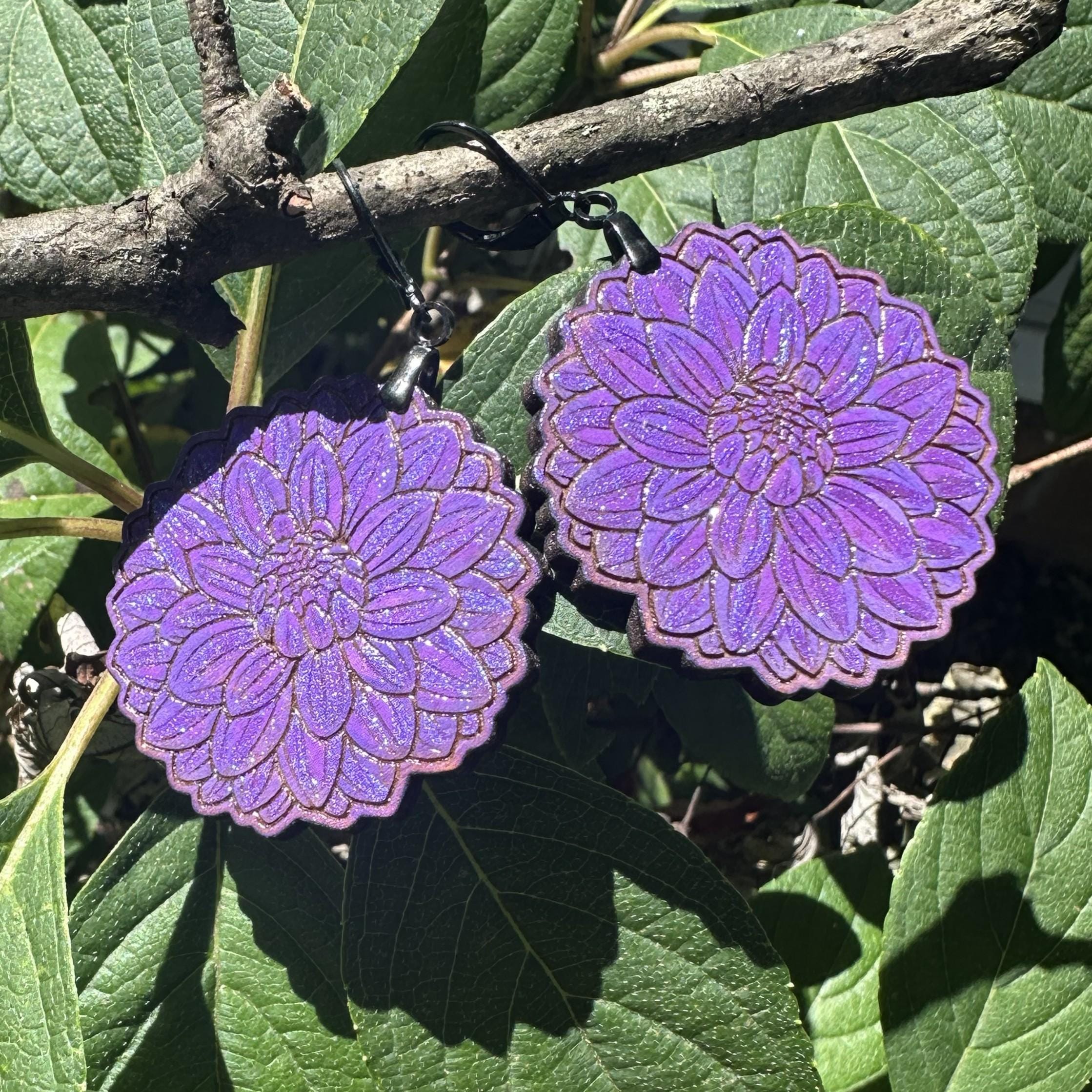 Bring a burst of garden magic to your day with these hand-painted purple dahlia earrings! Each pair is illustrated, laser-cut, and painted by hand in my small Kentucky studio. The vibrant purple tones shimmer with iridescent glitter, catching the sunlight beautifully while staying ultra-lightweight for all-day comfort.