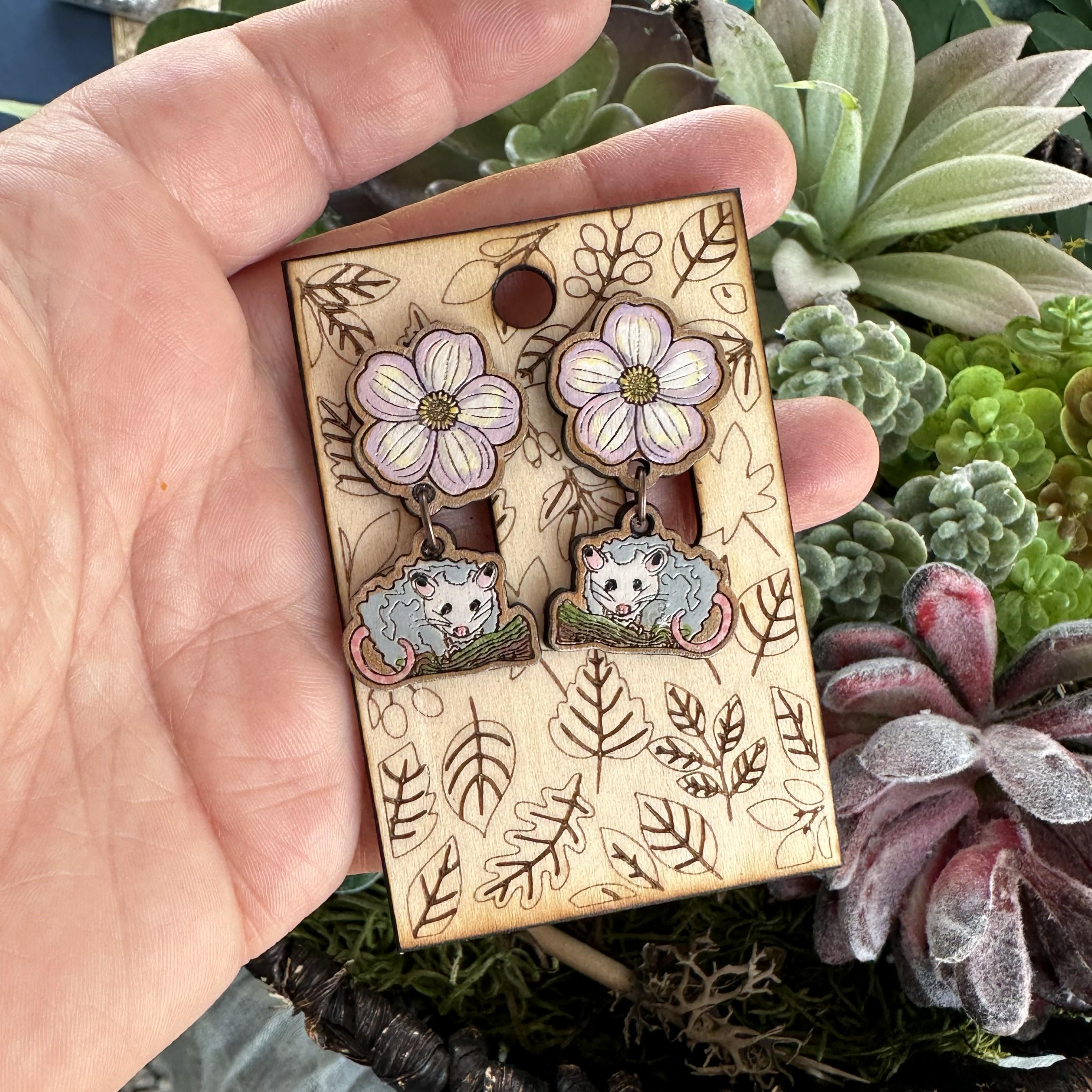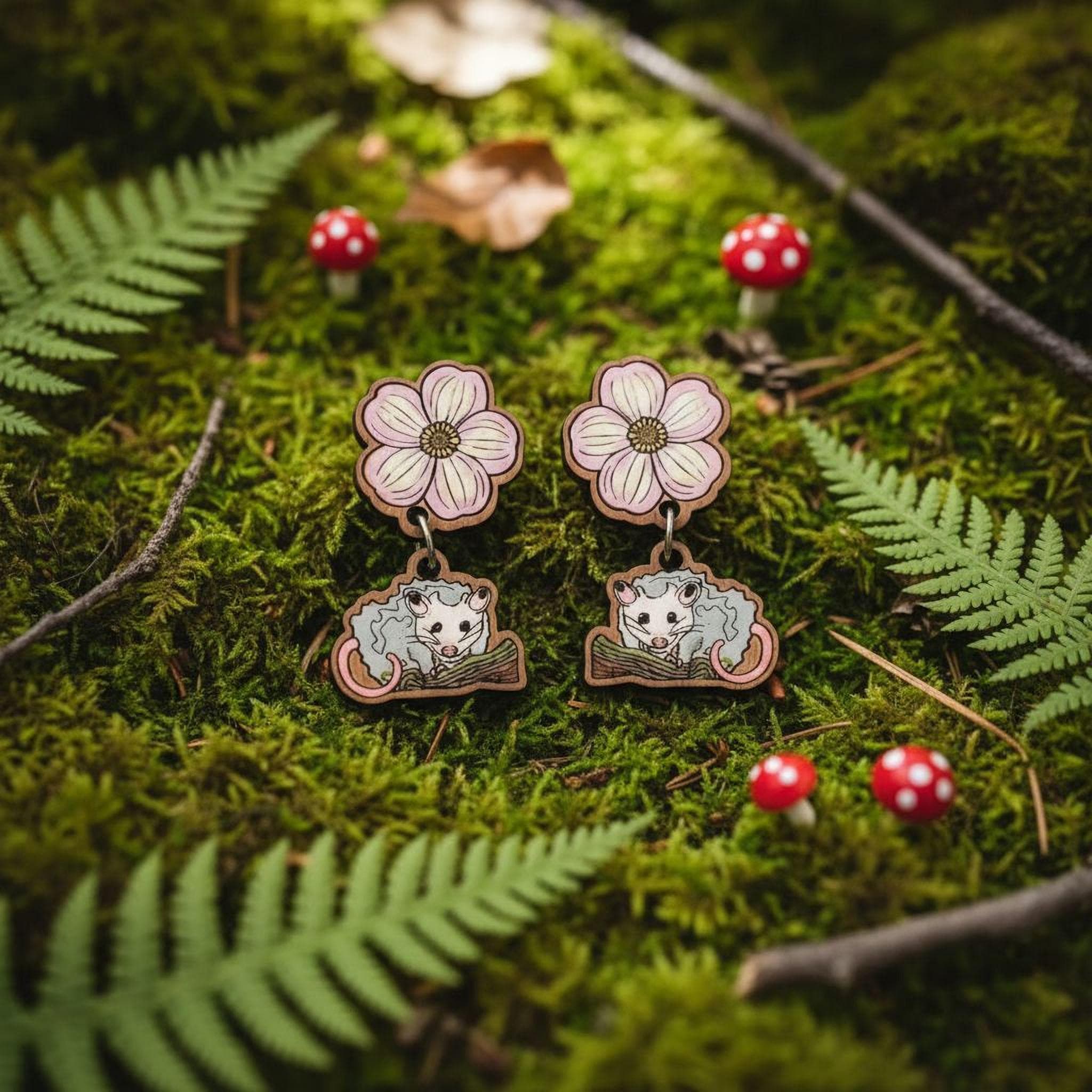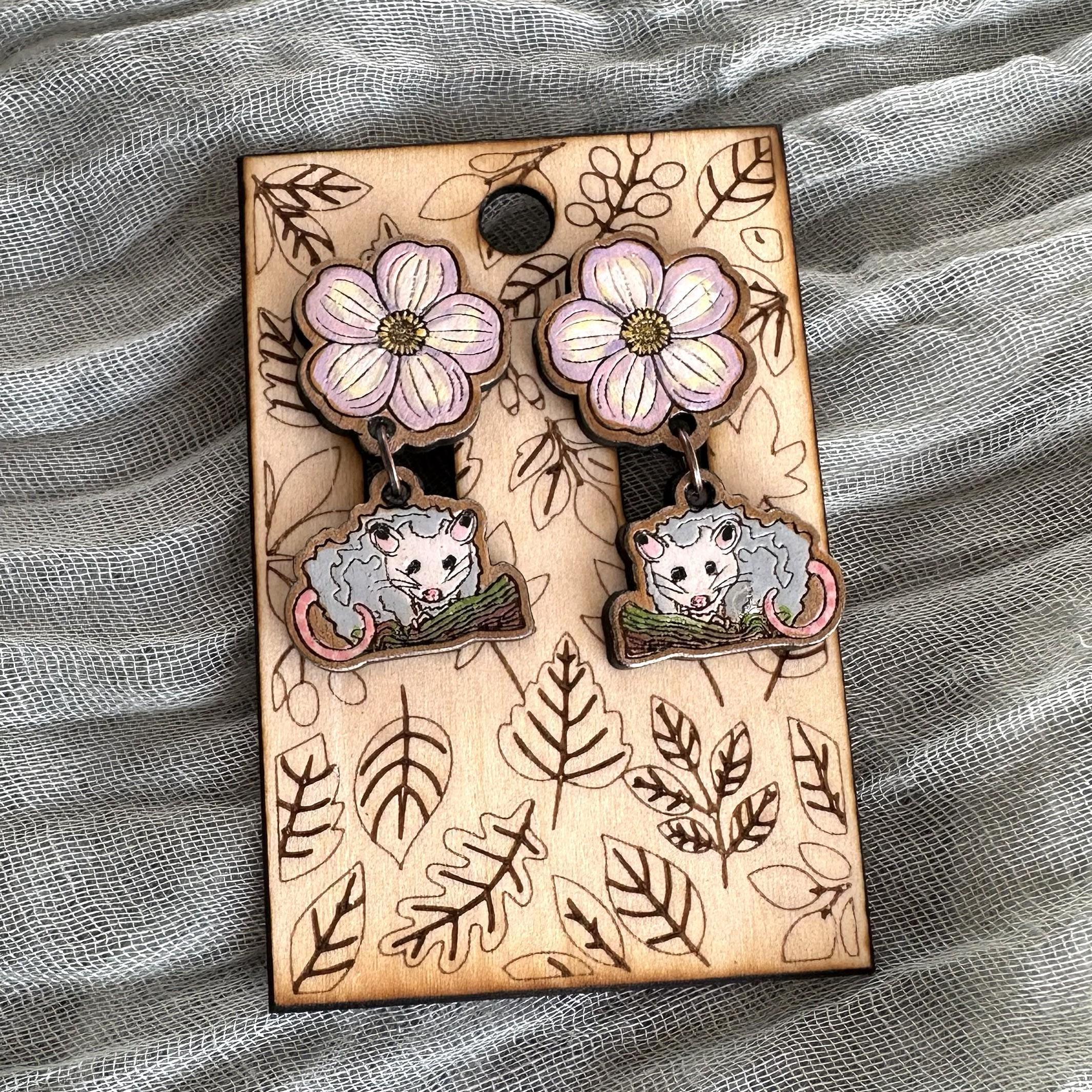 These charming opossum and spring beauty flower earrings bring the sweetest touch of the forest floor to your everyday style! Each pair is designed, laser-cut, and hand-painted by me in my home studio, making every set a tiny one-of-a-kind artwork.