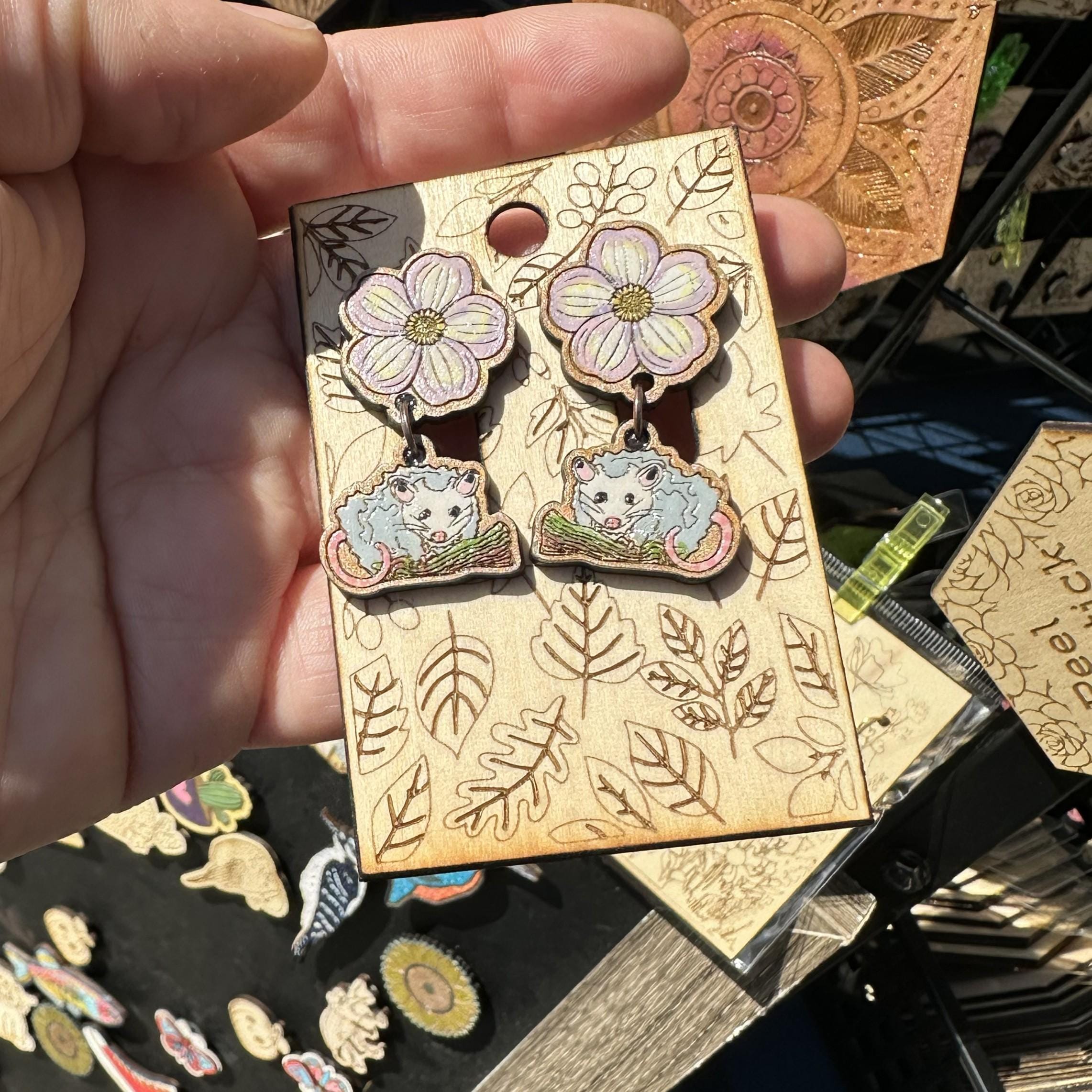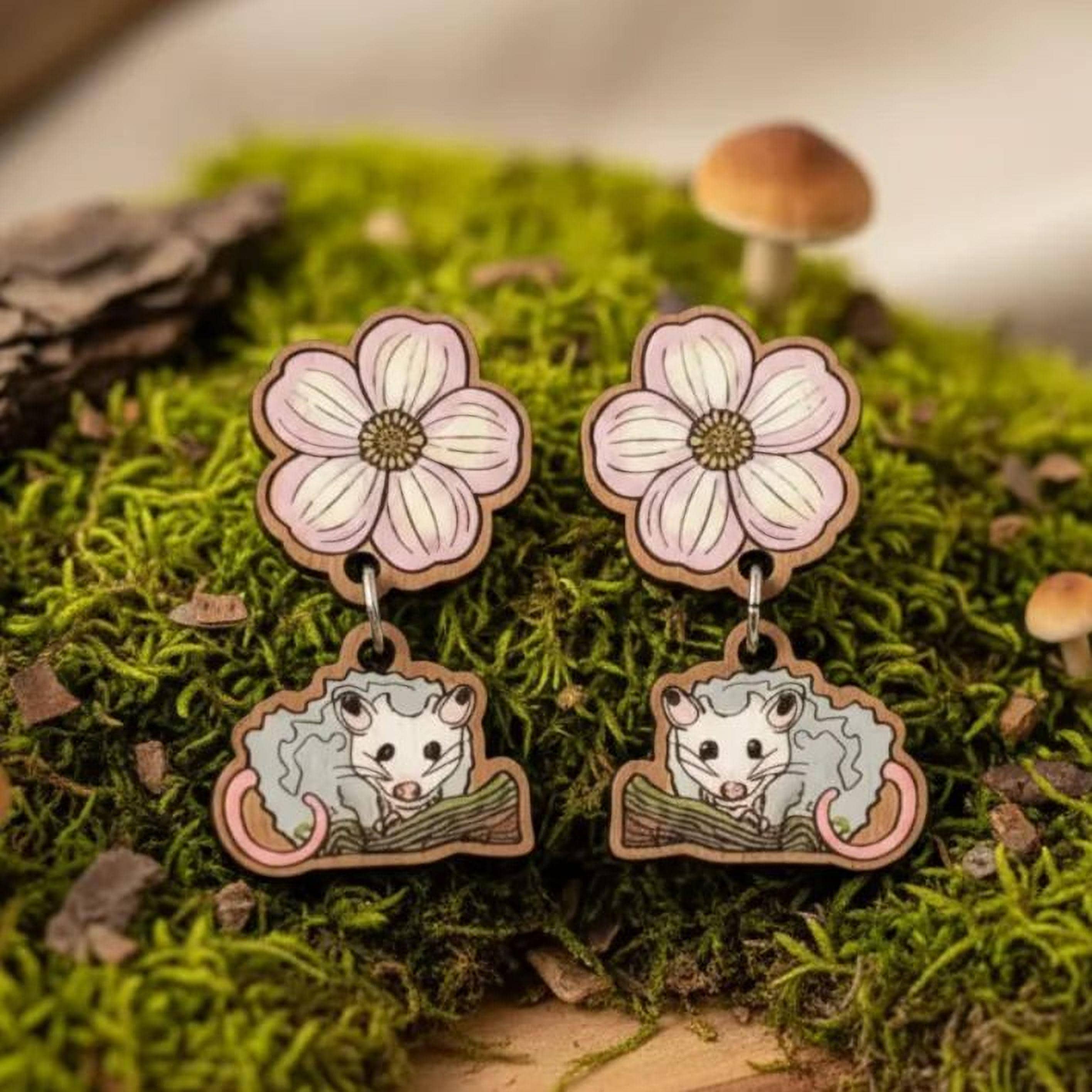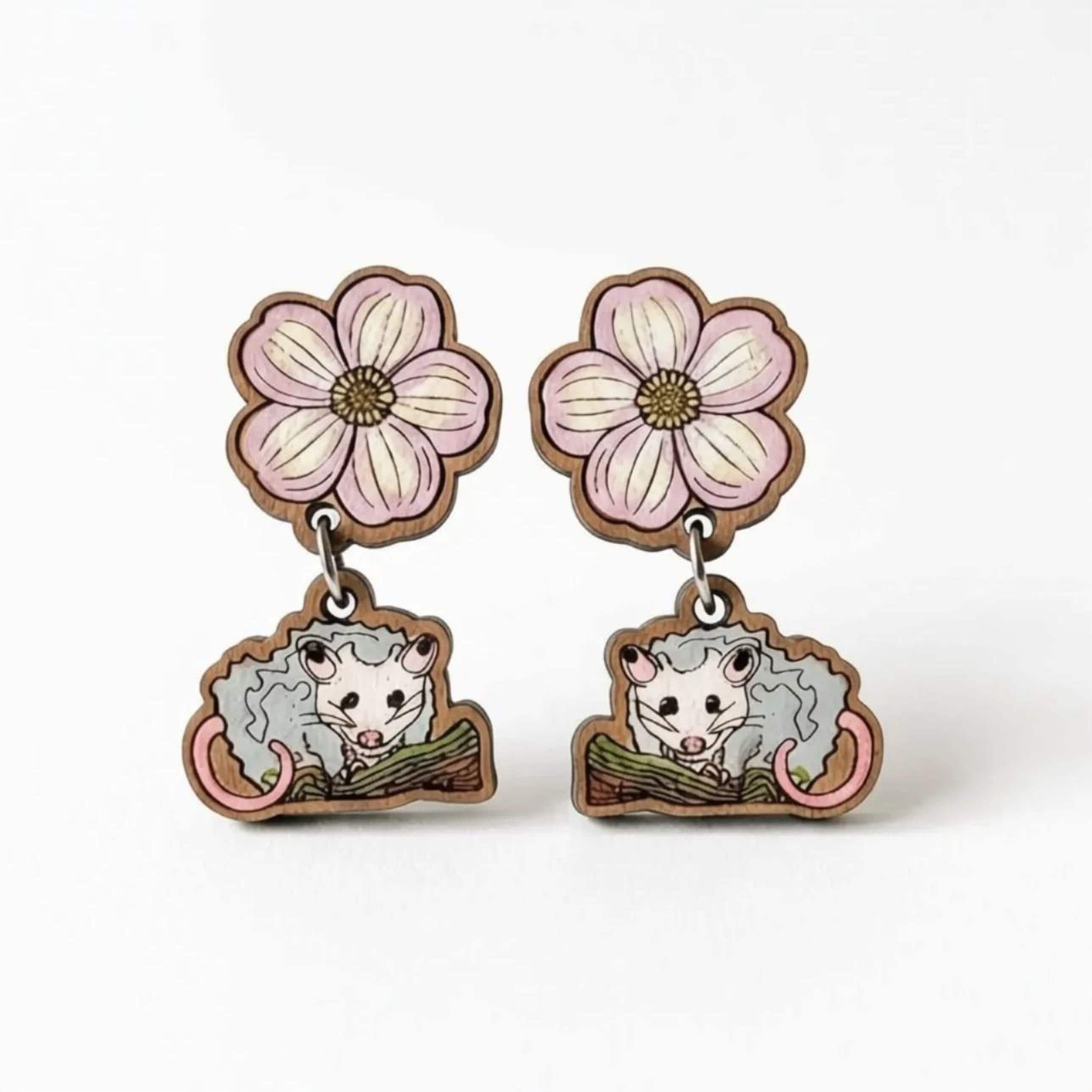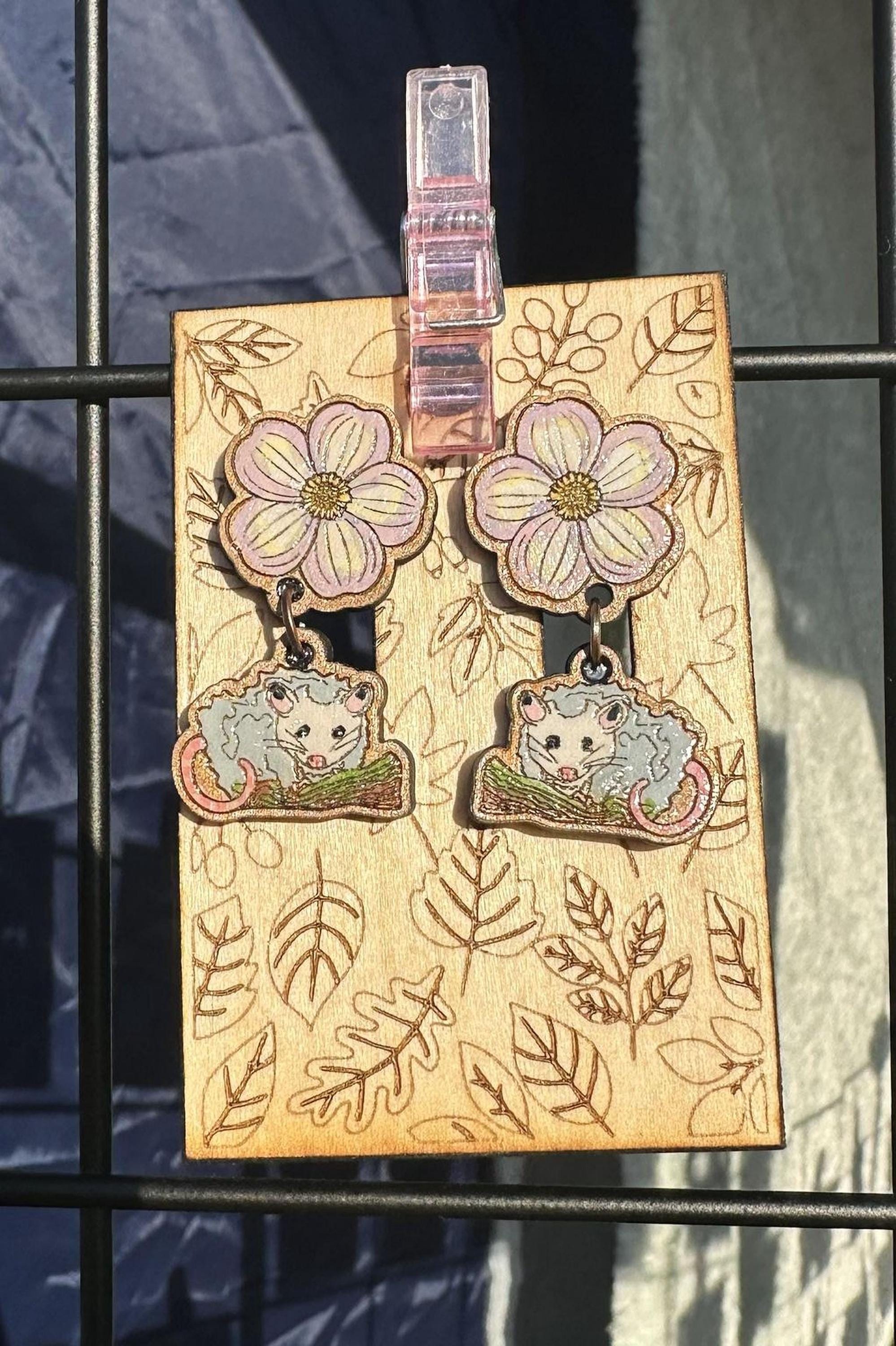 These charming opossum and spring beauty flower earrings bring the sweetest touch of the forest floor to your everyday style! Each pair is designed, laser-cut, and hand-painted by me in my home studio, making every set a tiny one-of-a-kind artwork.