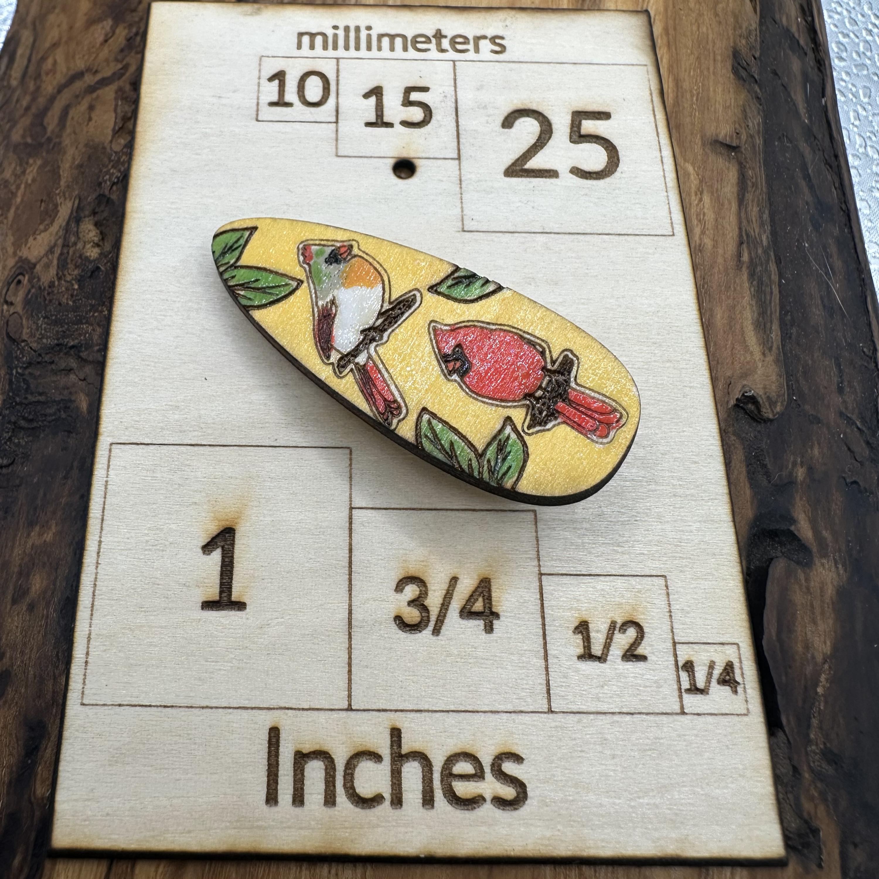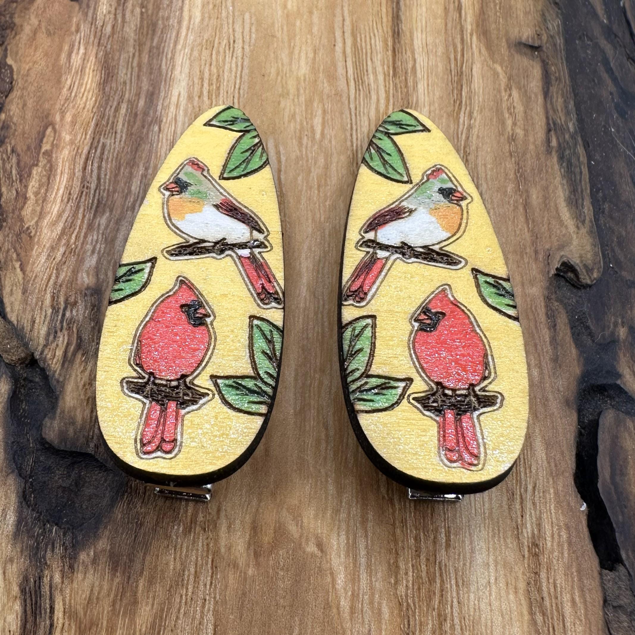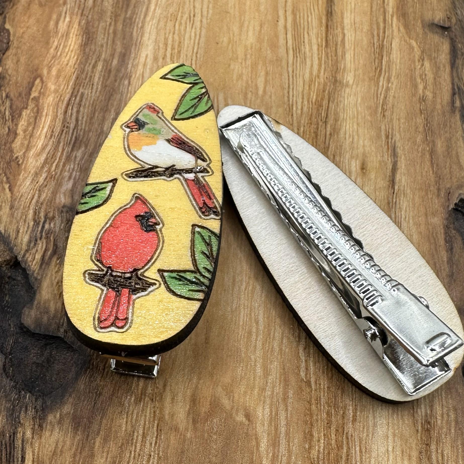 Get your hair out of your face with style with these hand painted, wood cardinal bird hair clips. Each piece starts out with an original drawing that’s laser cut/engraved from wood, and then hand painted.