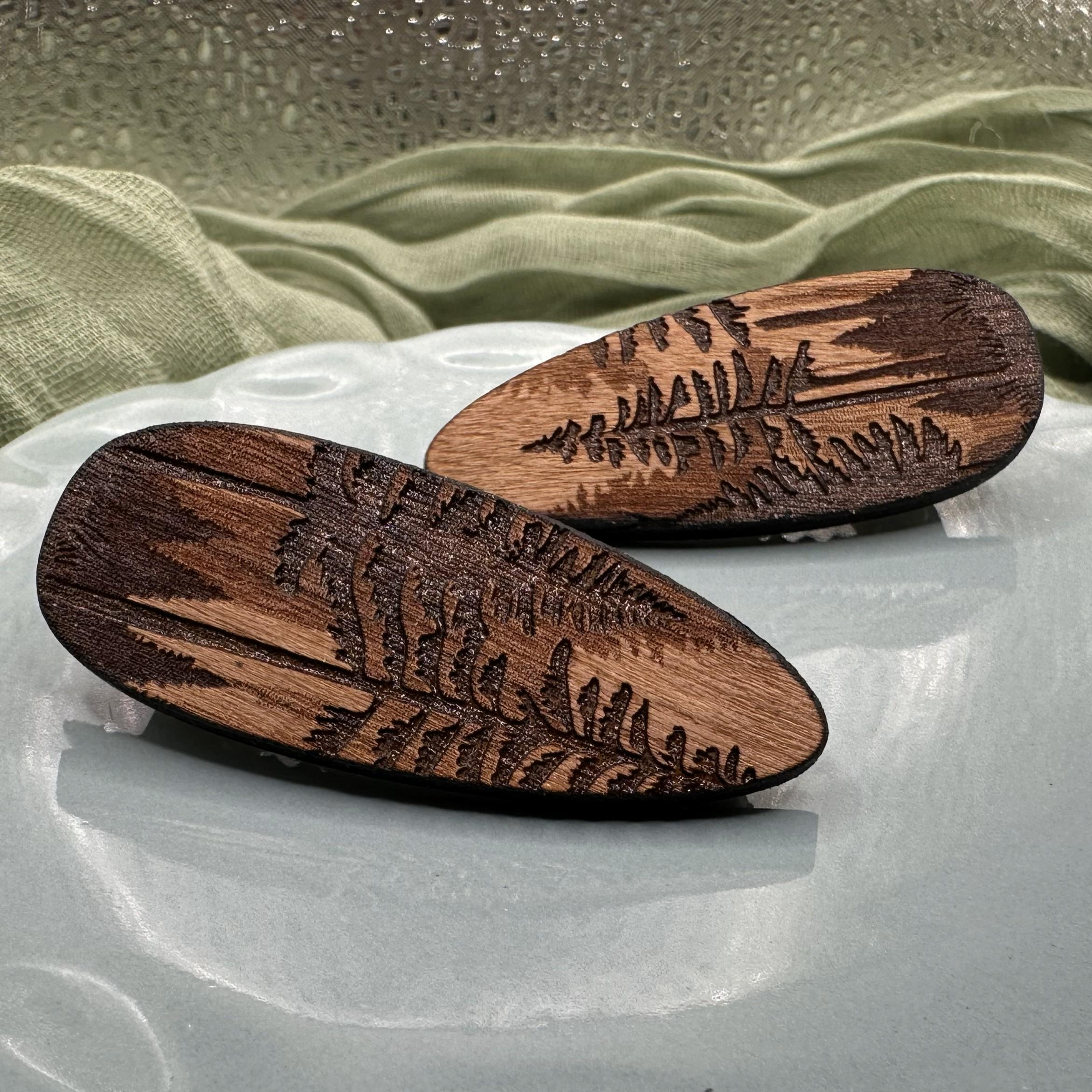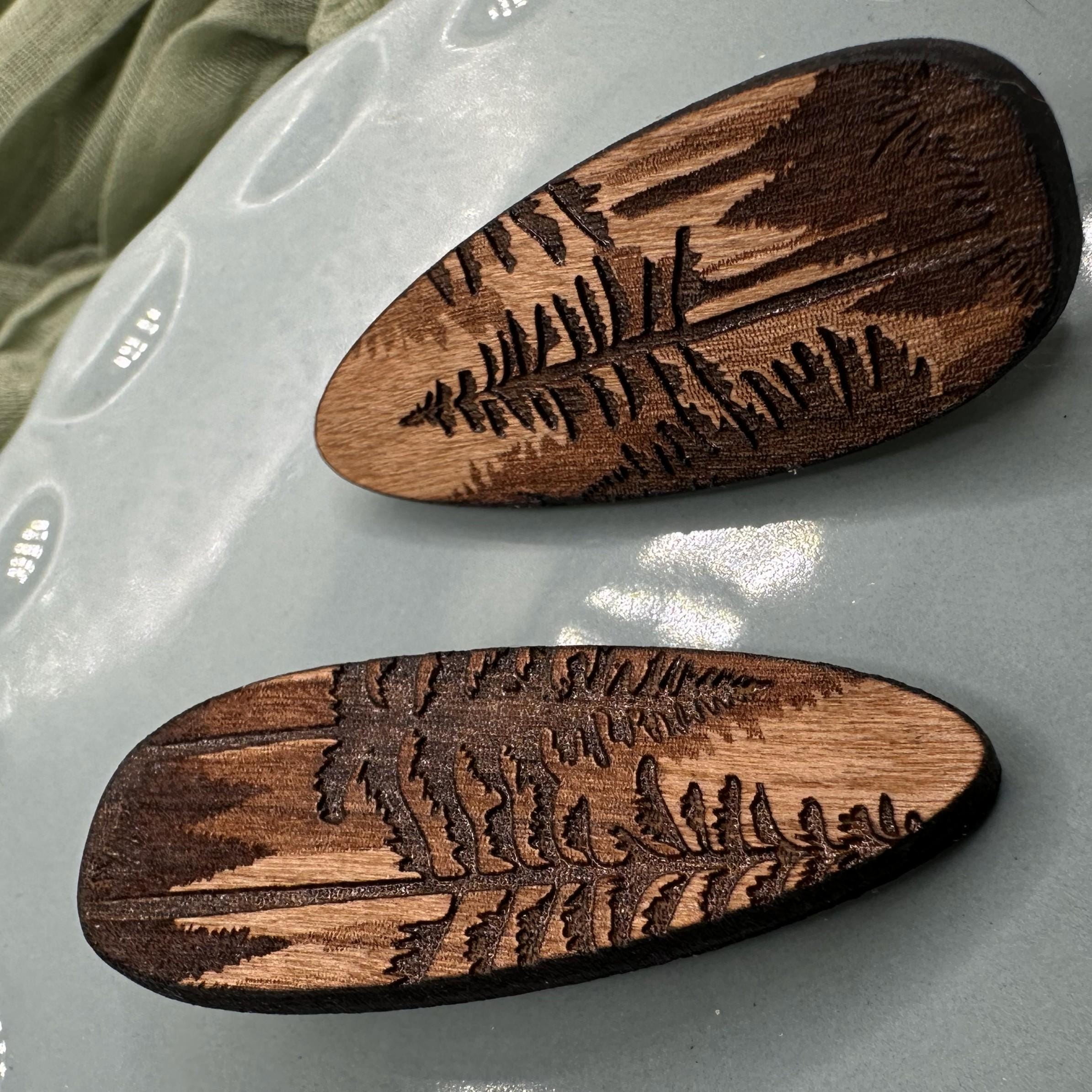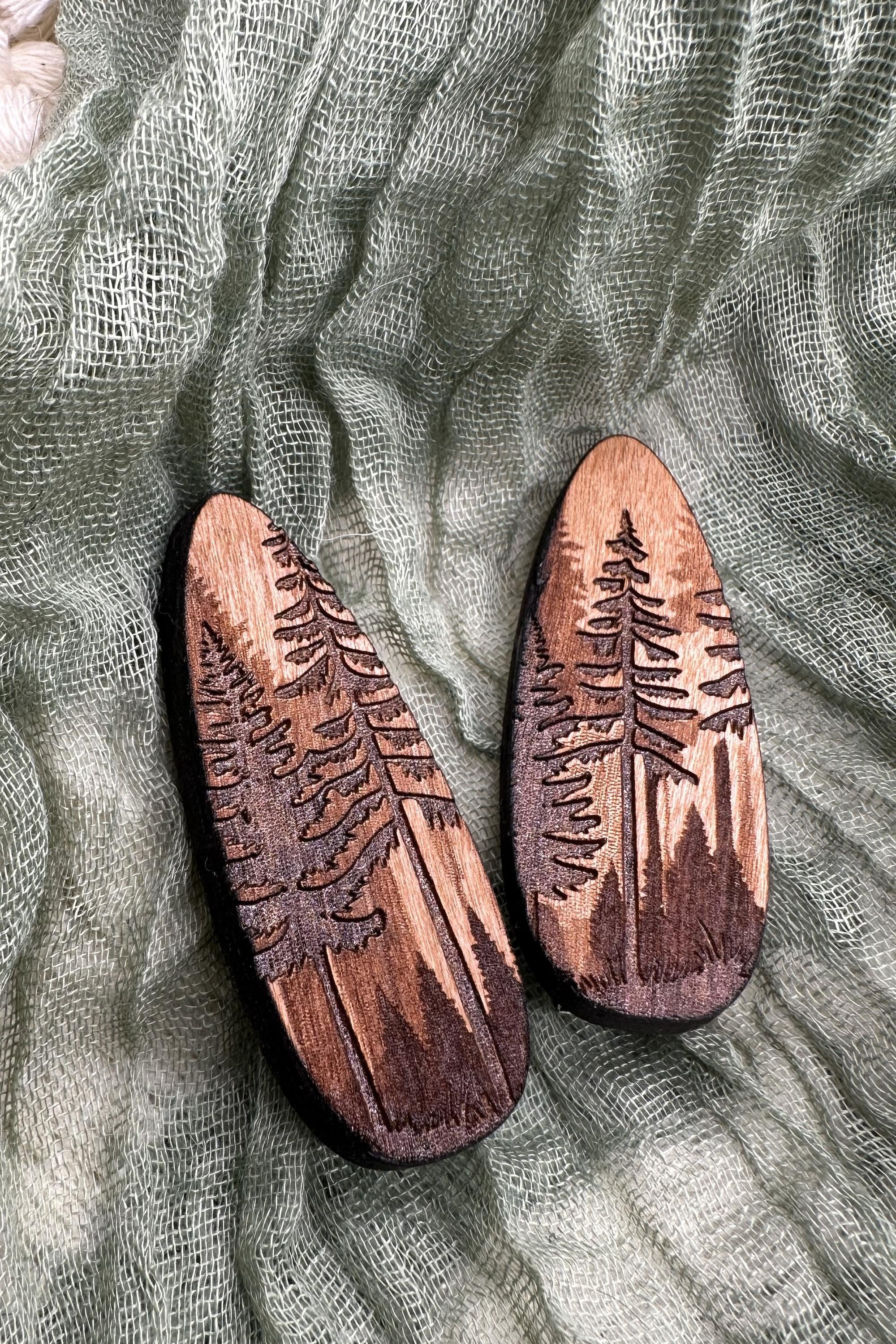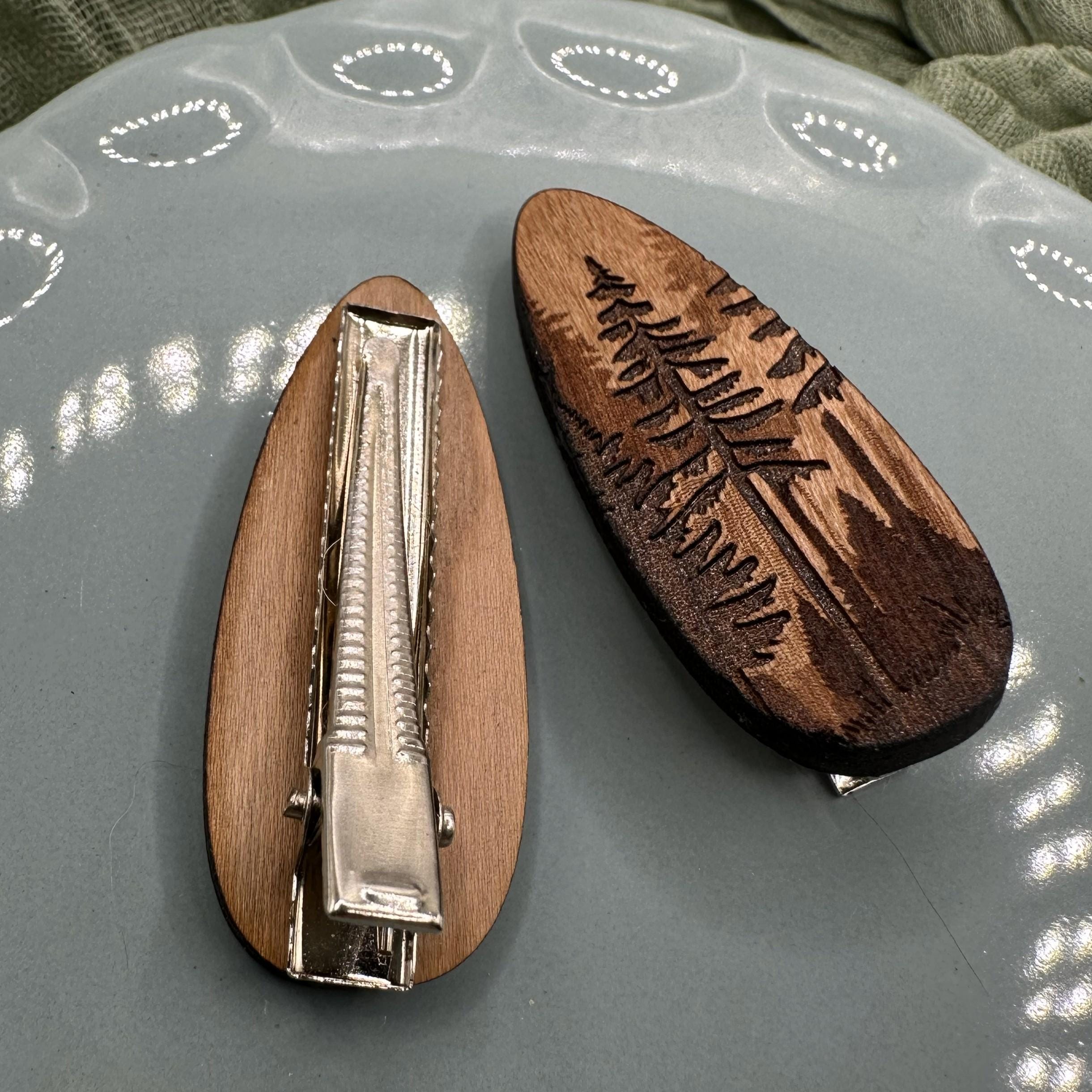 Bring a little forest calm to your everyday hair routine. This pine forest hair clip is laser engraved into rich cherry wood, featuring layered evergreen silhouettes and tall pines inspired by quiet woodland walks. Warm, earthy tones and natural wood grain make each clip beautifully unique.