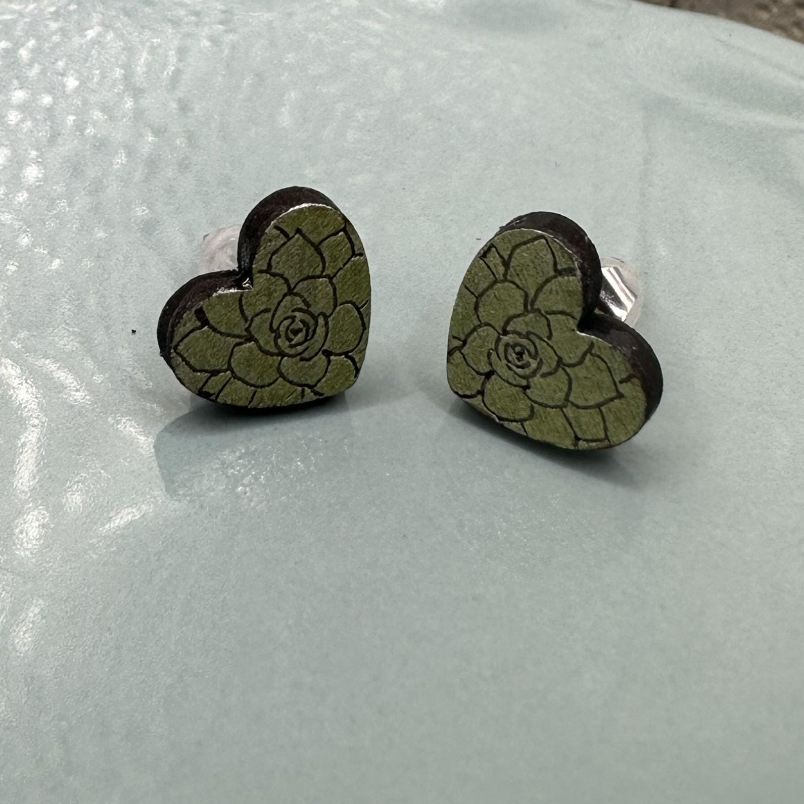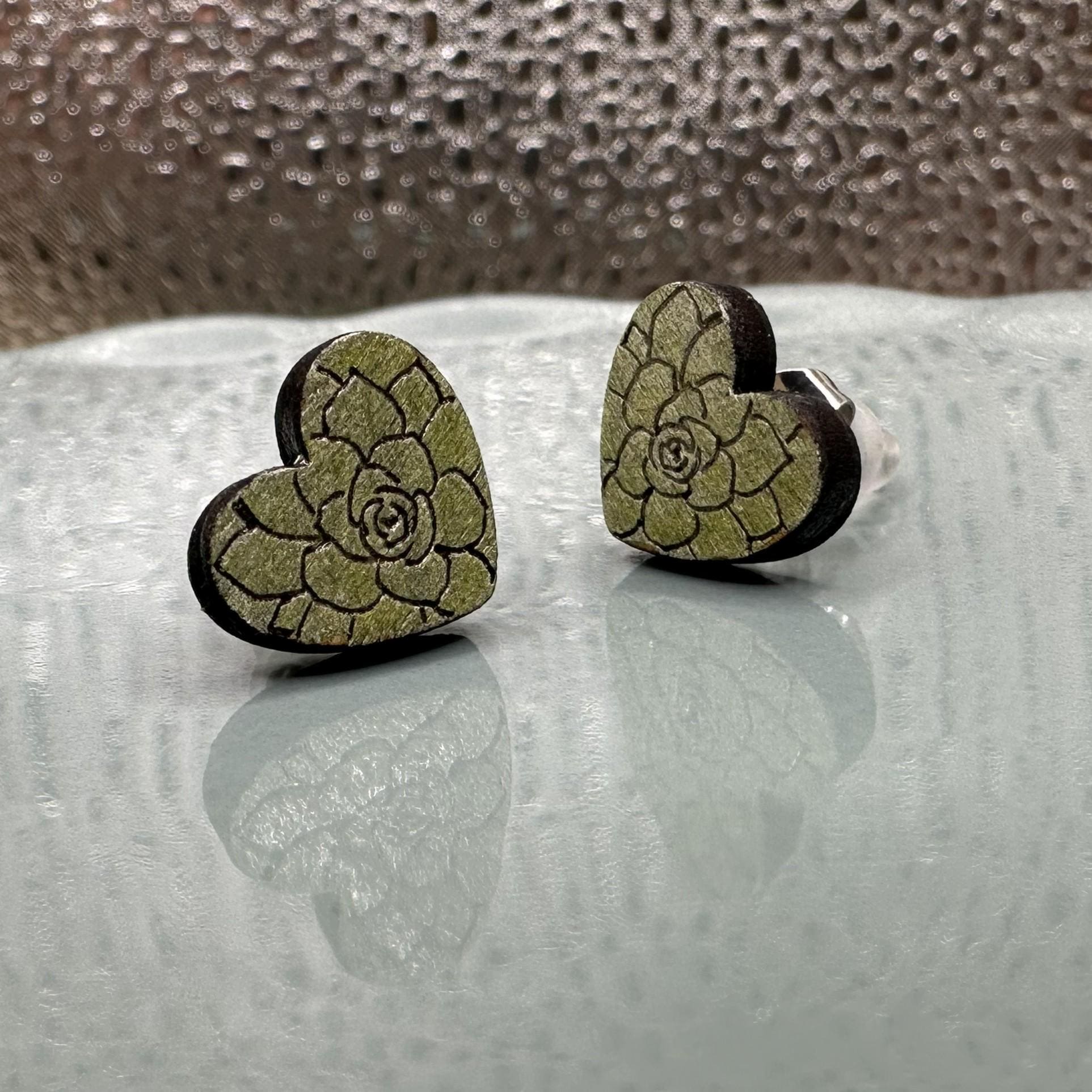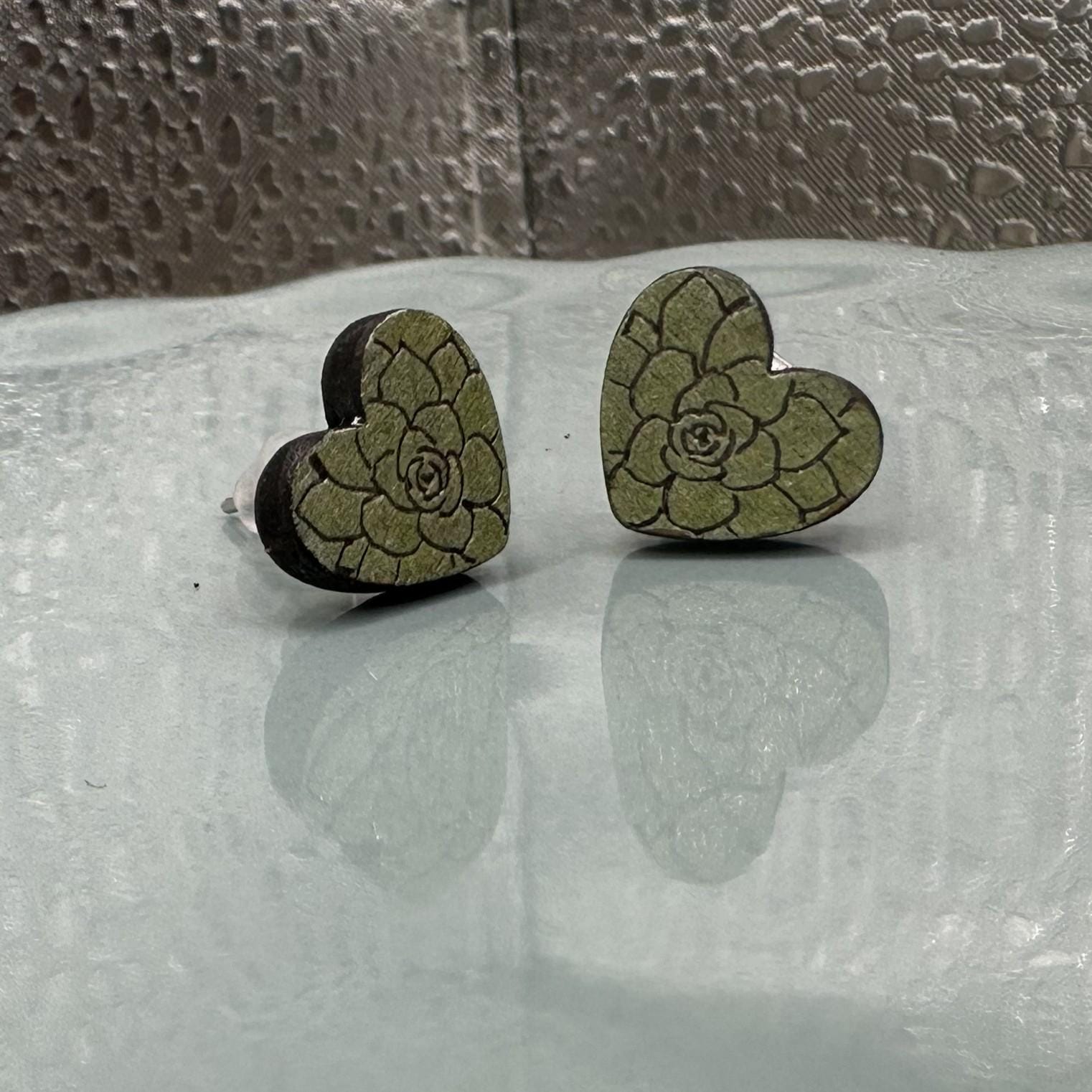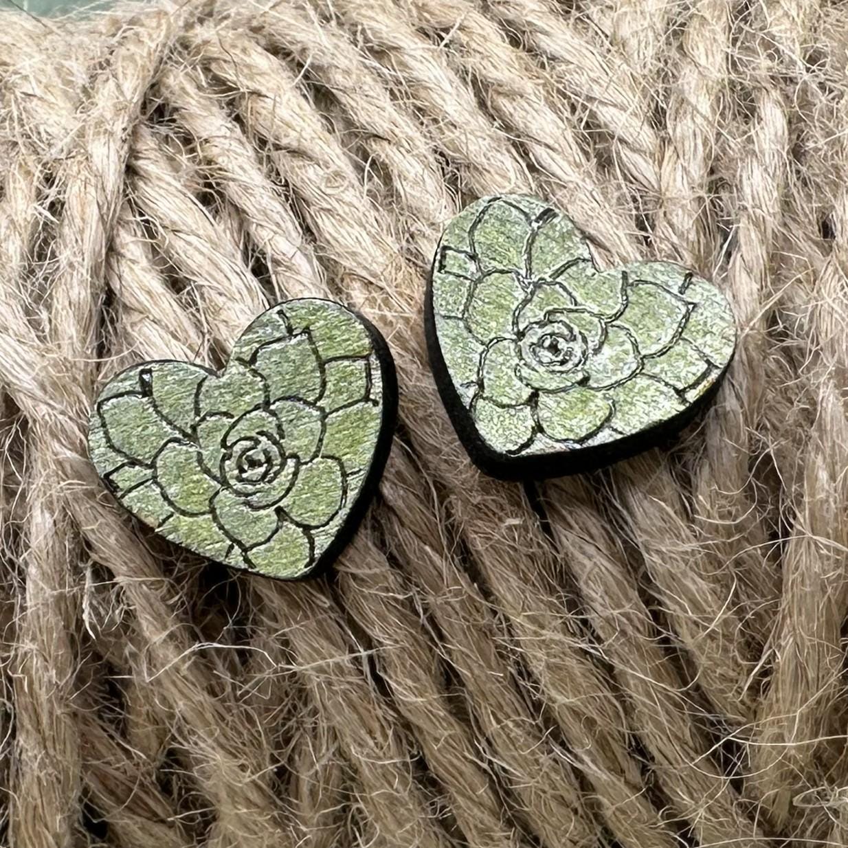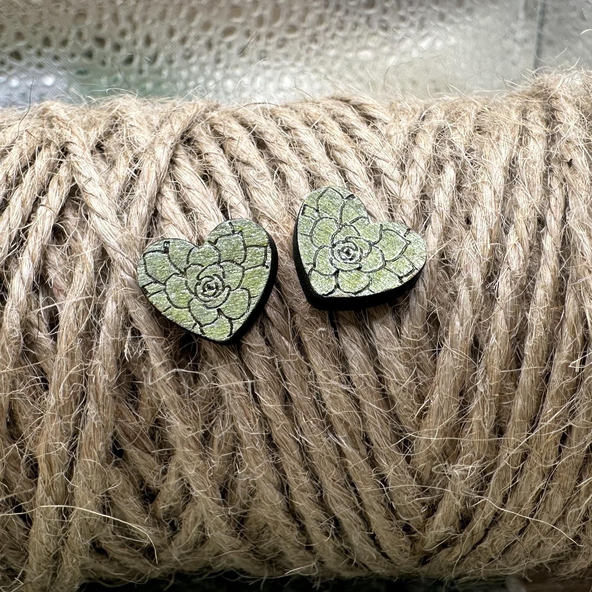 These sweet succulent heart stud earrings feature a delicate rosette design engraved into wood and hand-painted in a soft, earthy green. Lightweight, comfy, and full of plant-loving charm — perfect for everyday wear or gifting a fellow succulent fan.