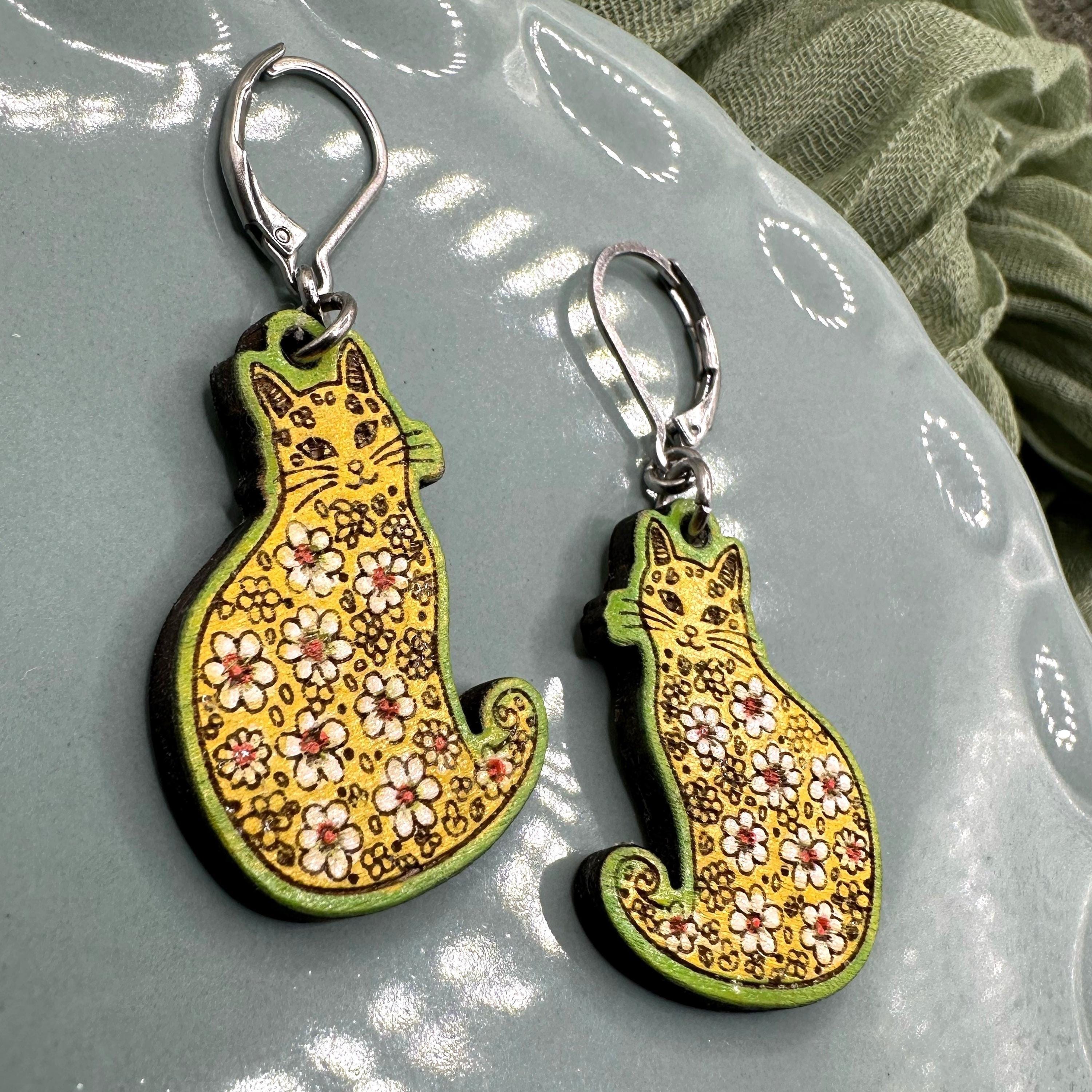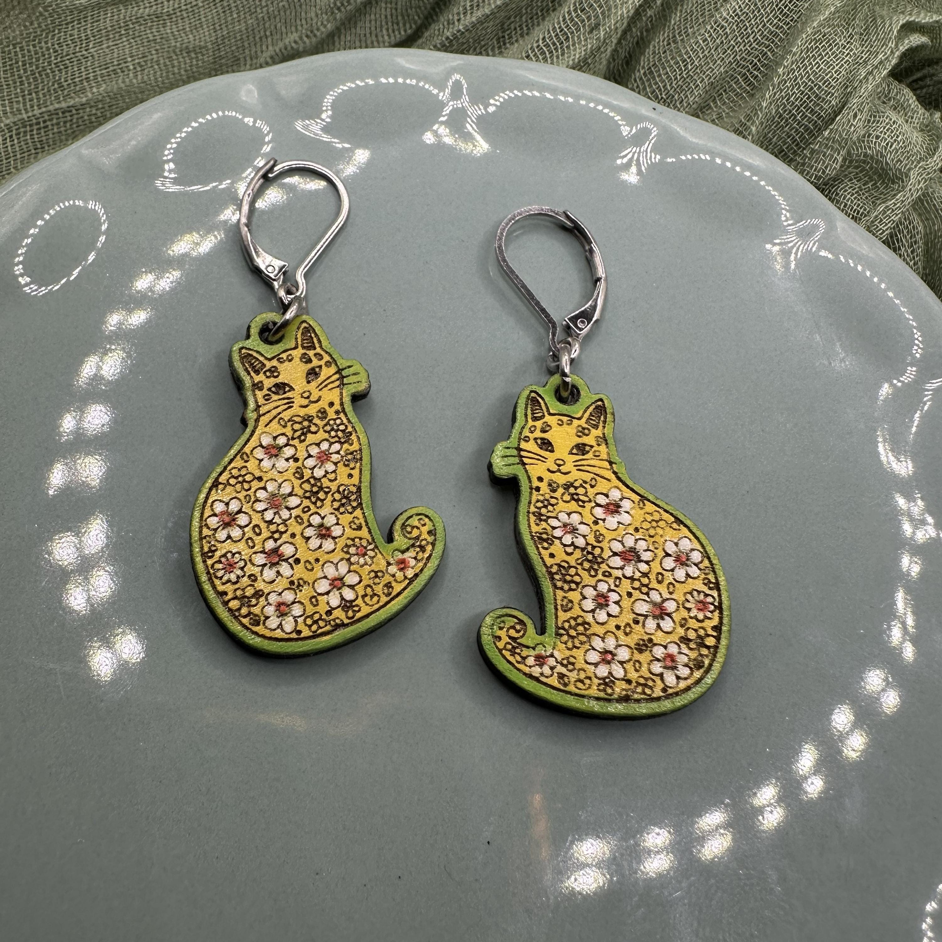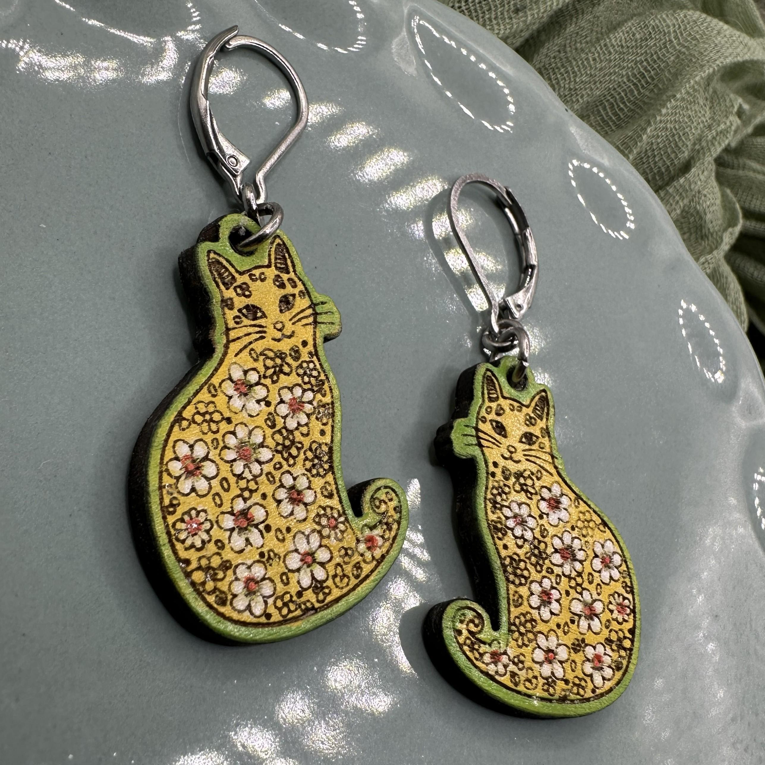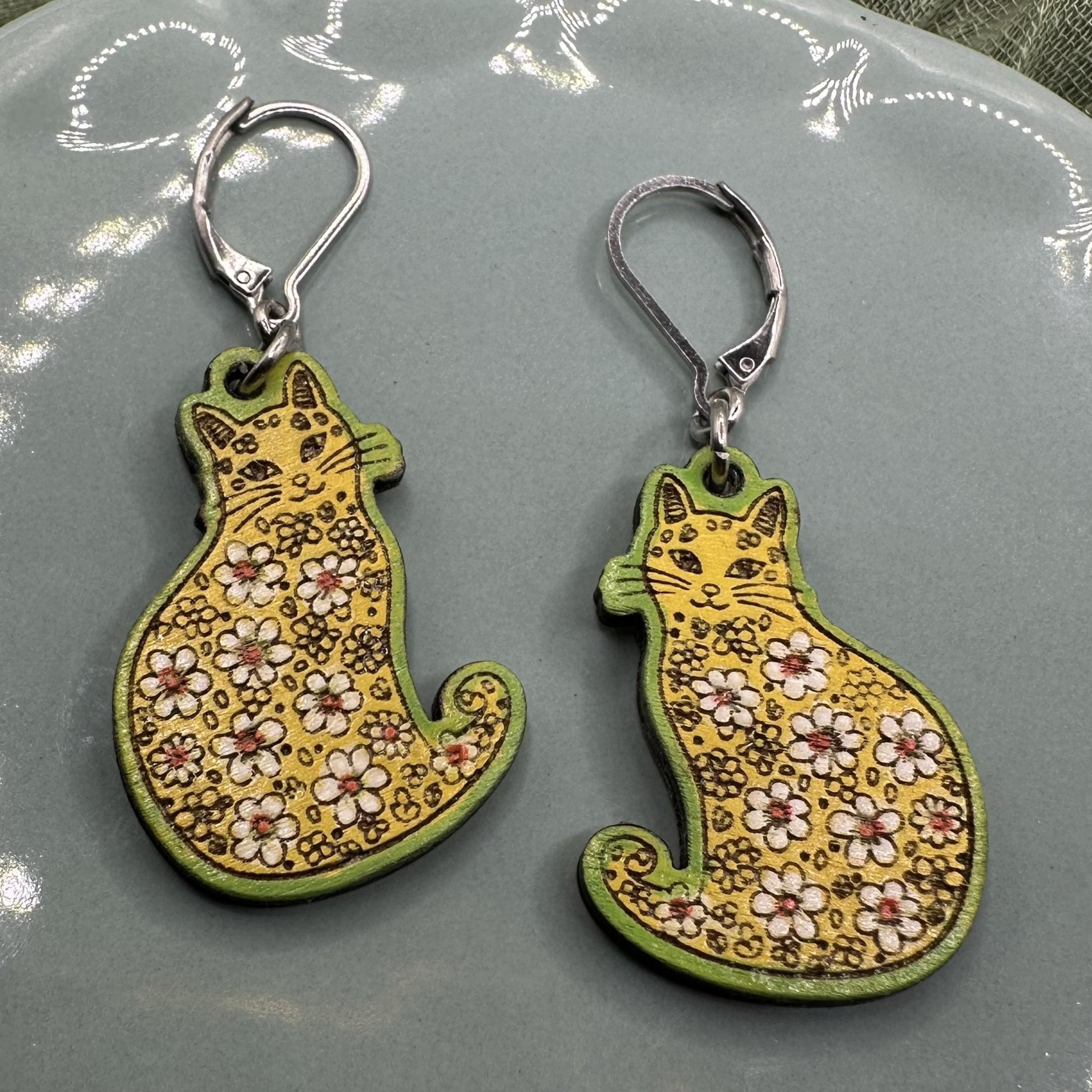 Celebrate the arrival of spring with these charming kitty earrings, beautifully blending floral cat motifs and whimsical artistry. Each pair is laser cut from lightweight American basswood and hand-painted in vibrant spring hues, making every set truly one of a kind. Designed with cat lovers and fans of spring earrings in mind, these playful accessories add a touch of joy to any outfit.