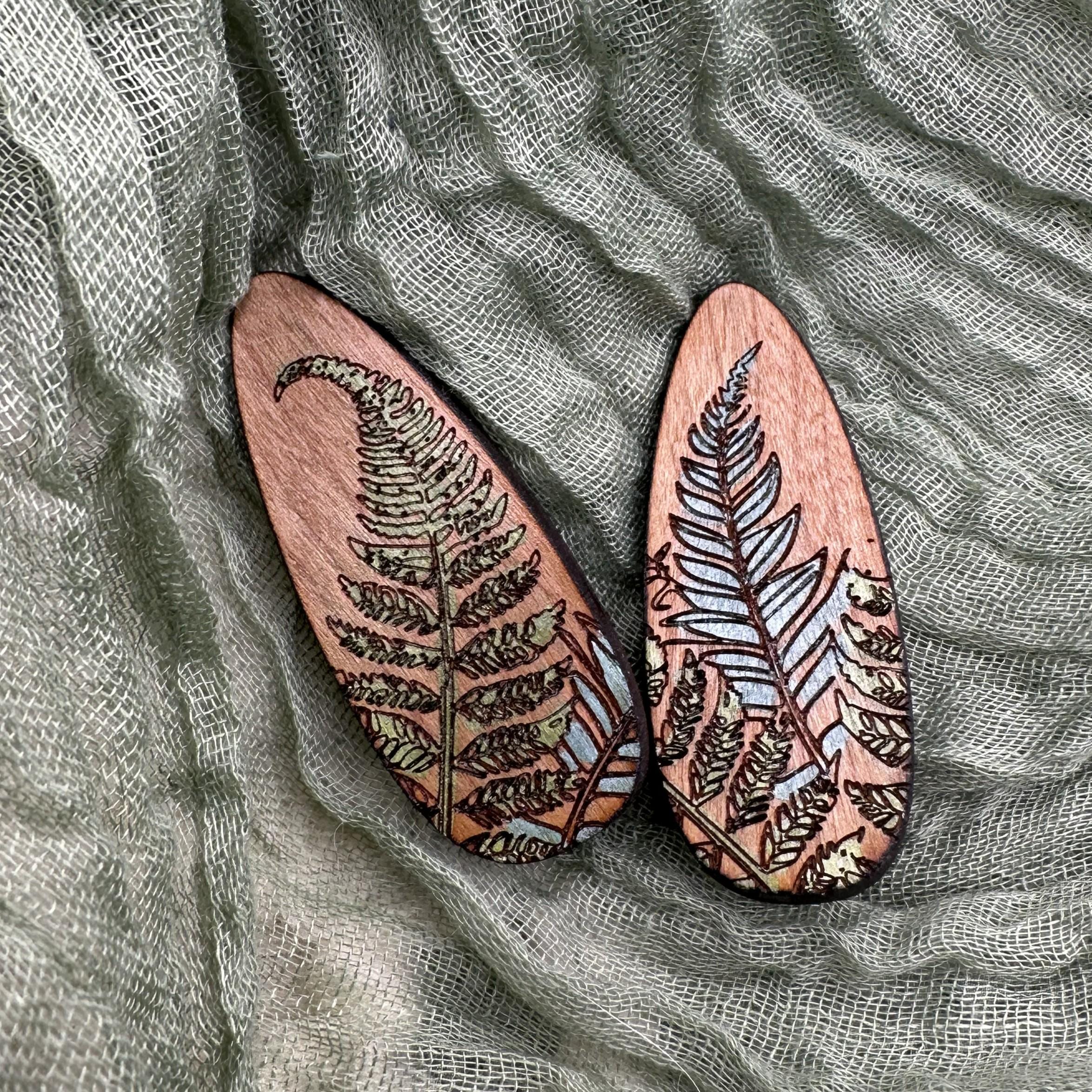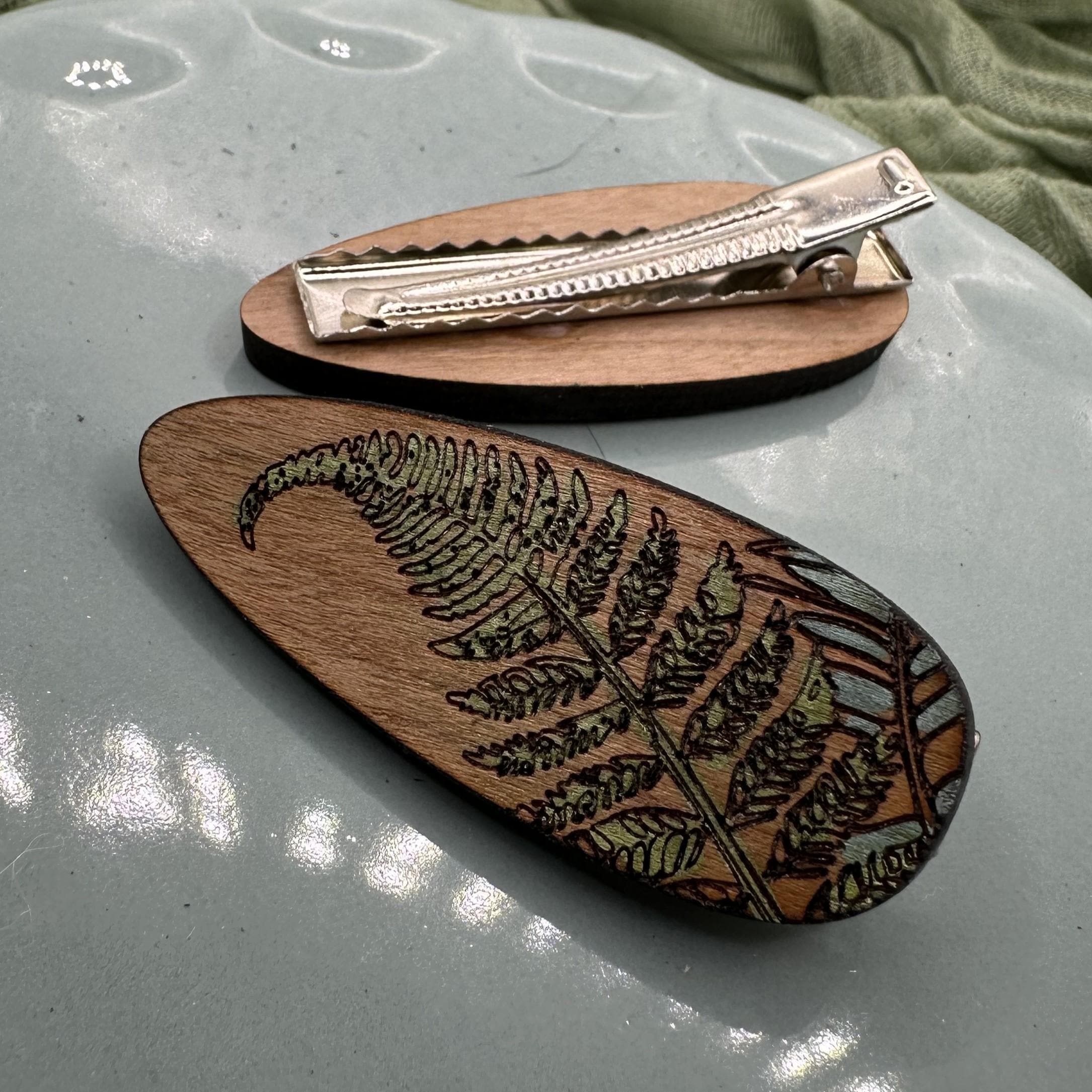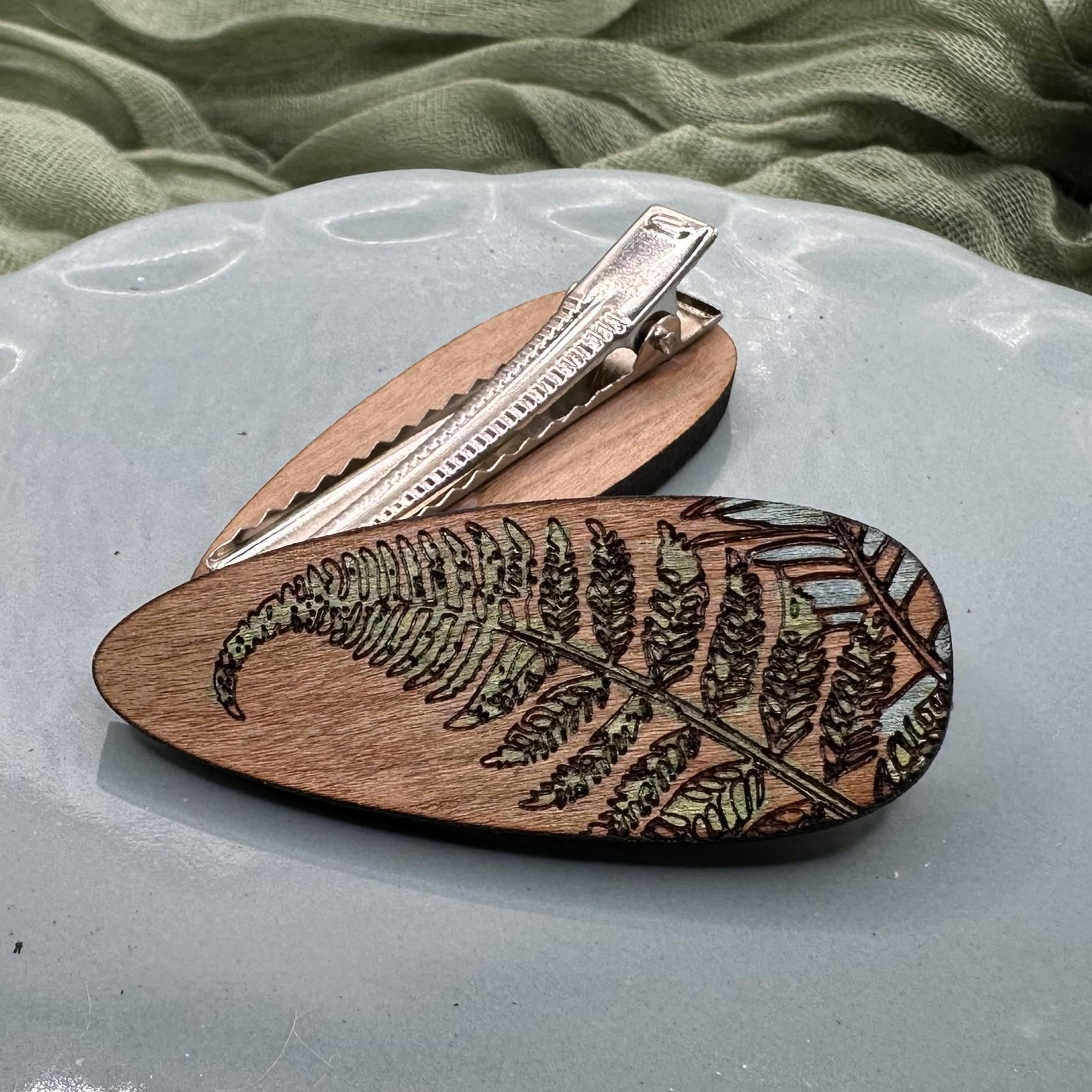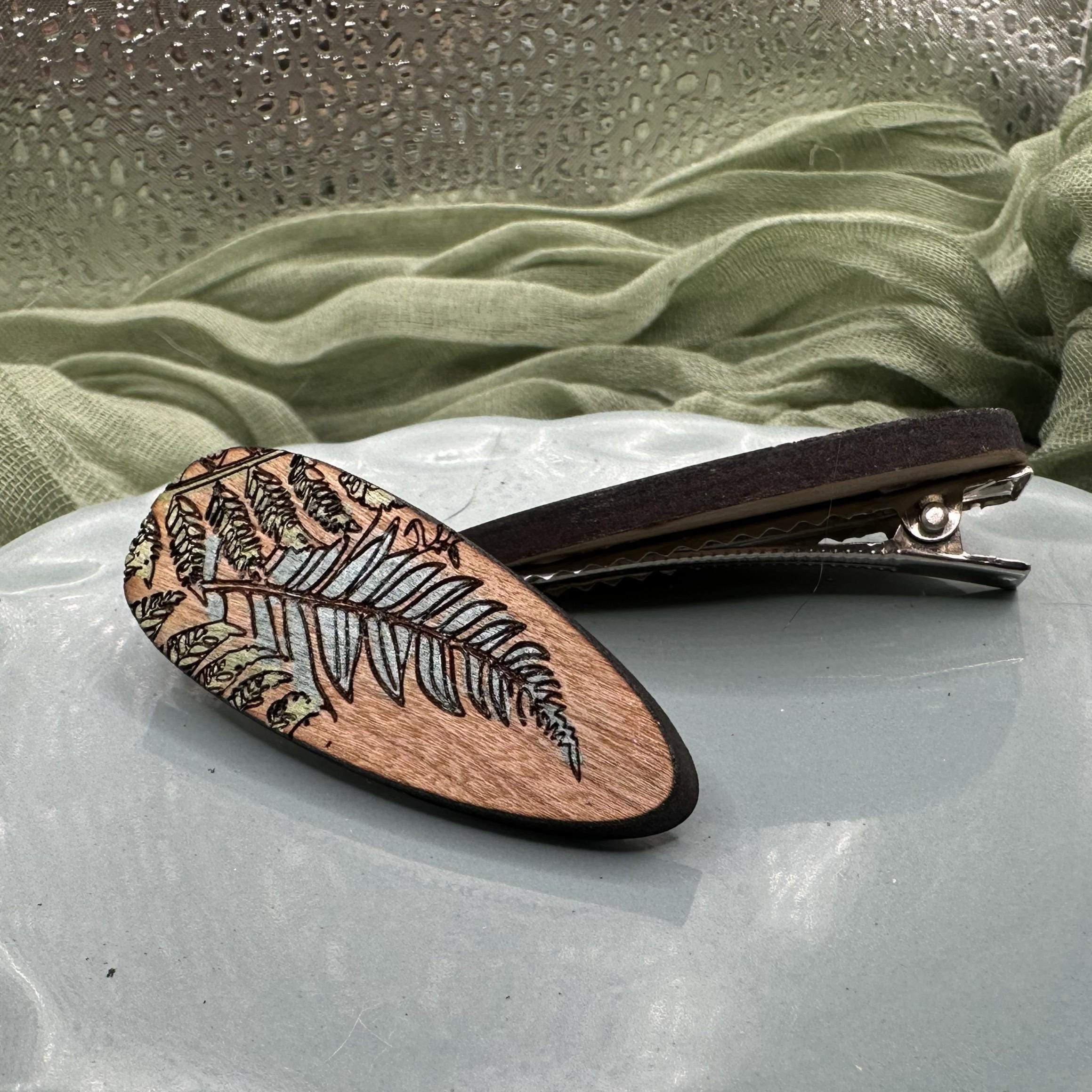 This cherry wood hair clip features an engraved fern design, hand-painted to highlight the leafy details. It’s lightweight, easy to wear, and finished with a stainless steel alligator clip that holds comfortably all day.