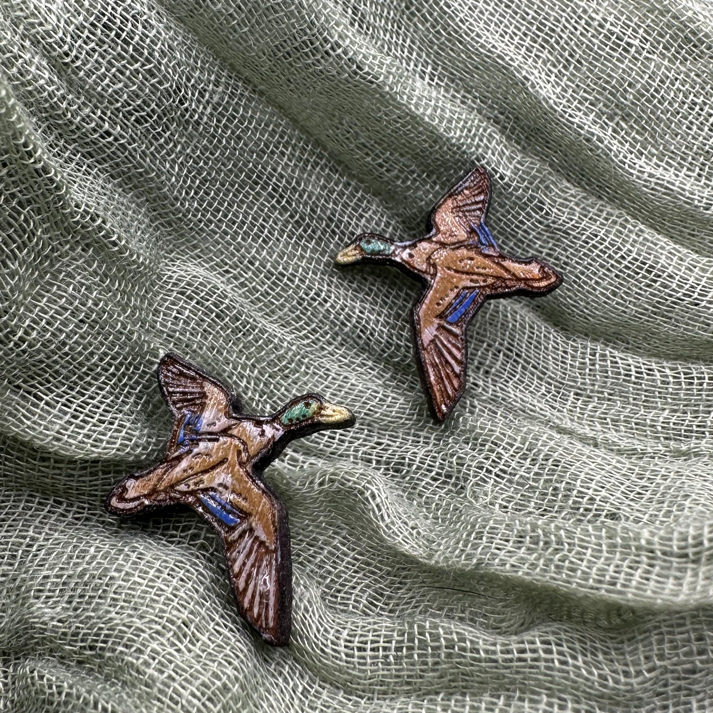 These stud earrings are based on my original artwork, laser cut from lightweight American basswood, and hand-painted to highlight those classic mallard colors—earthy browns, a pop of blue on the wings, and a hint of green on the head.