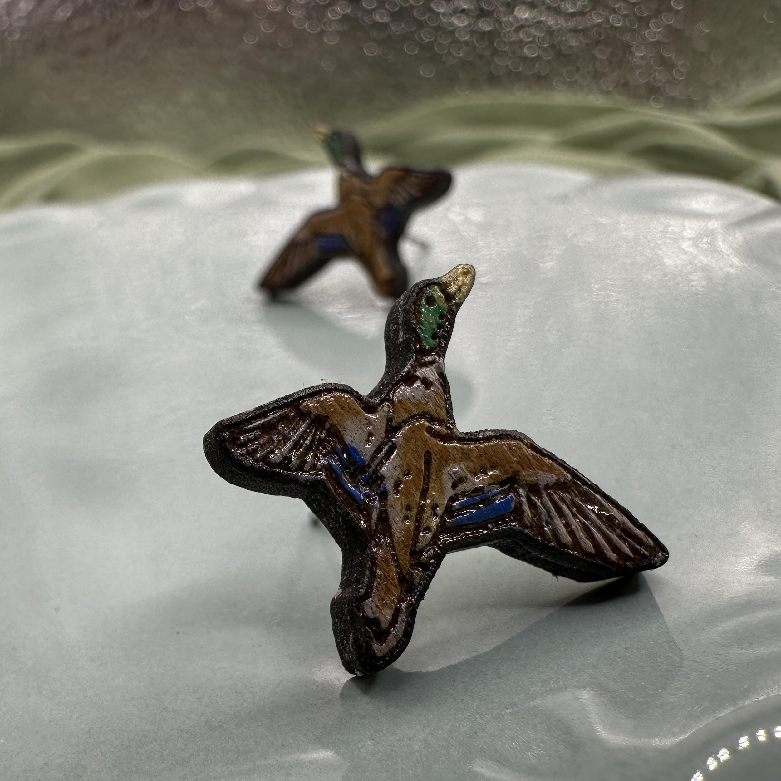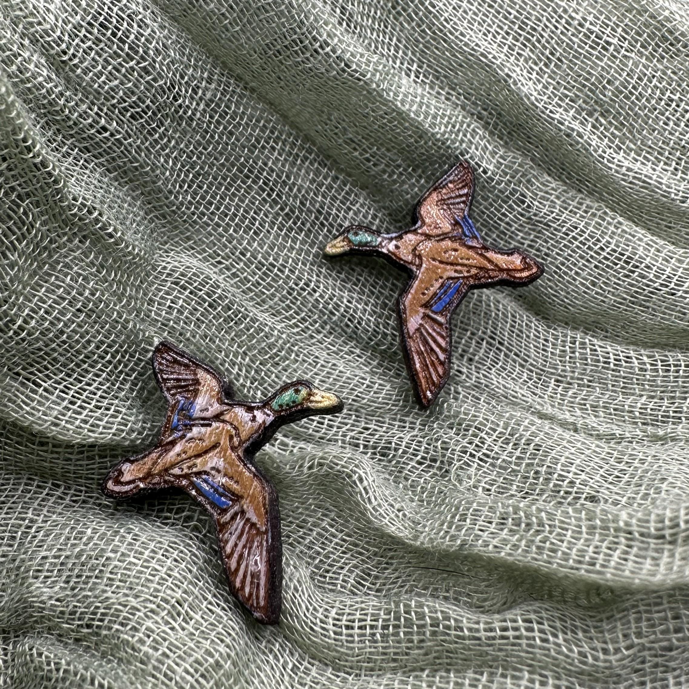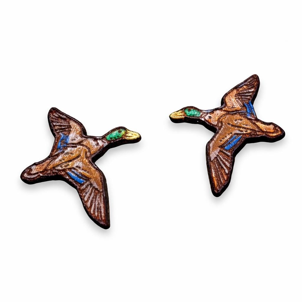 - Hand-painted wood studs featuring original artwork of flying mallards