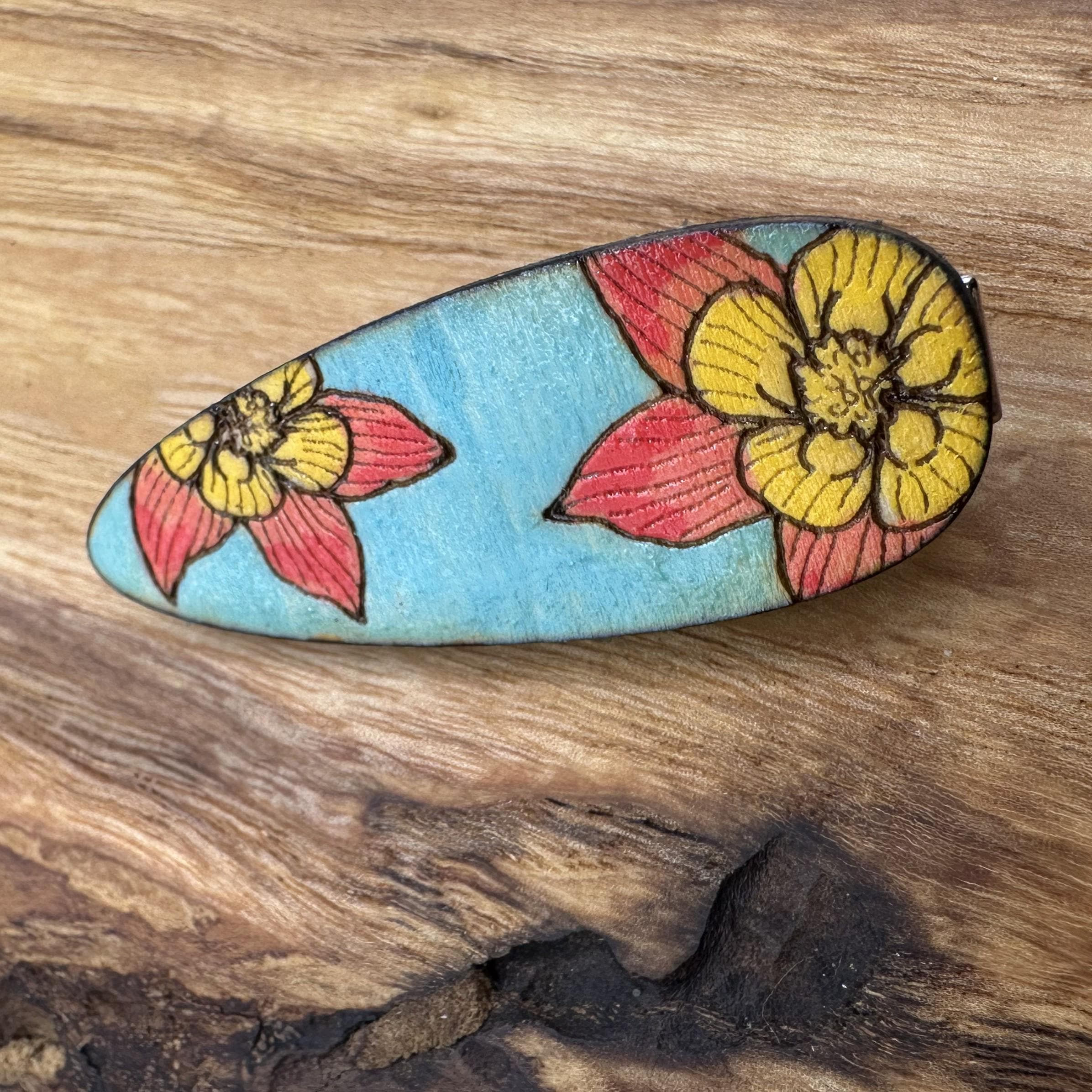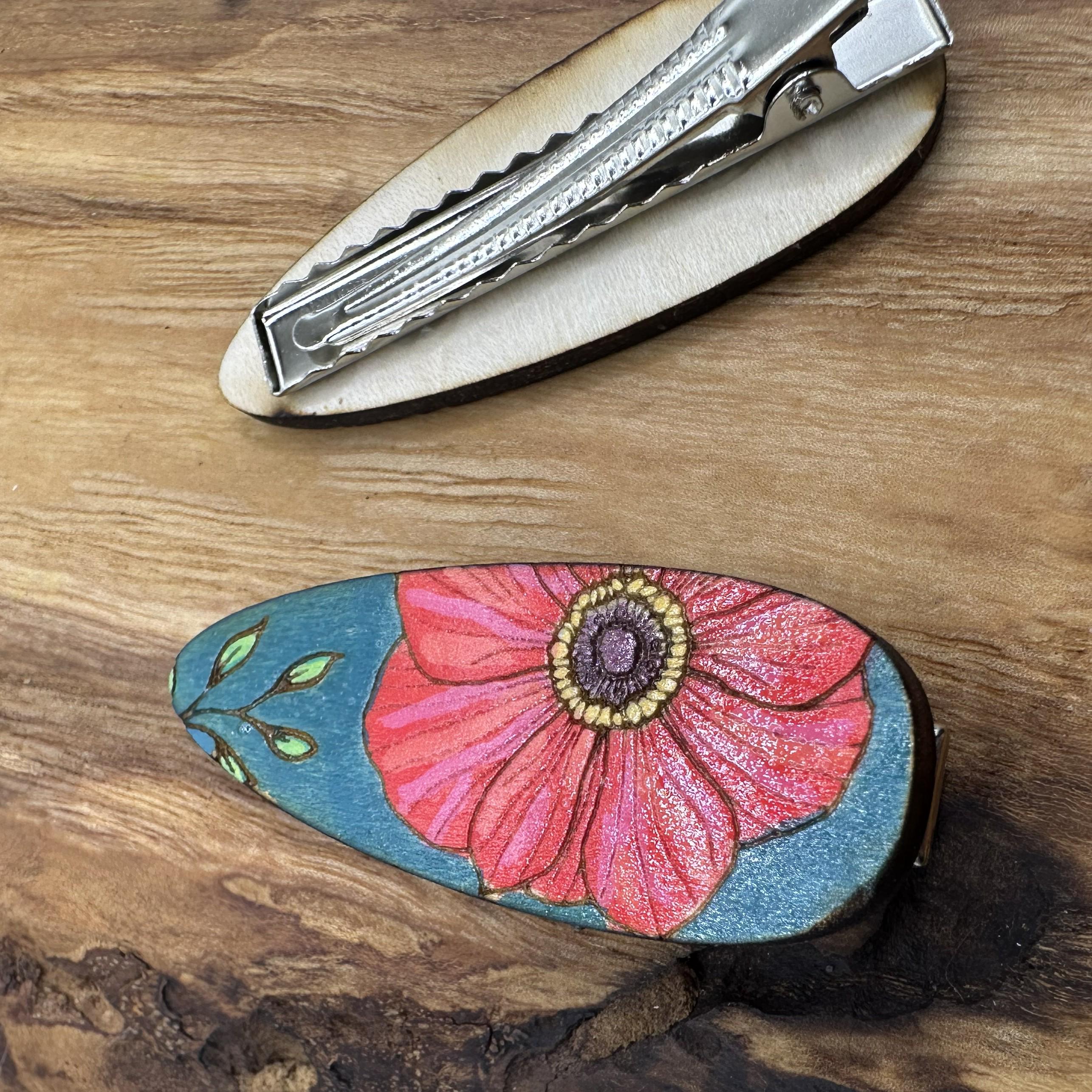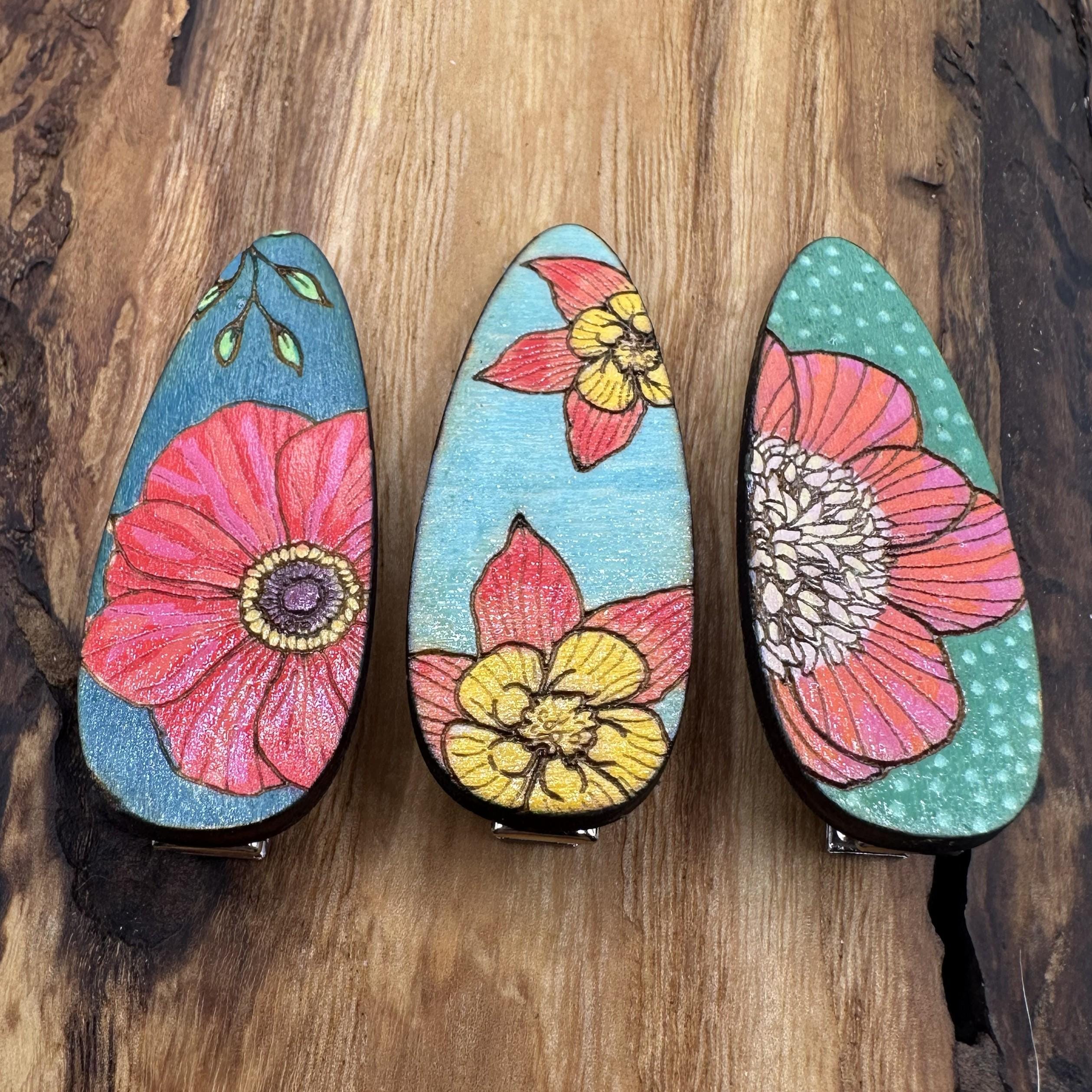 Get your hair out of your face with style with these hand painted, wood hair clips. Each piece starts out with an original drawing that’s laser cut/engraved from wood, and then hand painted.