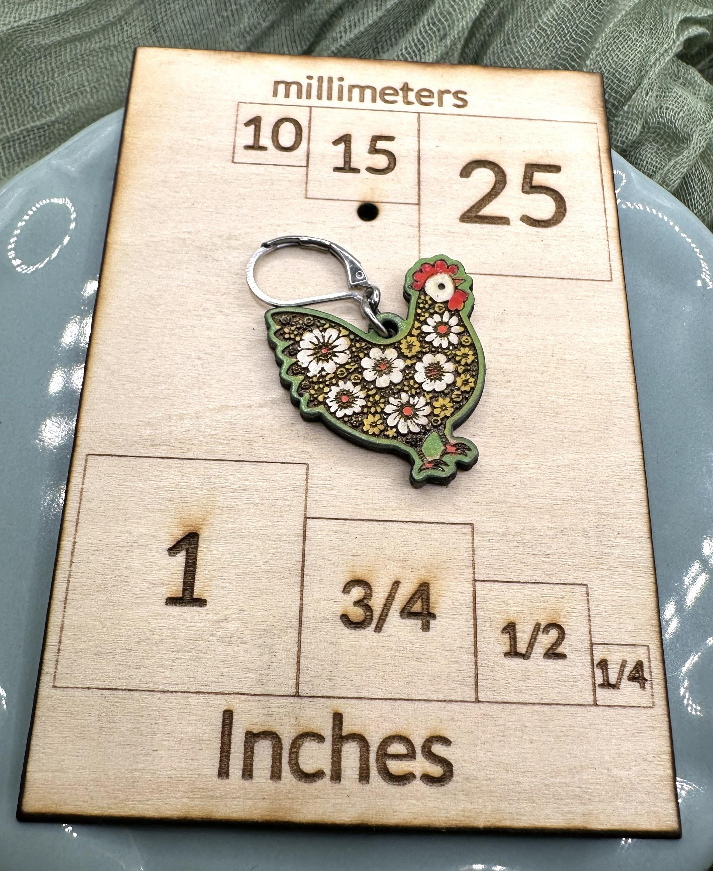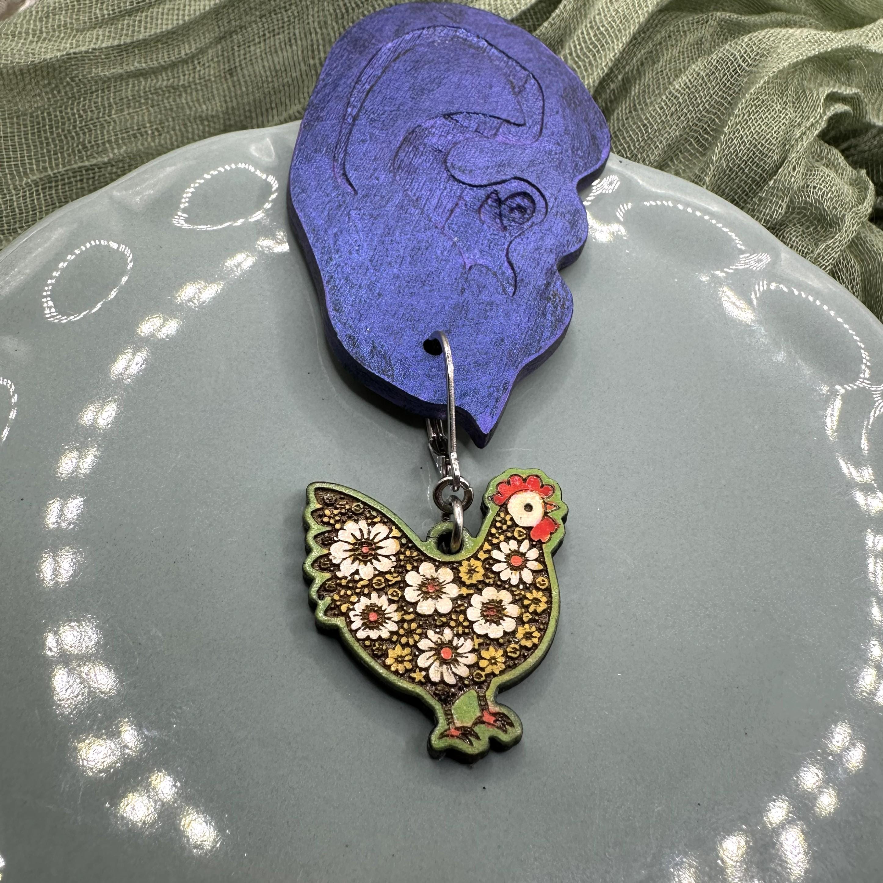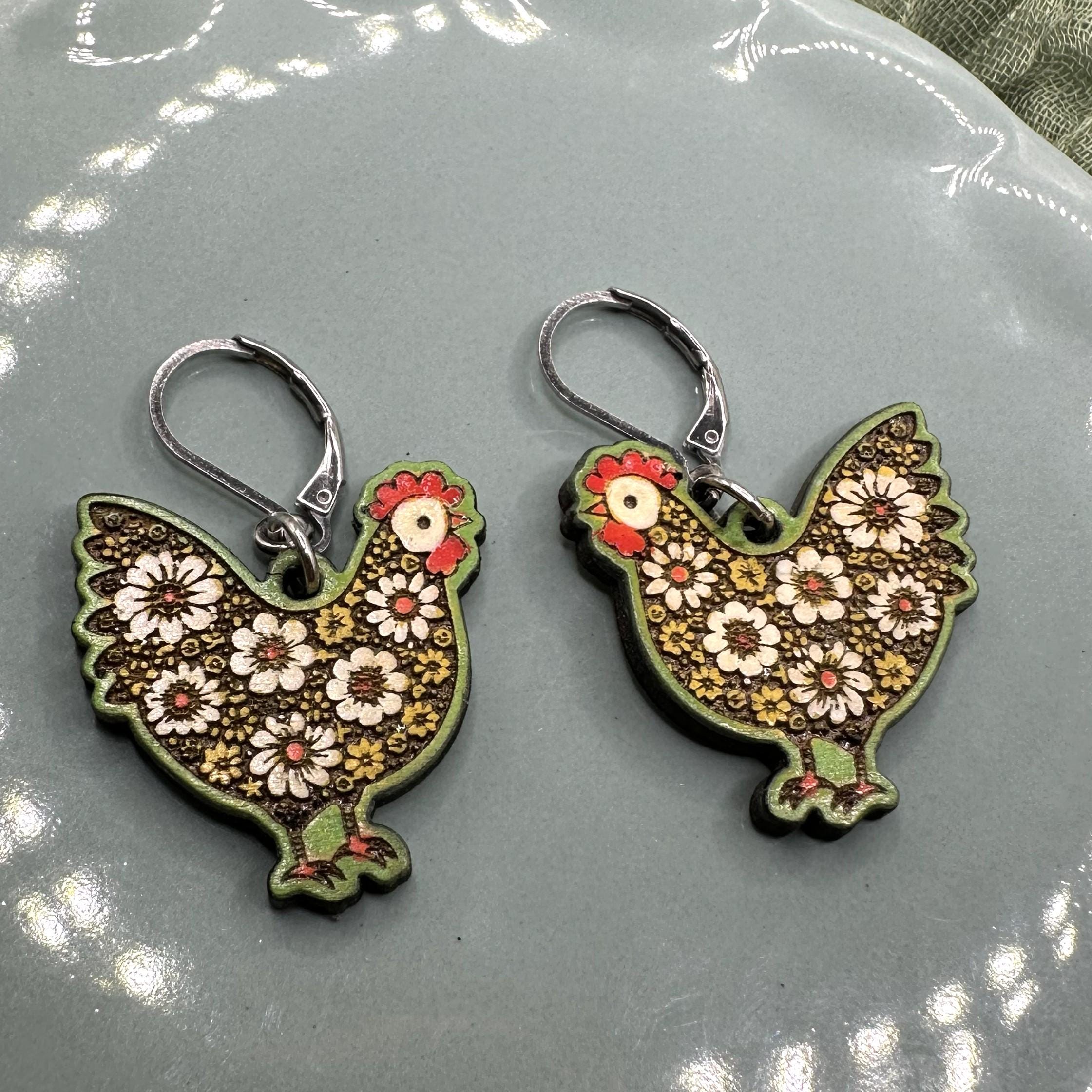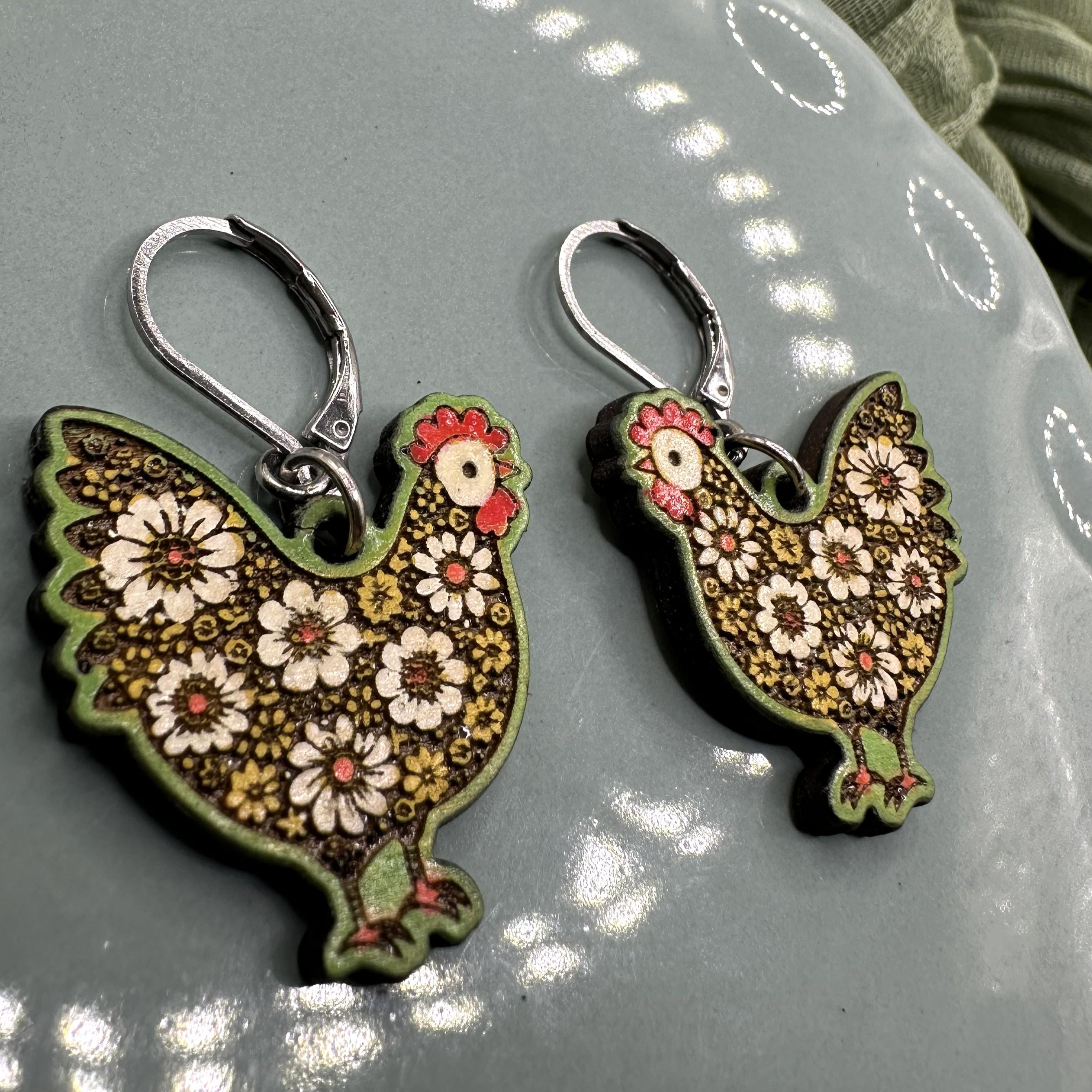 Cute floral chicken wood earrings. Laser cut and hand painted in spring colors. Posts are stainless steel leverbacks- nickel free. Come on a wood display card in an organza gift bag- gift ready!