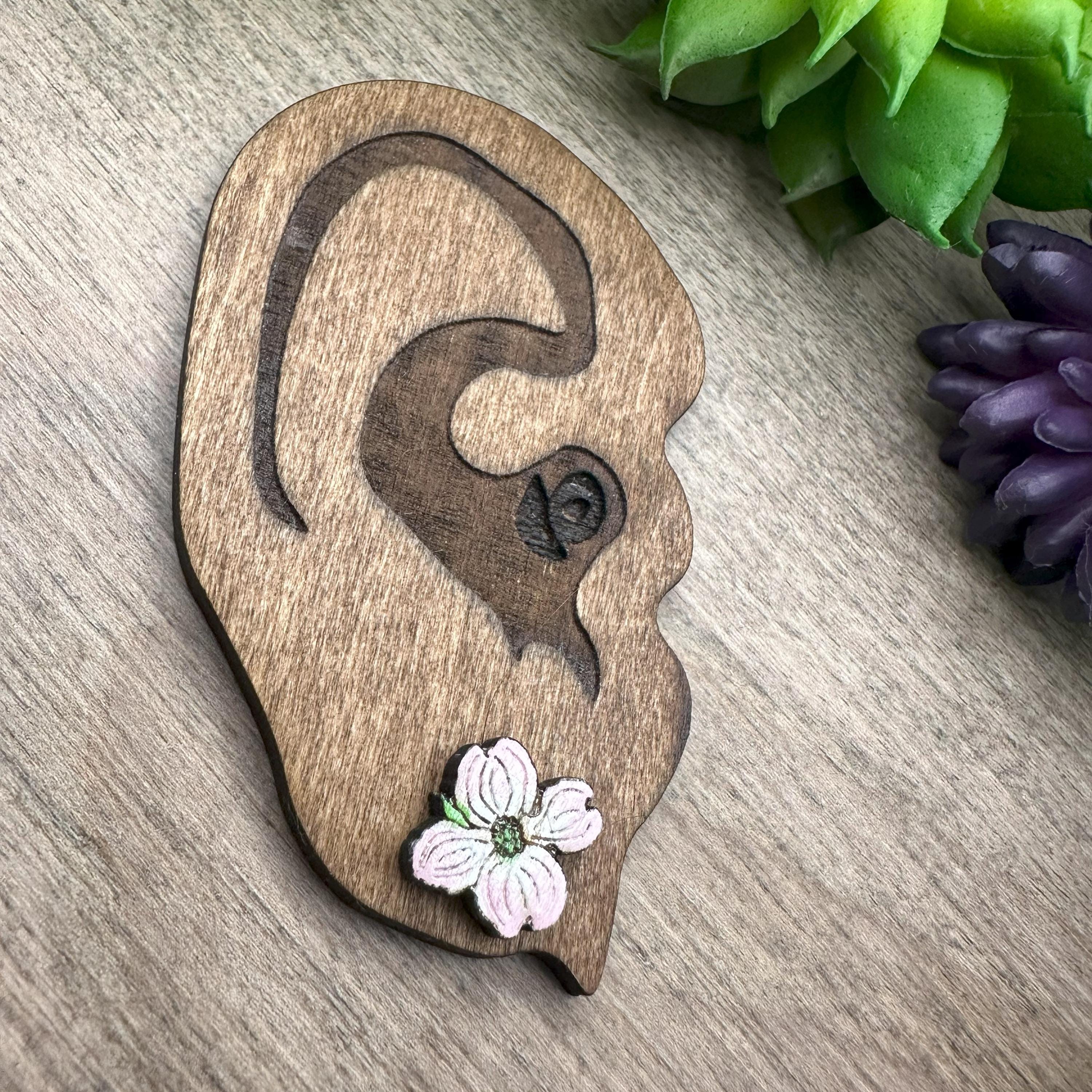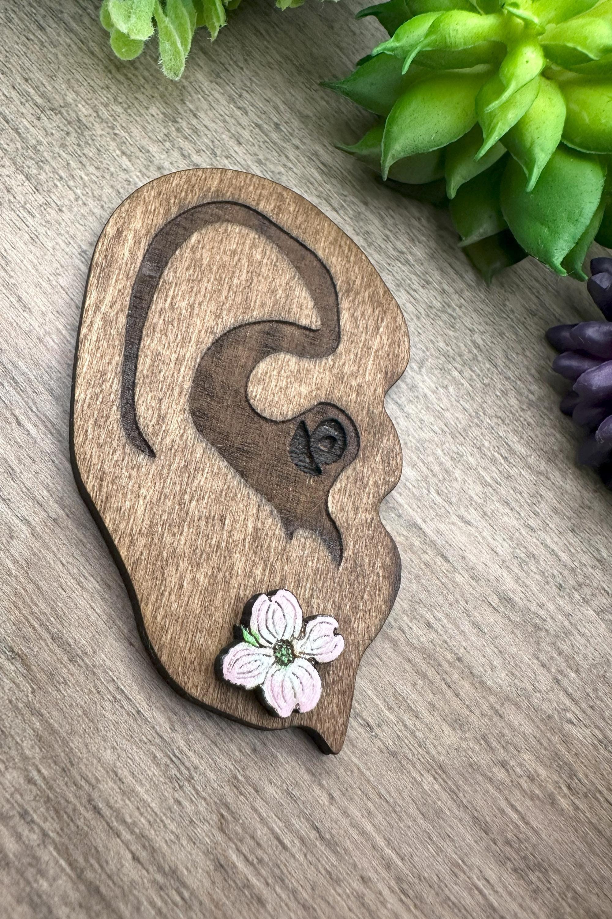 Inspired by the delicate beauty of spring blooms, these dogwood flower earrings capture the charm of nature with hand-drawn floral details and a soft pink wash that shimmers subtly in the light. Crafted from laser-cut 3mm basswood, each pair features botanical jewelry artistry that brings a fresh and elegant touch to your look. Perfect as wood stud earrings for those who appreciate small flower studs with a unique, hand-painted finish.